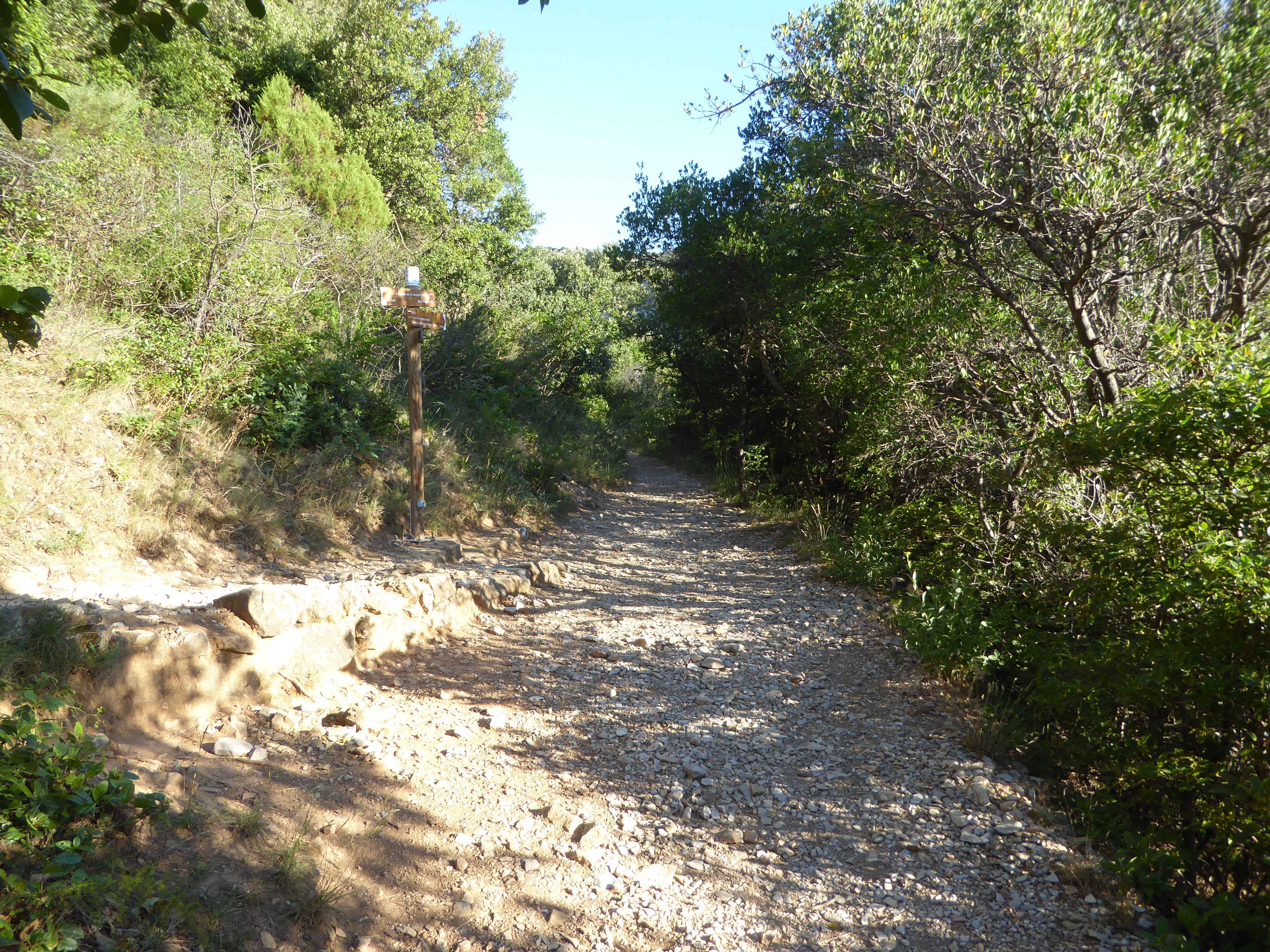 A ce croisement avec le chemin venant du Max Nègre, suivre le chemin partant tout droit direction Saint-Guilhem-le-Désert, balisé en rouge et blanc