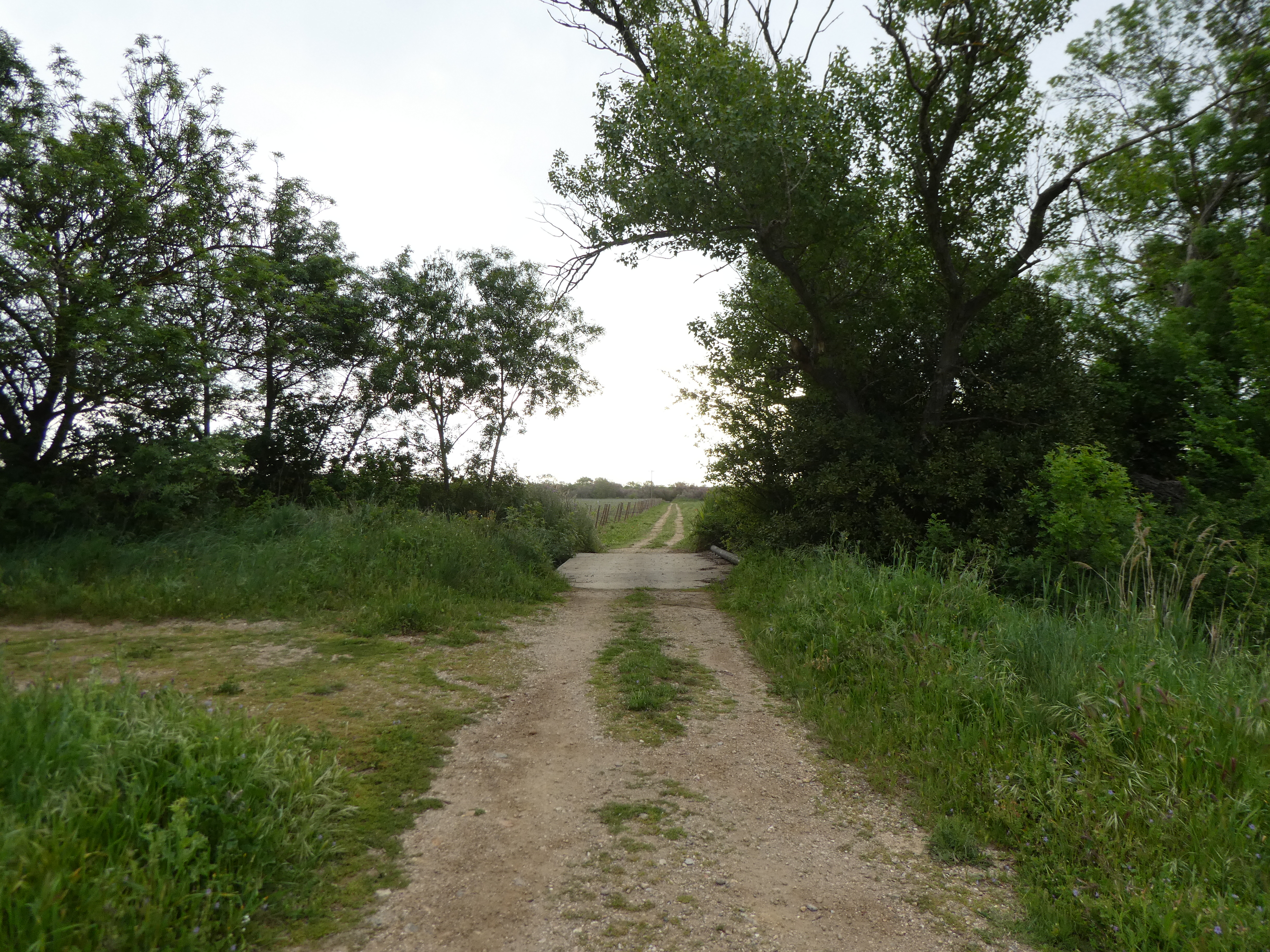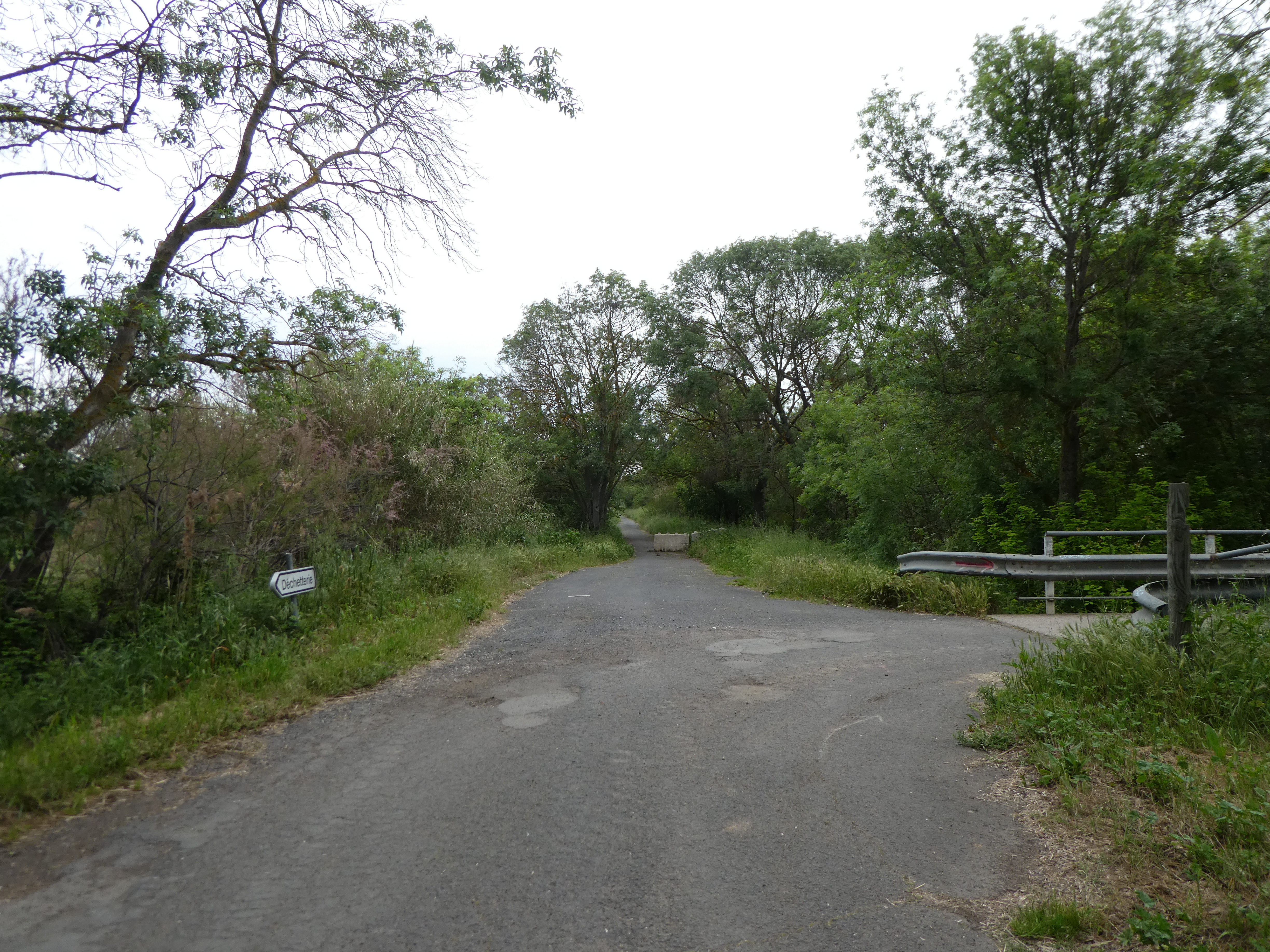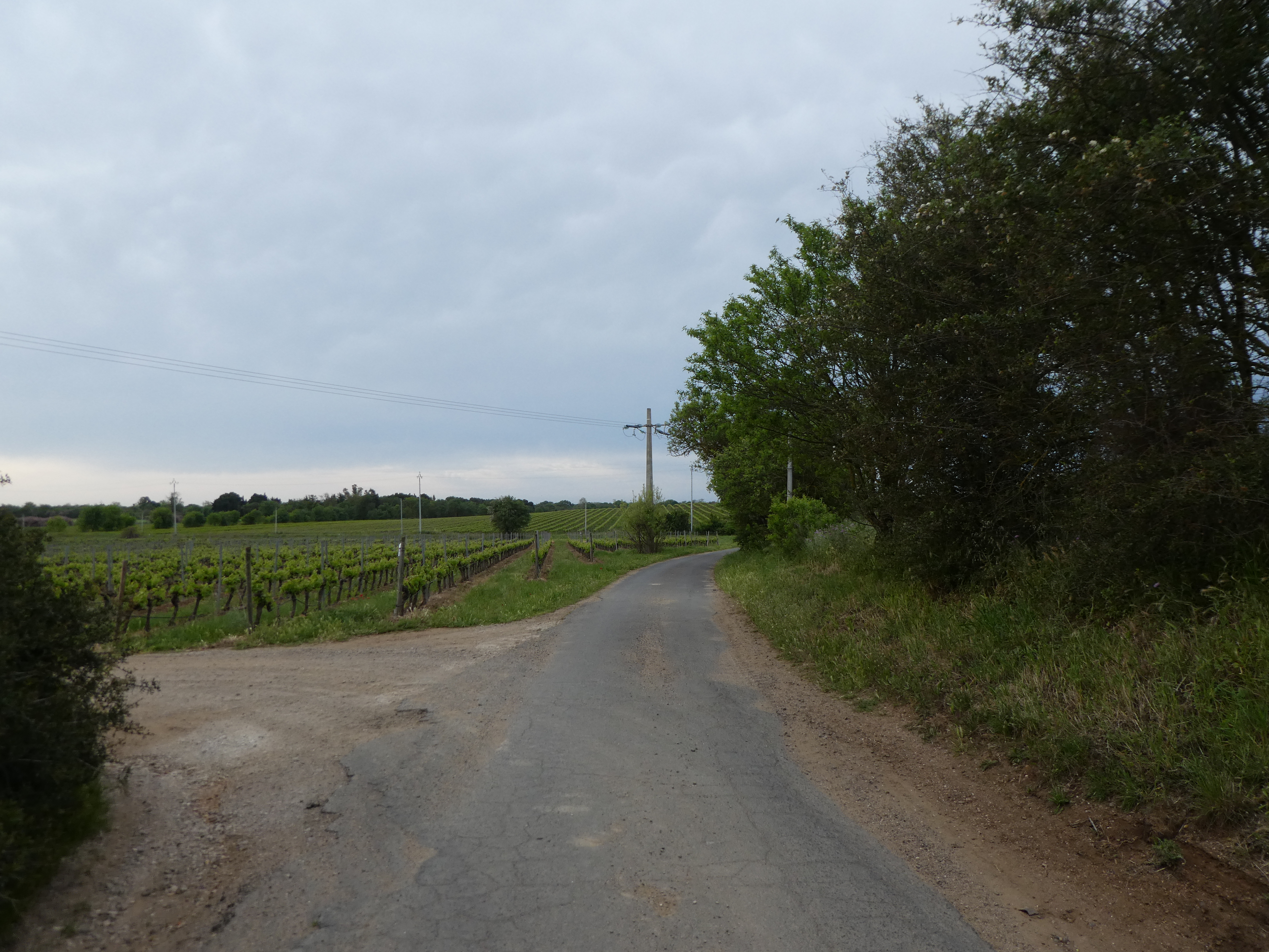 A ce croisement situé à la fin du Camping de la Dragonnière (1200 mètres après la précédente intersection), suivre le chemin partant tout droit direction Domaine de Médeilhan