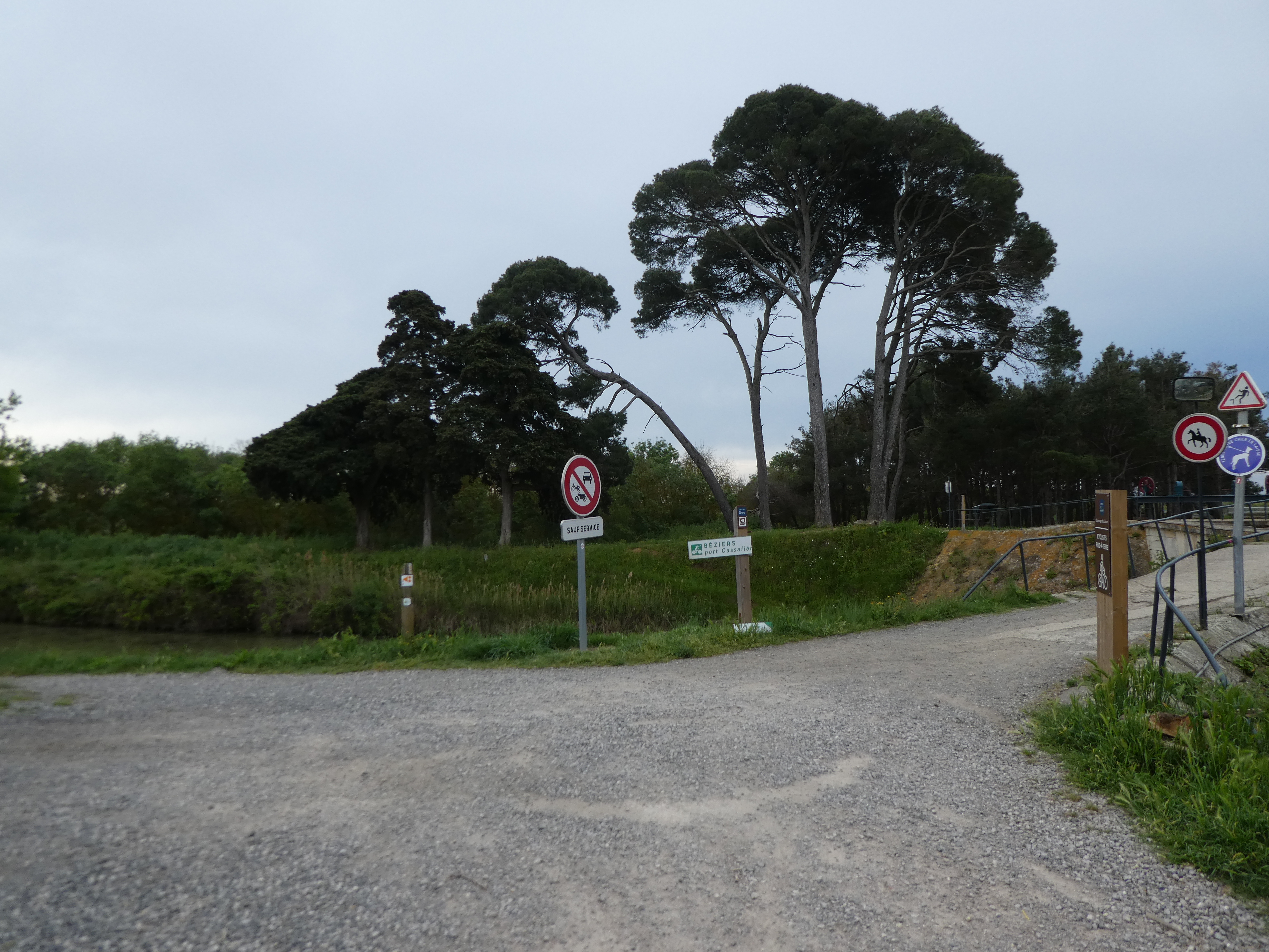 A ce croisement situé à la fin des Ouvrages du Libron marqué par la présence d'un panneau directionnel (50 mètres après le précédent), suivre la Voie Verte du Canal du Midi partant tout droit direction Port Cassafières, balisé en balises VTT n°21
