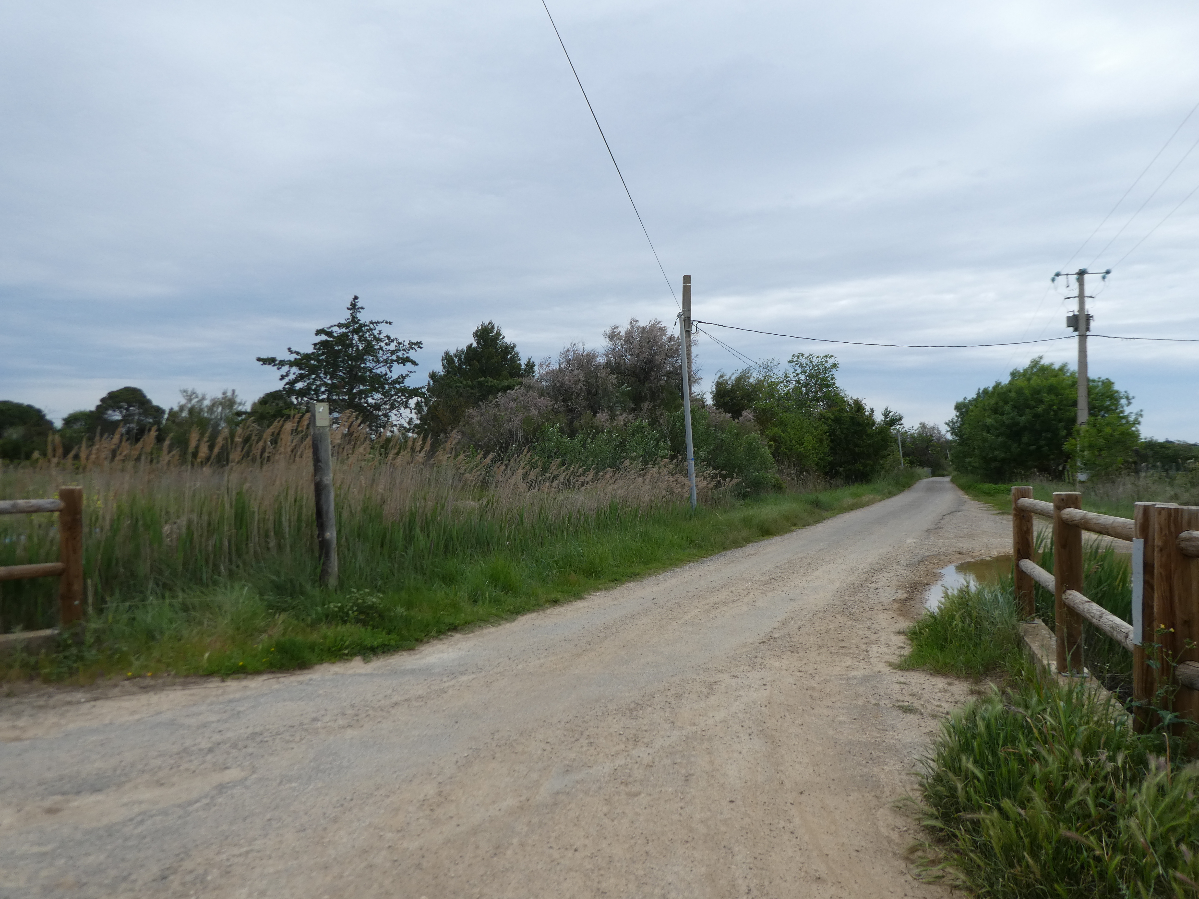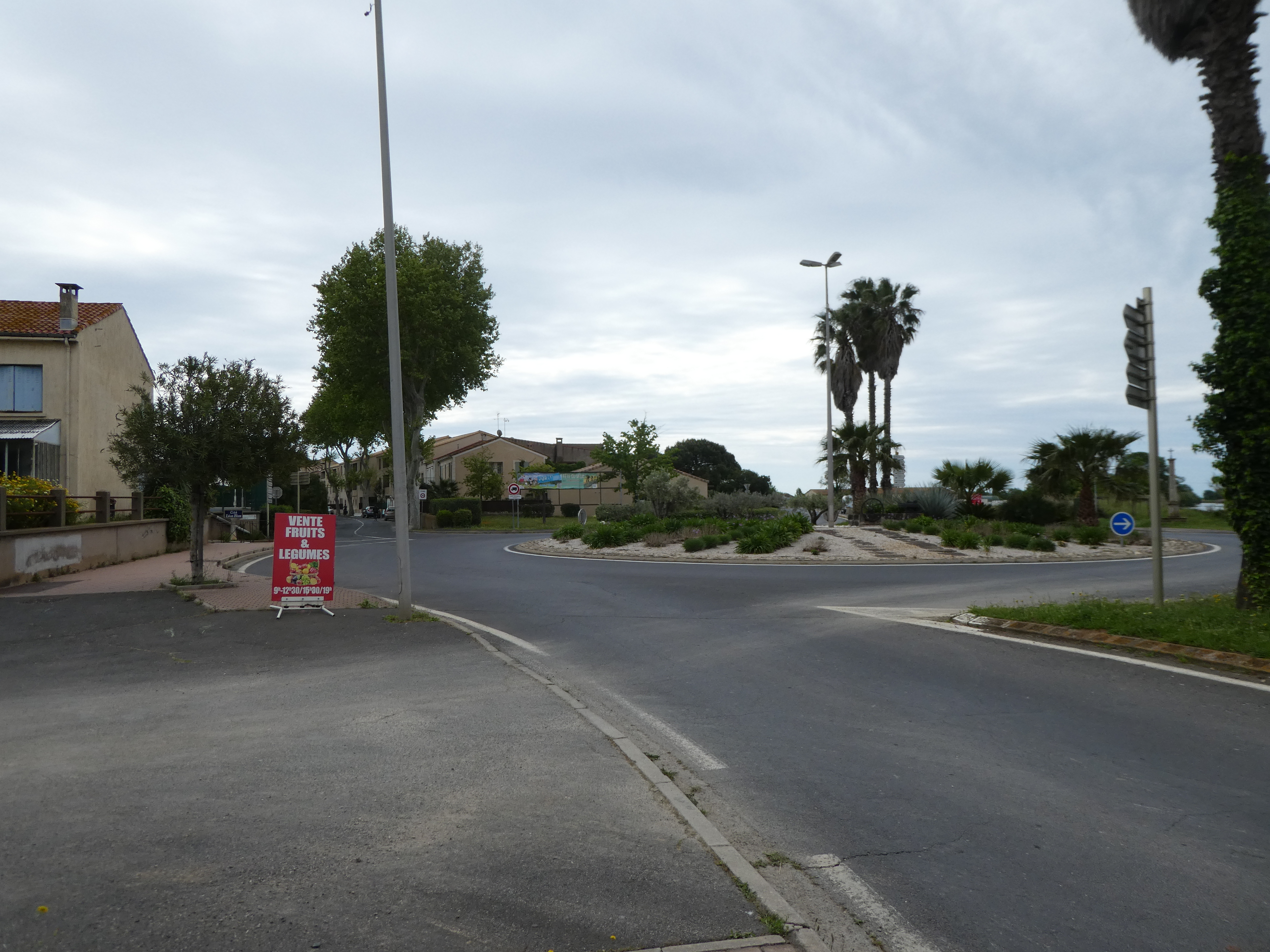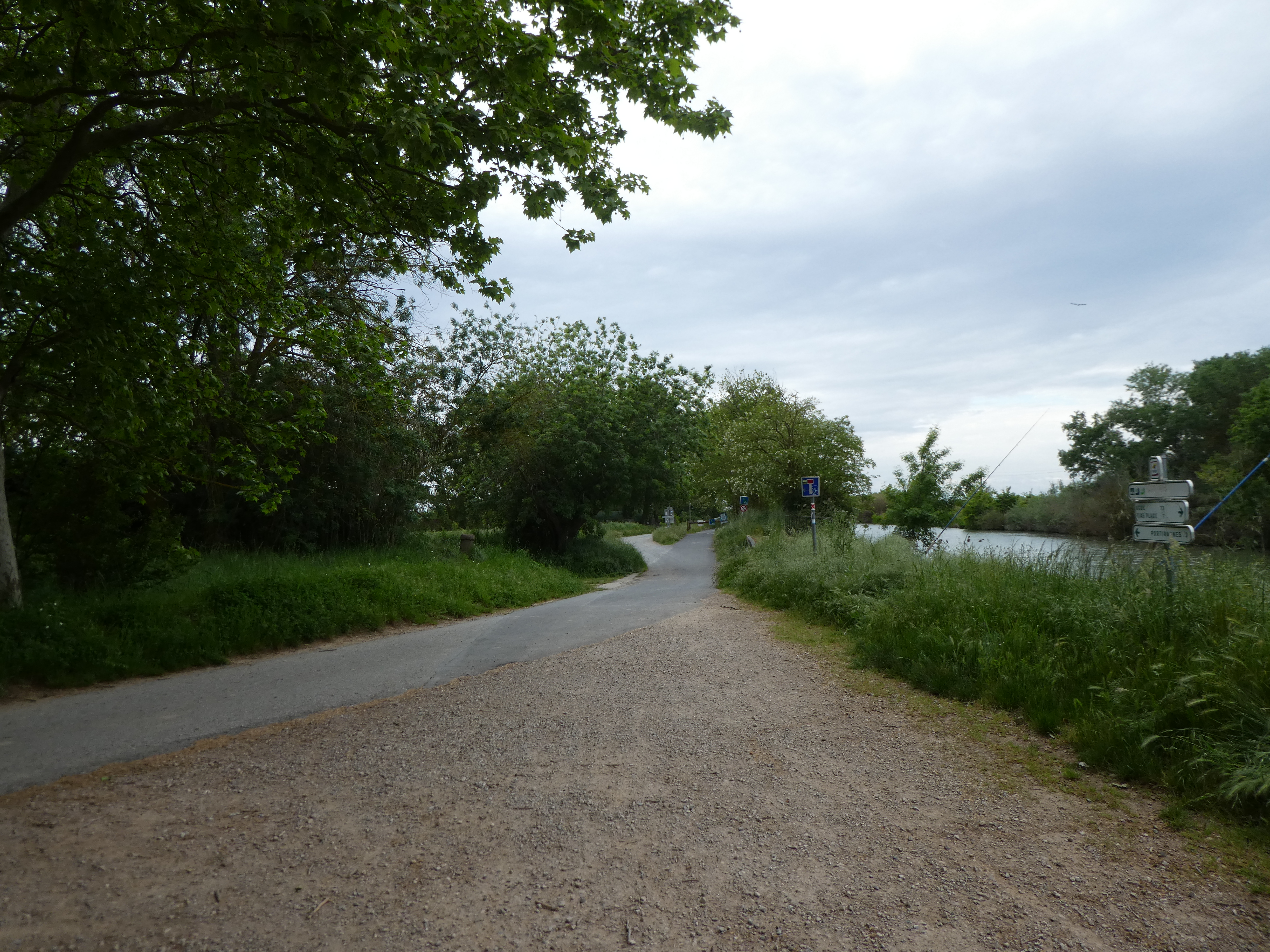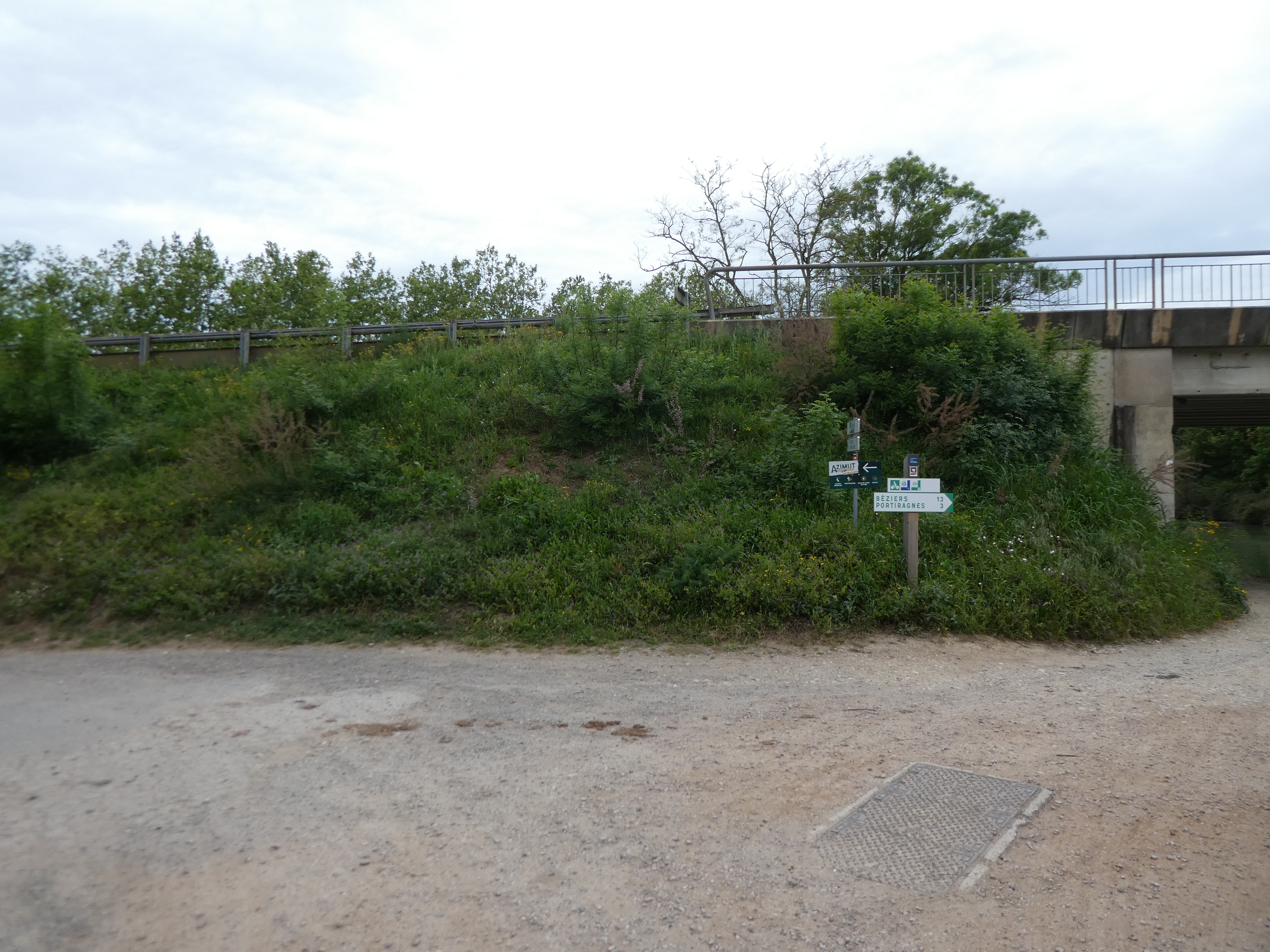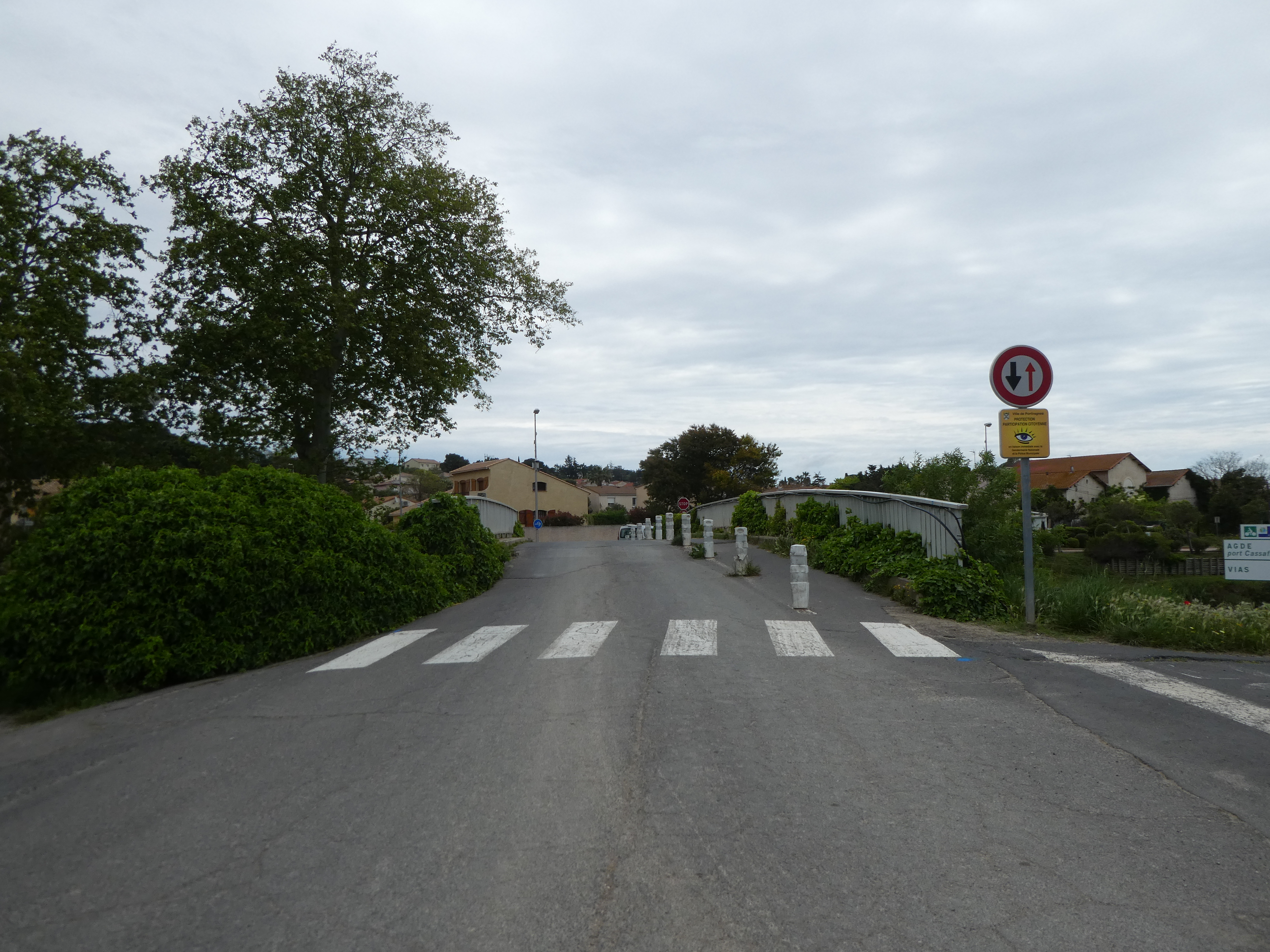 A cette intersection avec un pont enjambant le Canal du Midi marqué par la présence d'un panneau directionnel (950 mètres après le précédent croisement mentionné), suivre la route partant tout droit et empruntant ce pont direction Portiragnes - Mairie, aucun balisage dorénavant