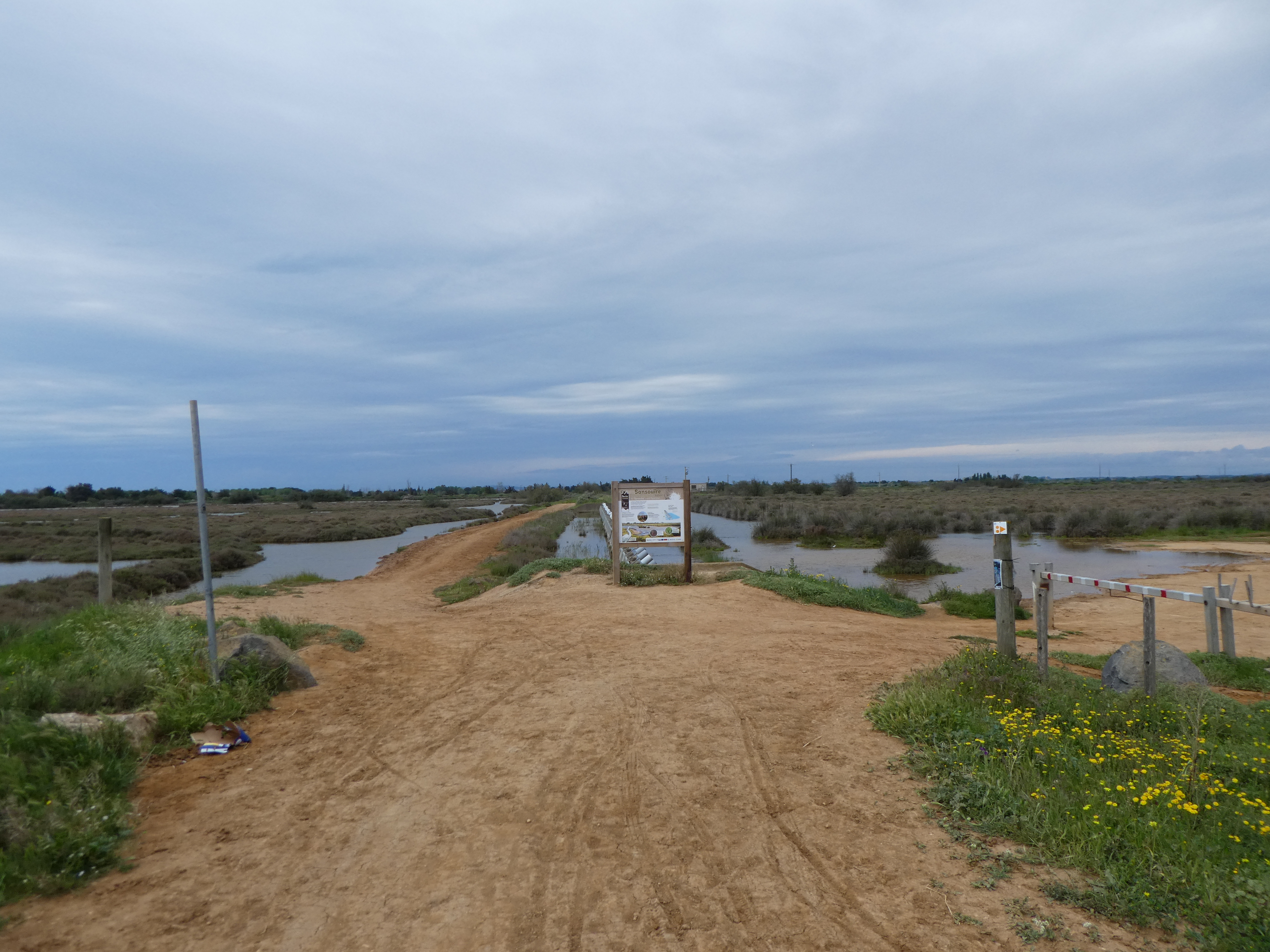 A ce croisement avec l'itinéraire balisé du Grand Salan du Sansouïre (50 mètres après le précédent rond- point), suivre ce dernier partant sur la gauche direction Grand Salan du Sansouïre, balisé sporadiquement en rouge, et en balises VTT n°21 dorénavant
