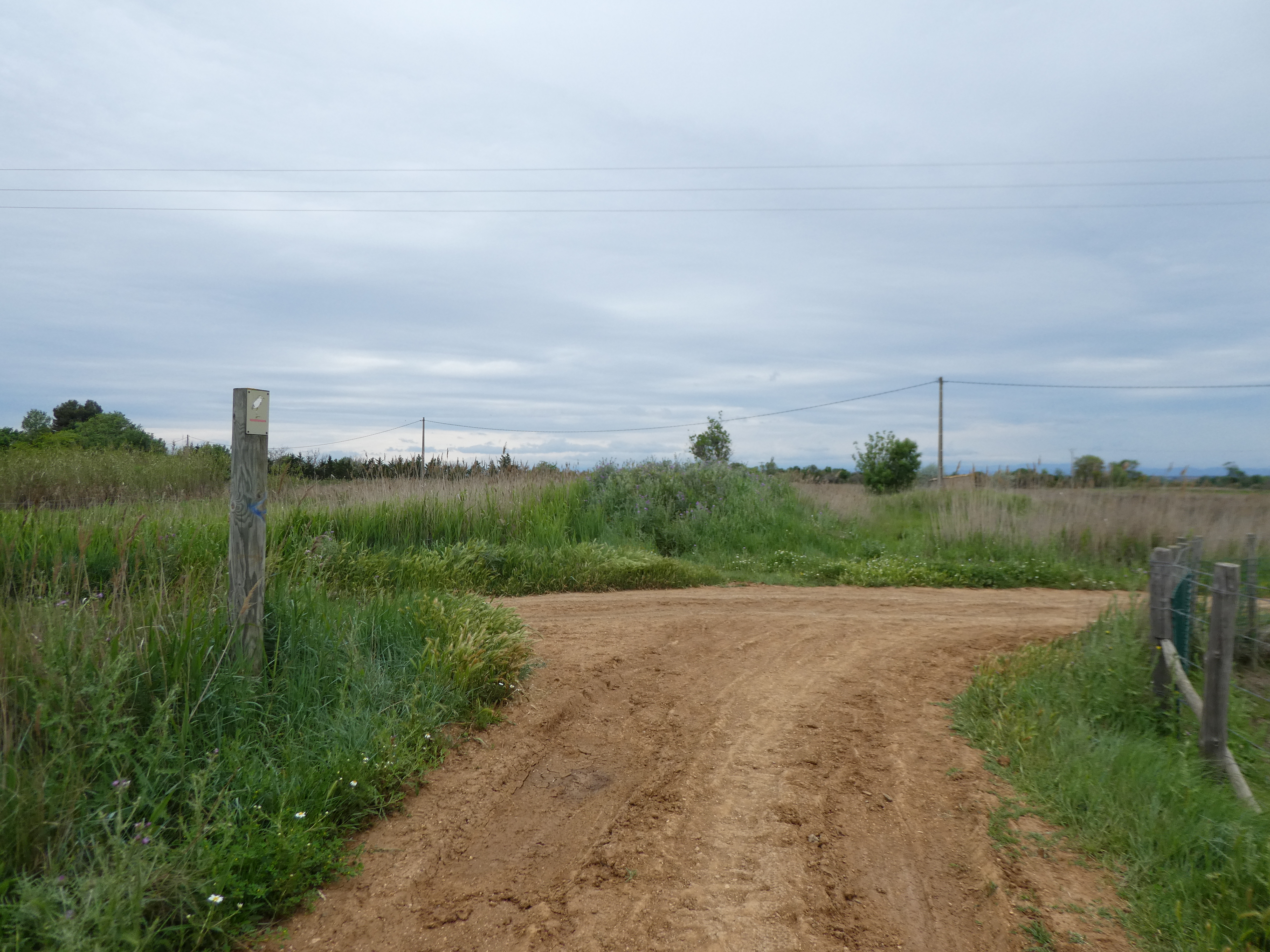 A ce croisement où le sentier quitte les berges de la Grande Maïre (2400 mètres après le précédent), suivre le chemin partant sur la droite direction Portiragnes, balisé sporadiquement en rouge