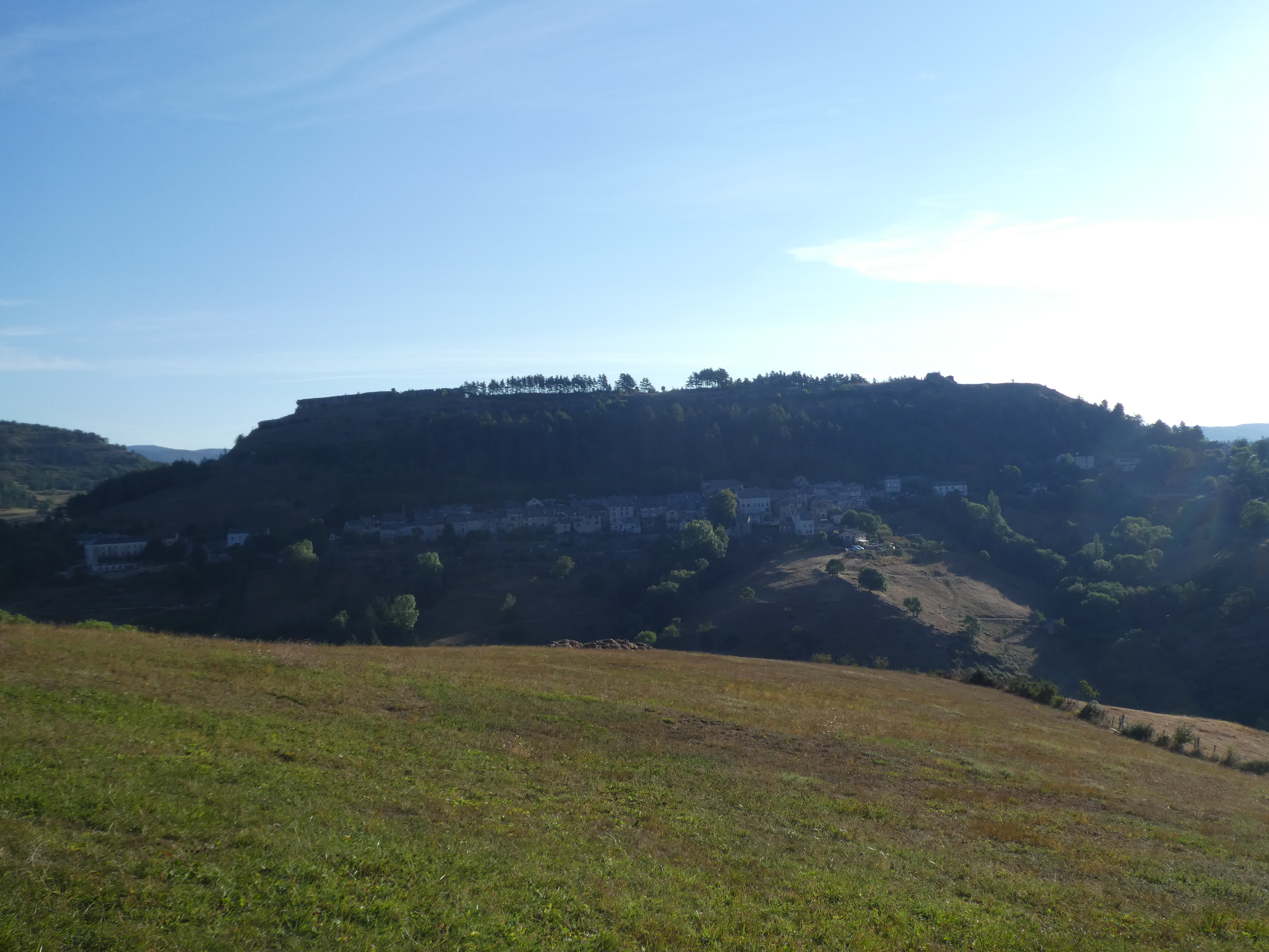 Vue à contre-jour sur le village de Barre-des-Cévennes et l'oppidum du Castelas le dominant