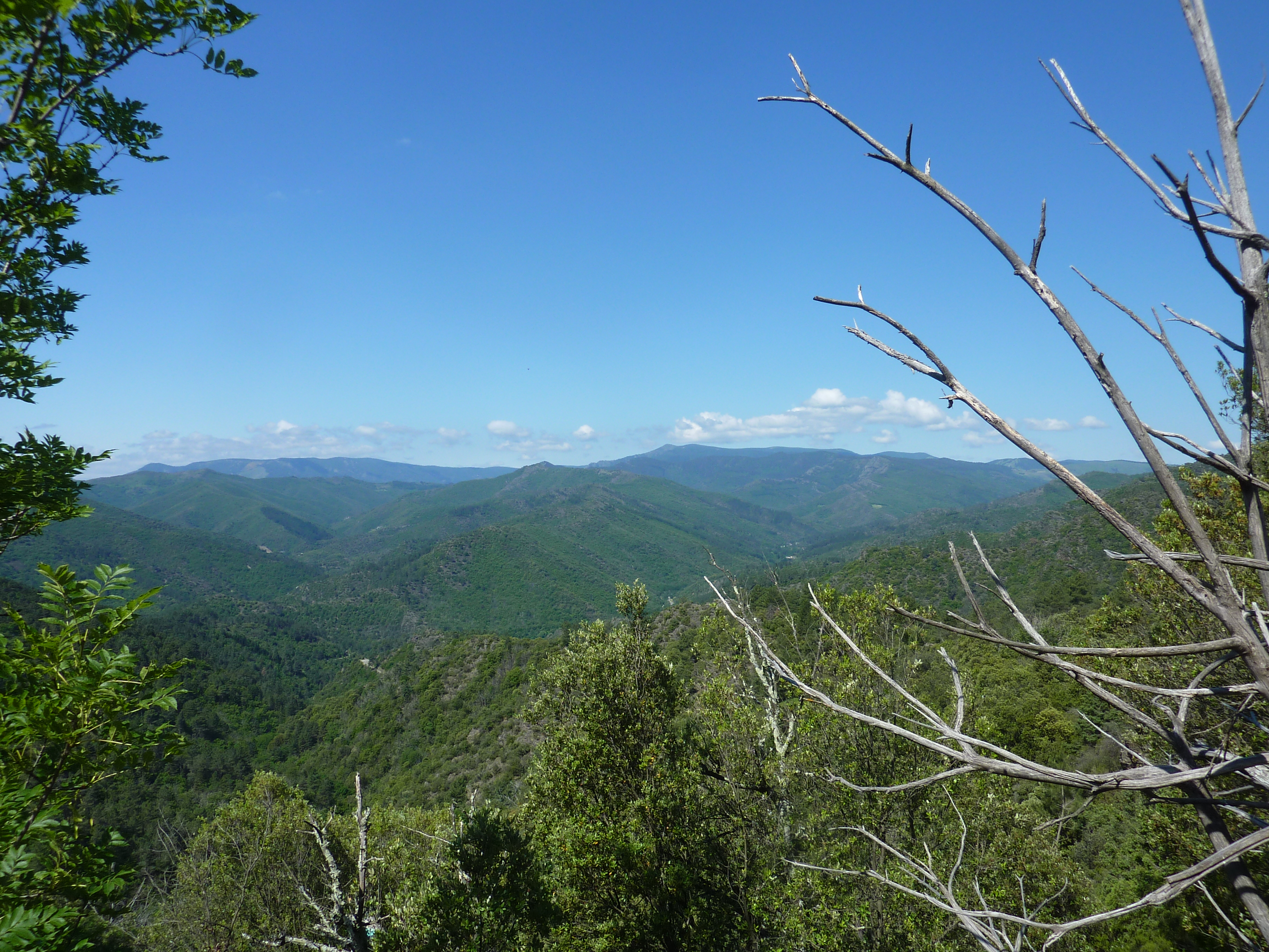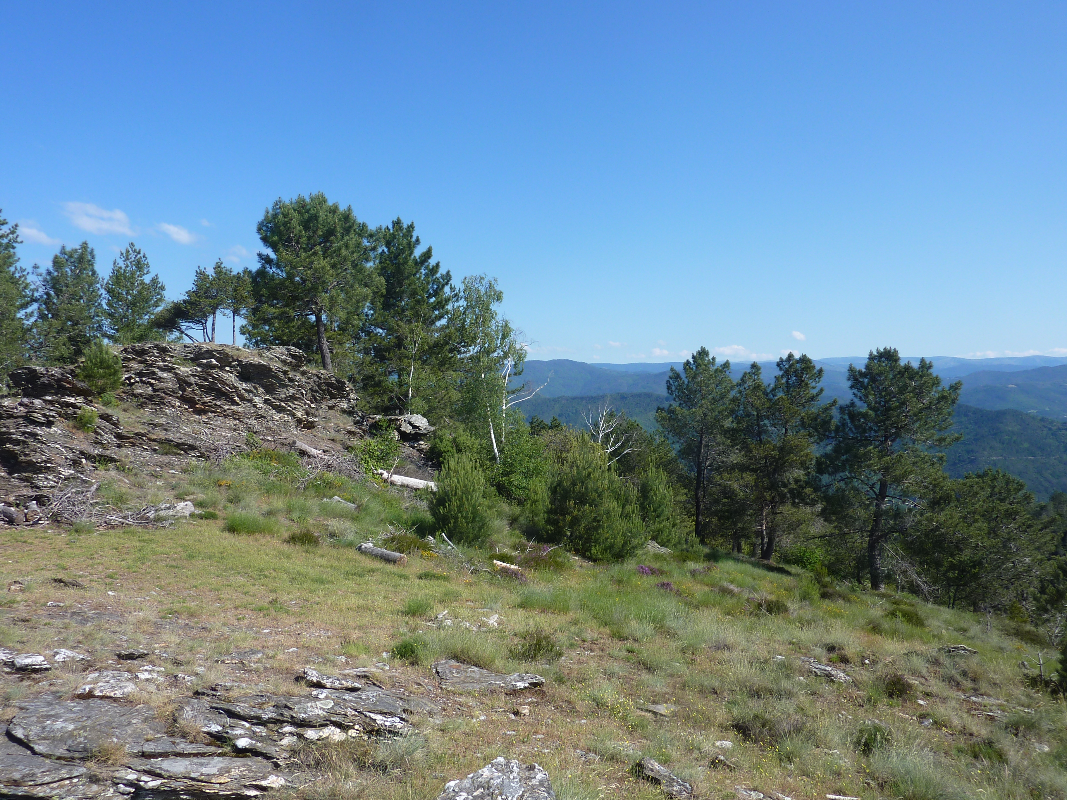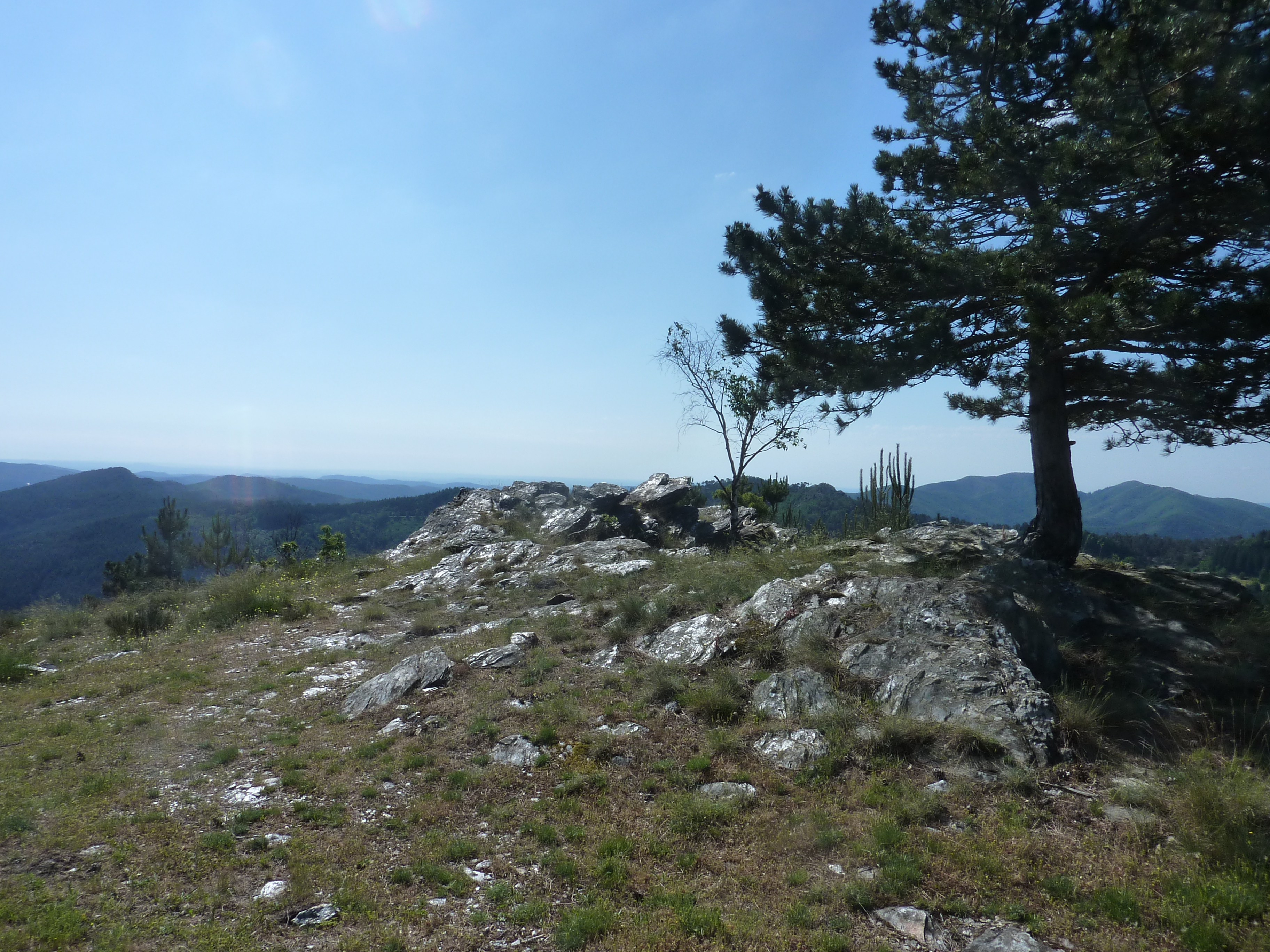 Arrivée au sommet du Tourel (768 m) : beau panorama sur les Cévennes lozériennes et gardoises ... la vue vers le massif de l'Aigoual est masquée par la végétation sommitale