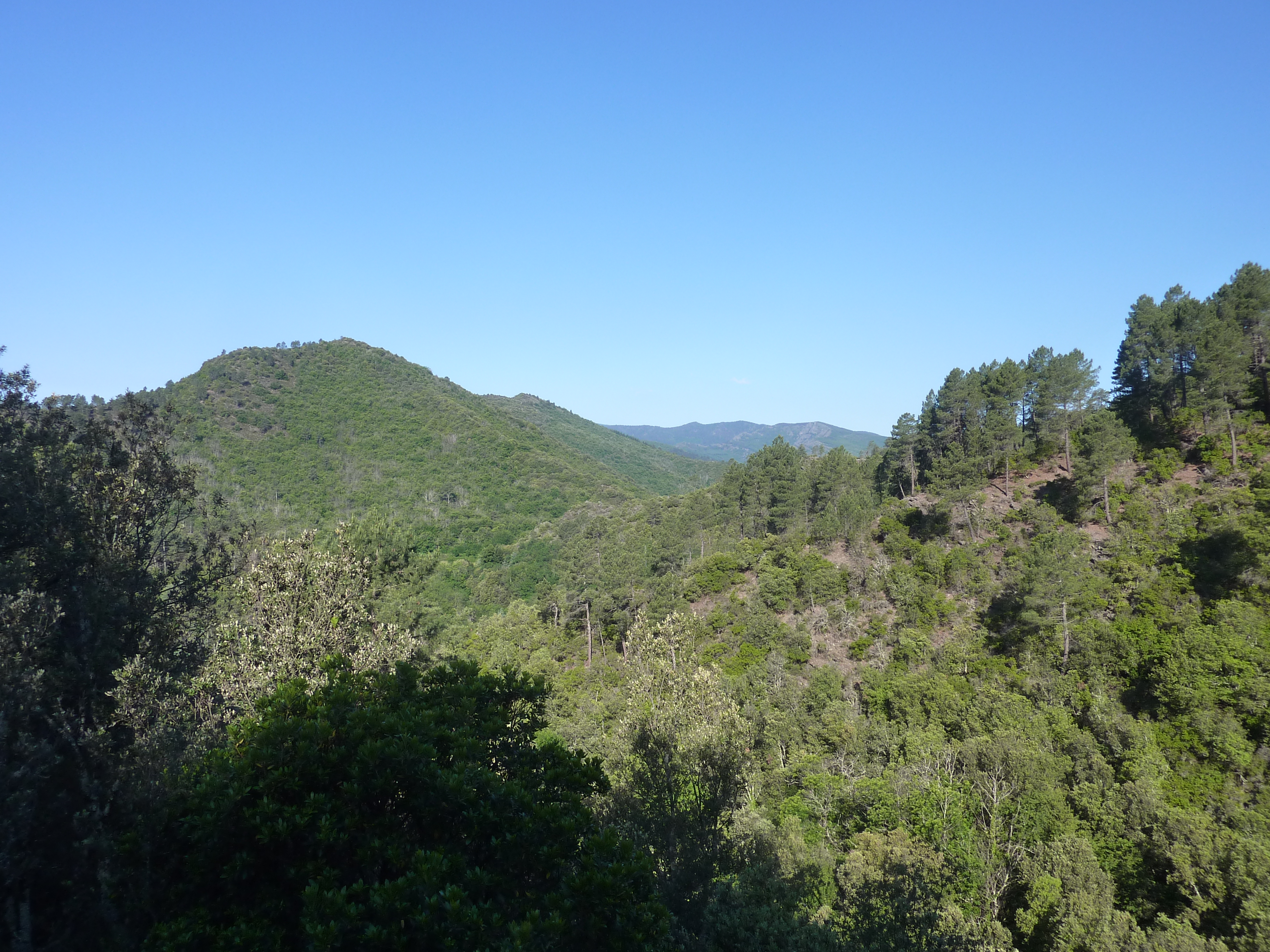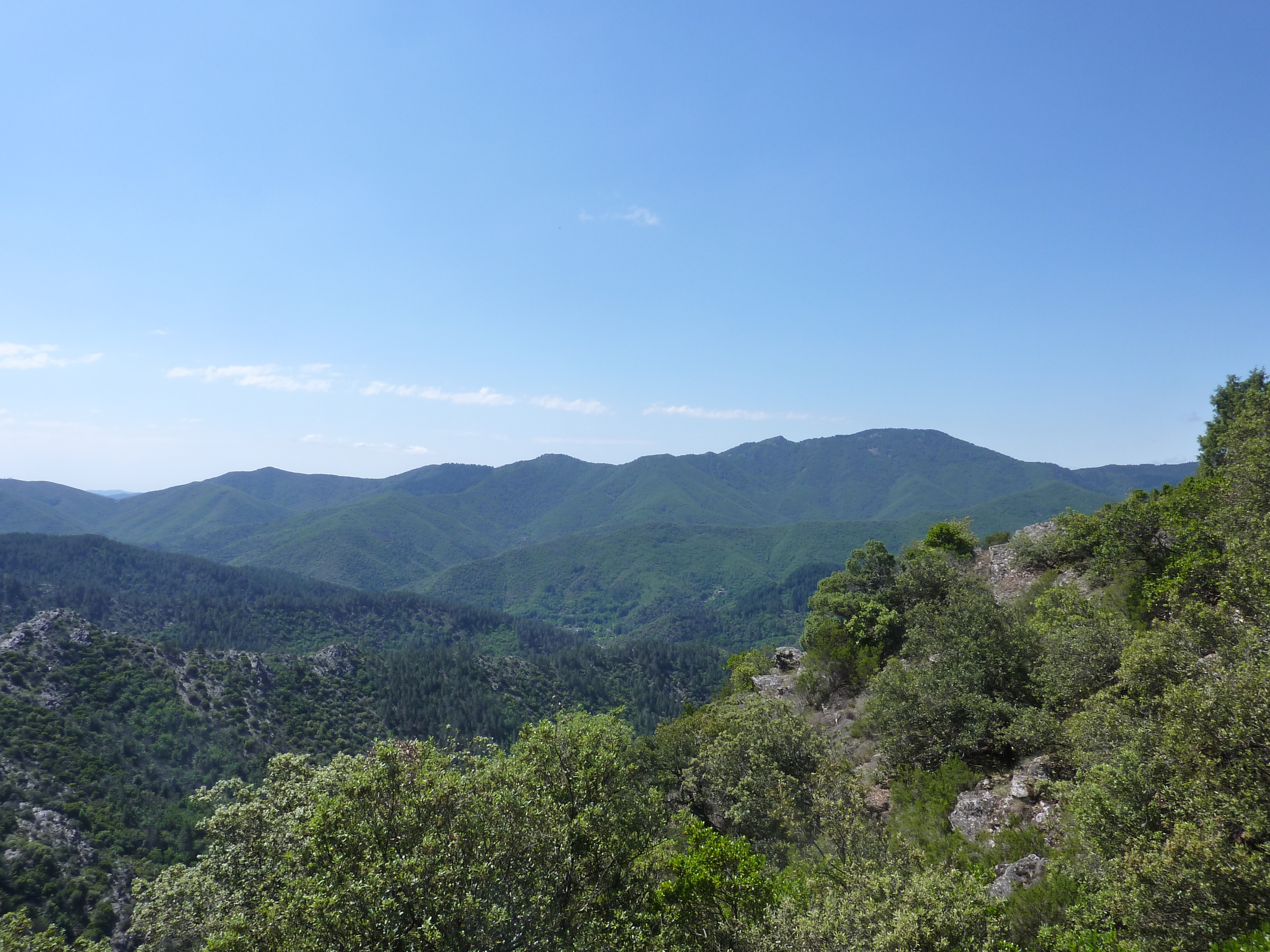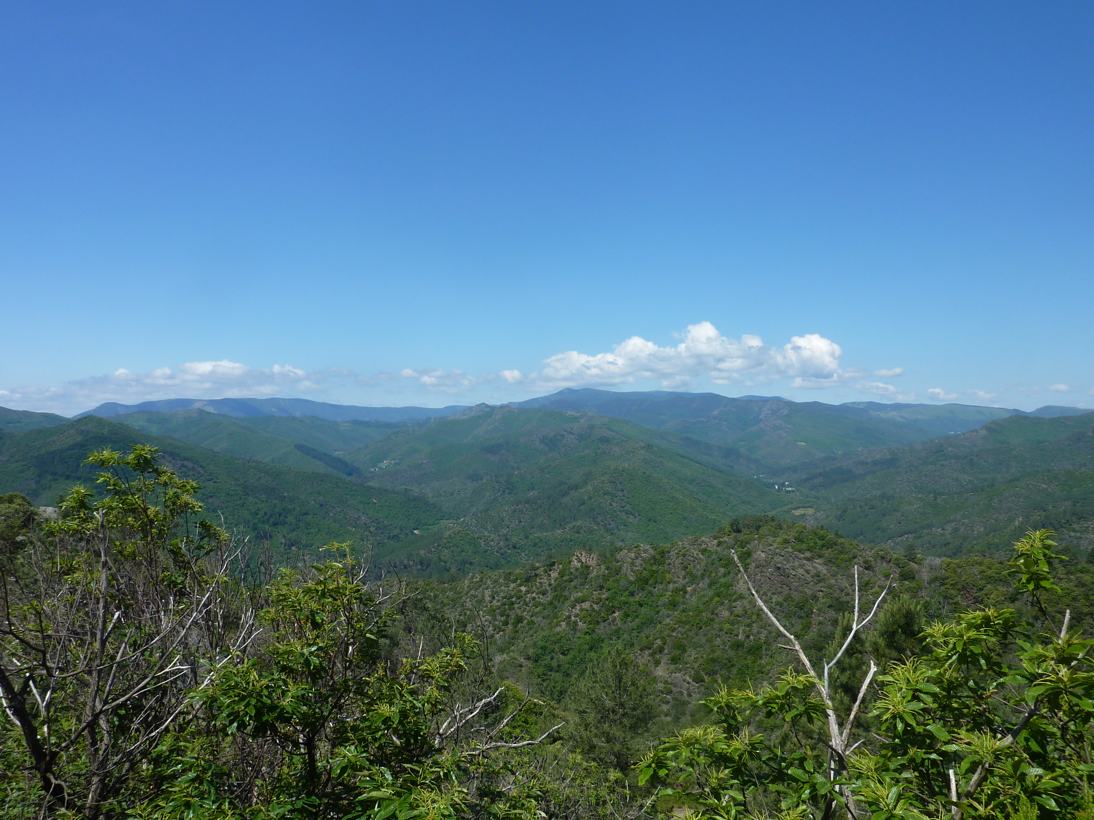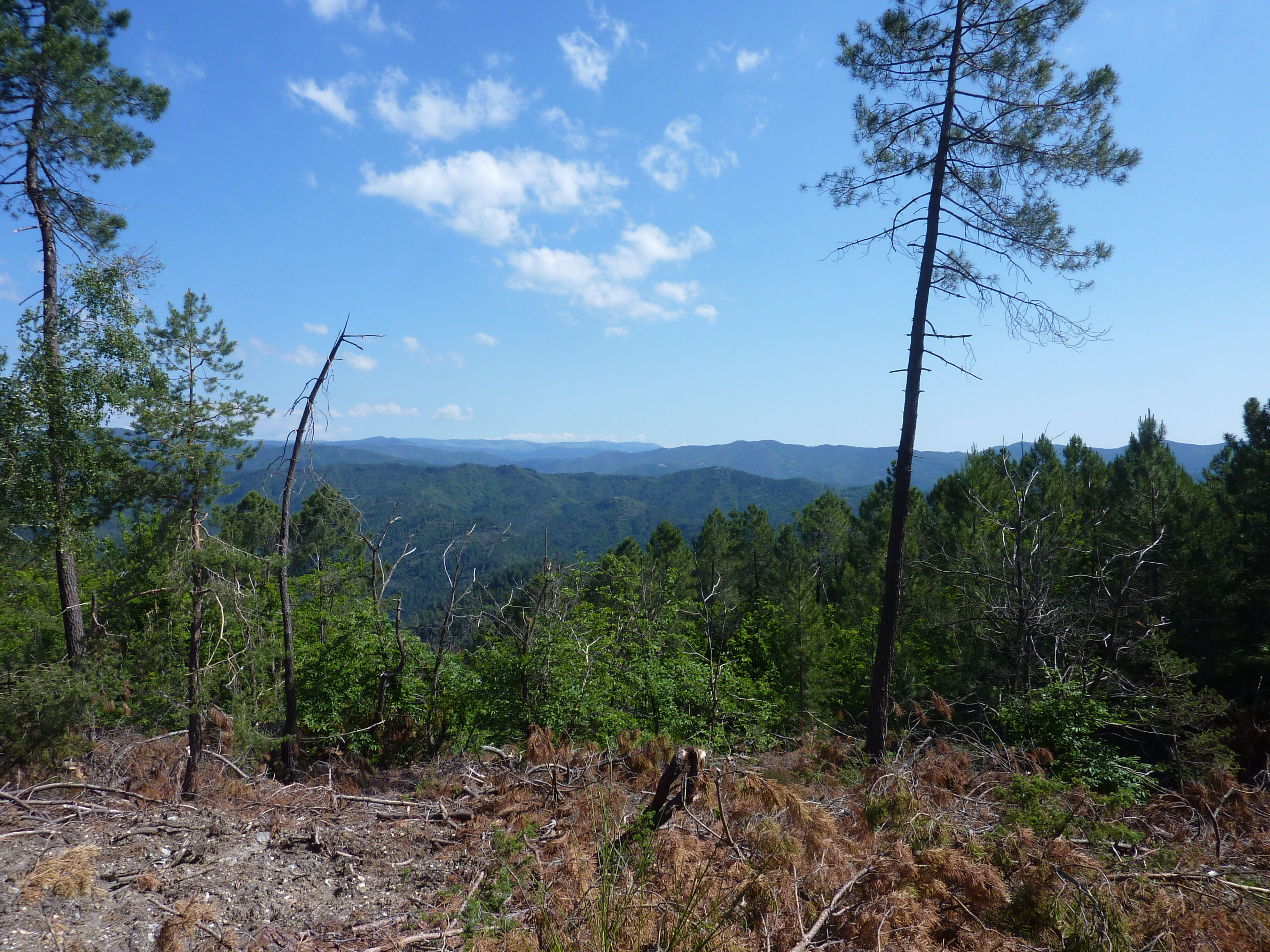 Arrivée au sommet du Tourel (768 m) : beau panorama sur les Cévennes lozériennes et gardoises ... la vue vers le massif de l'Aigoual est masquée par la végétation sommitale