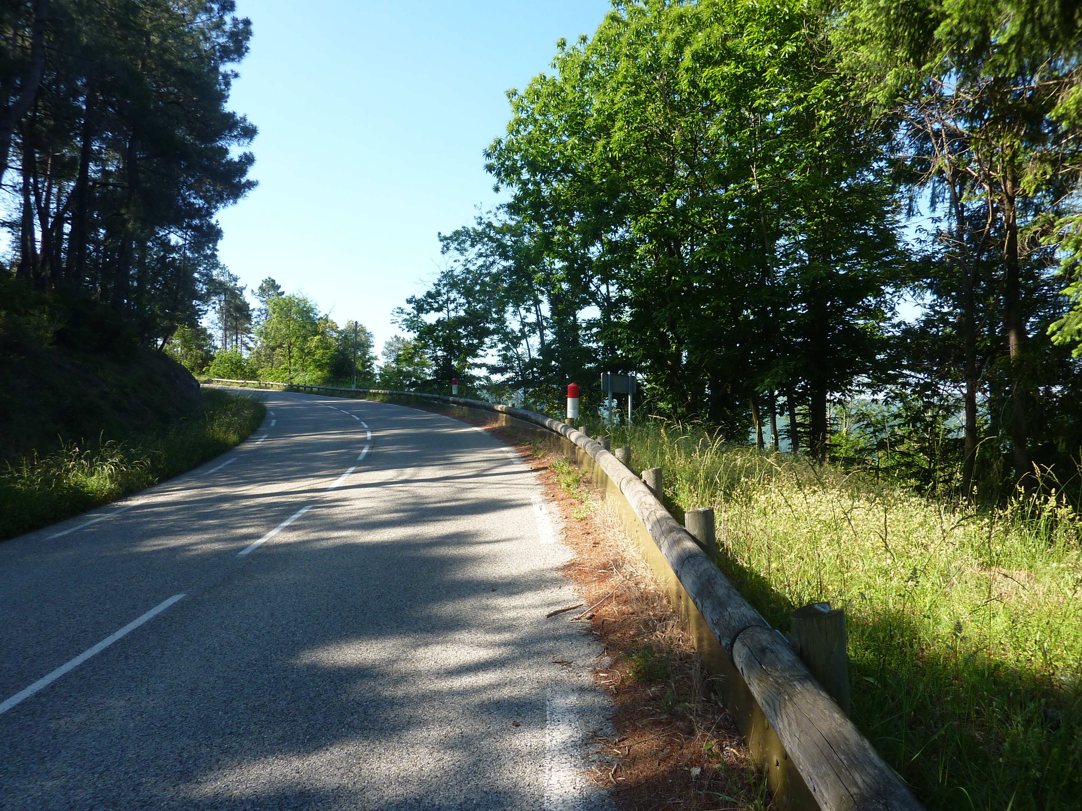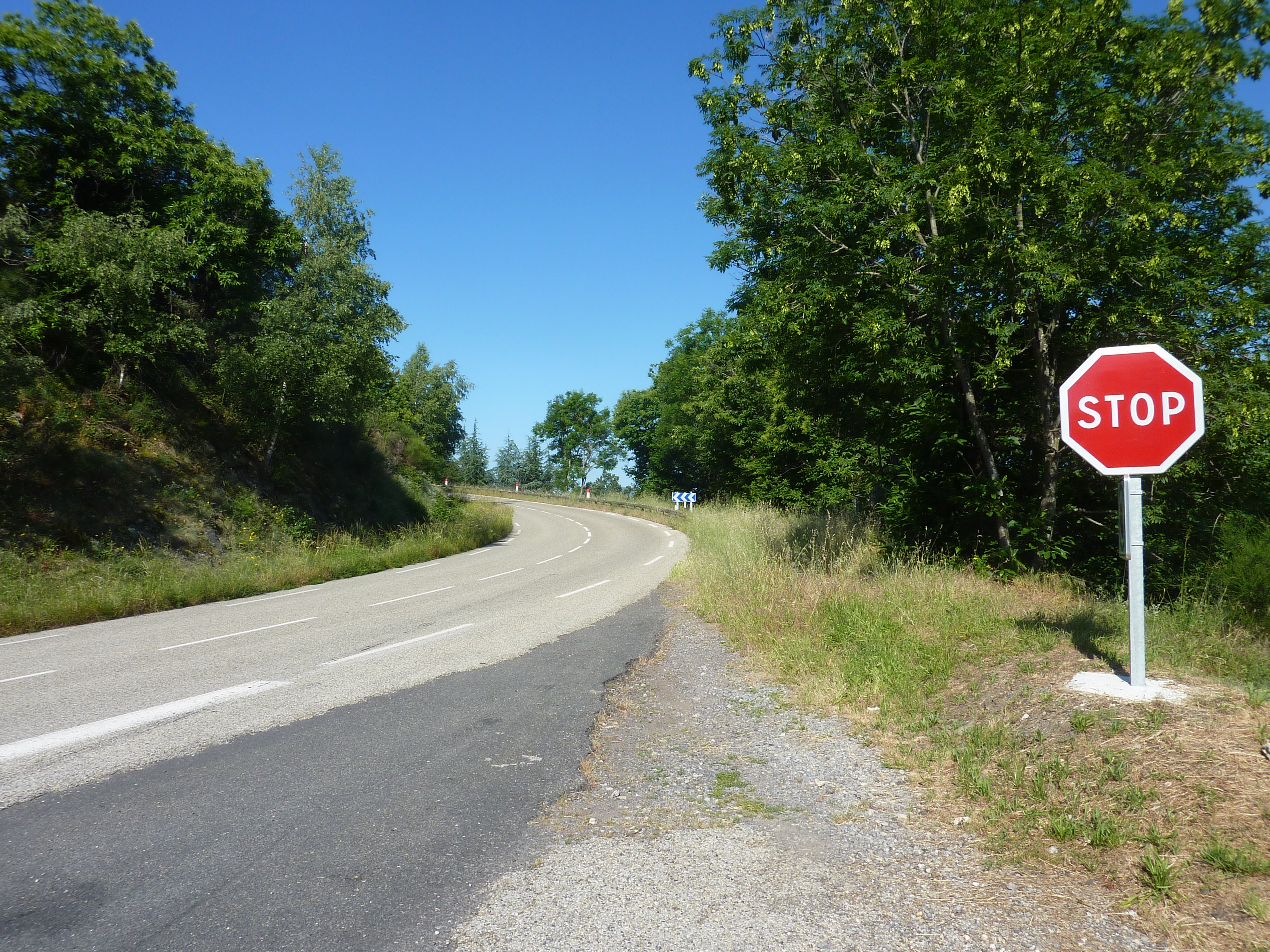A ce croisement avec la Route de la Corniche (100 mètres après le précédent) (681 m), suivre la route partant tout droit qui va rejoindre la Route de la Corniche direction Col de l'Exil, balisé en jaune dorénavant (attention à la circulation automobile)