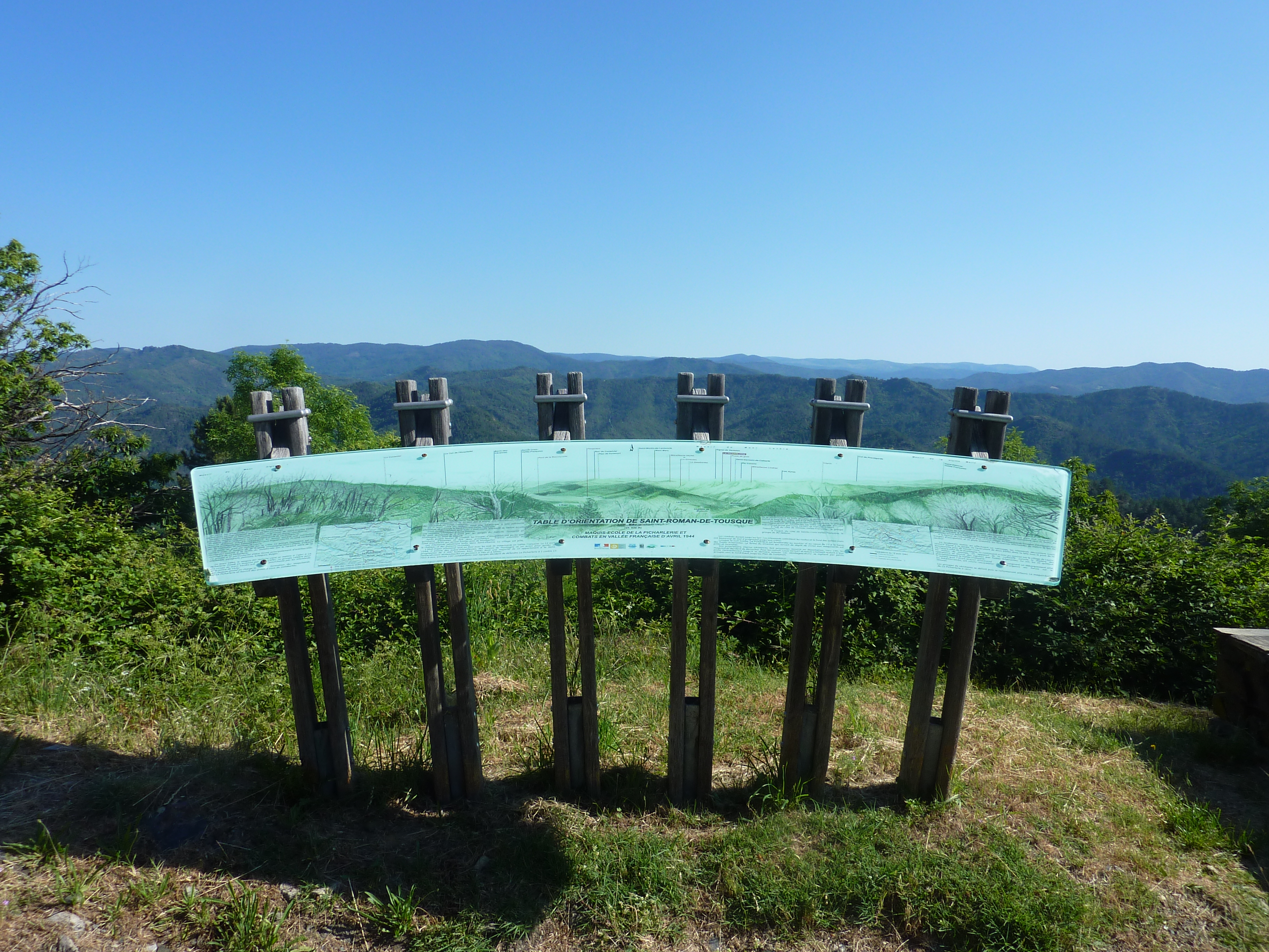 Arrivée à la Table d'orientation de Saint-Roman-de-Tousque (656 m) : belle vue sur les sommets lozériens du Parc National des Cévennes (Mont Mars, Signal de Ventalon, Mont Lozère, ...)