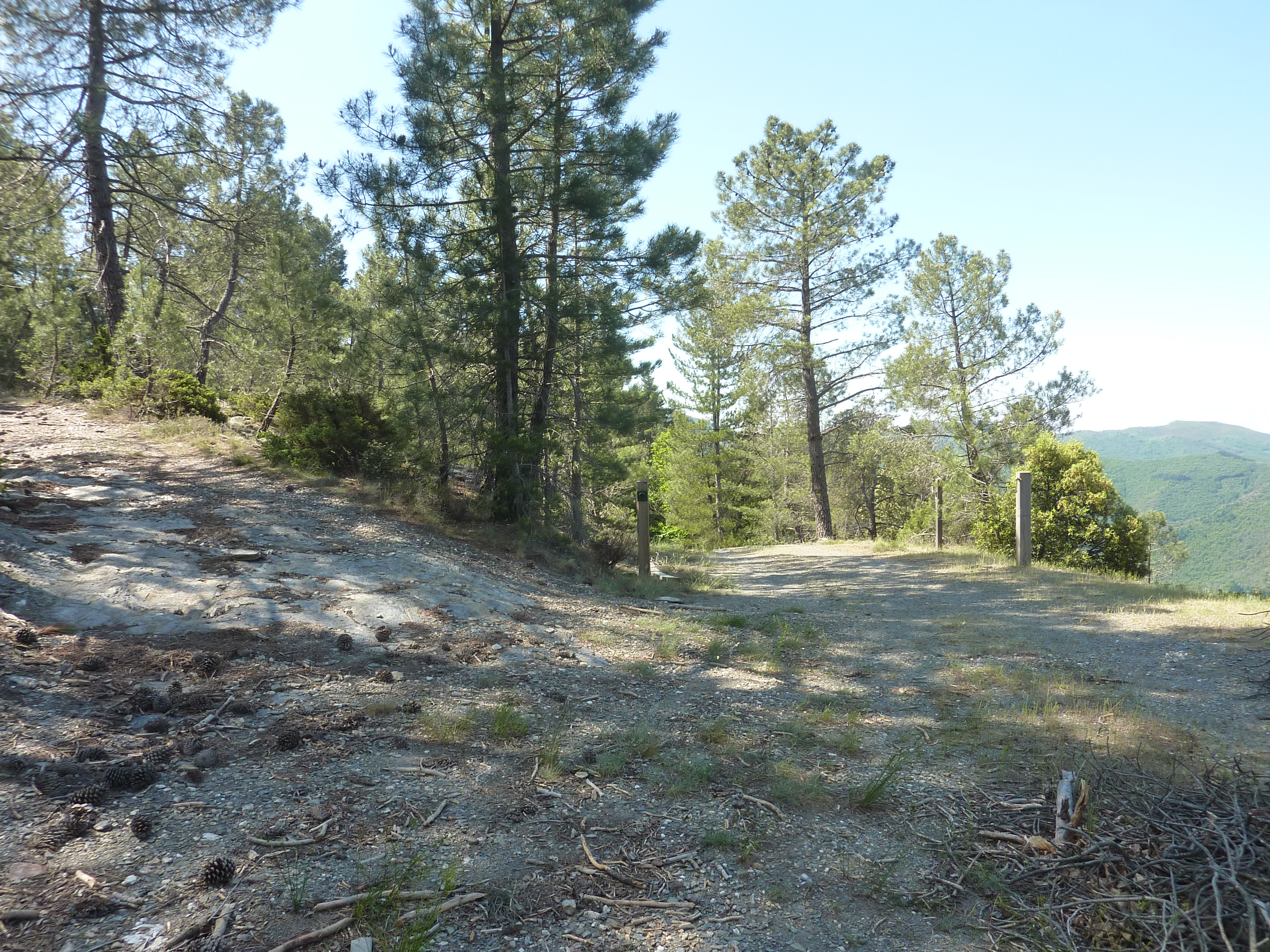A ce croisement (400 mètres après avoir quitté la table d'orientation) (681 m), quitter la Route de la Corniche pour suivre la piste partant sur la gauche puis encore celle partant sur la gauche 10 mètres après direction le Tourel, aucun balisage dorénavant (il faut toujours suivre la piste la mieux tracée à partir de maintenant)
