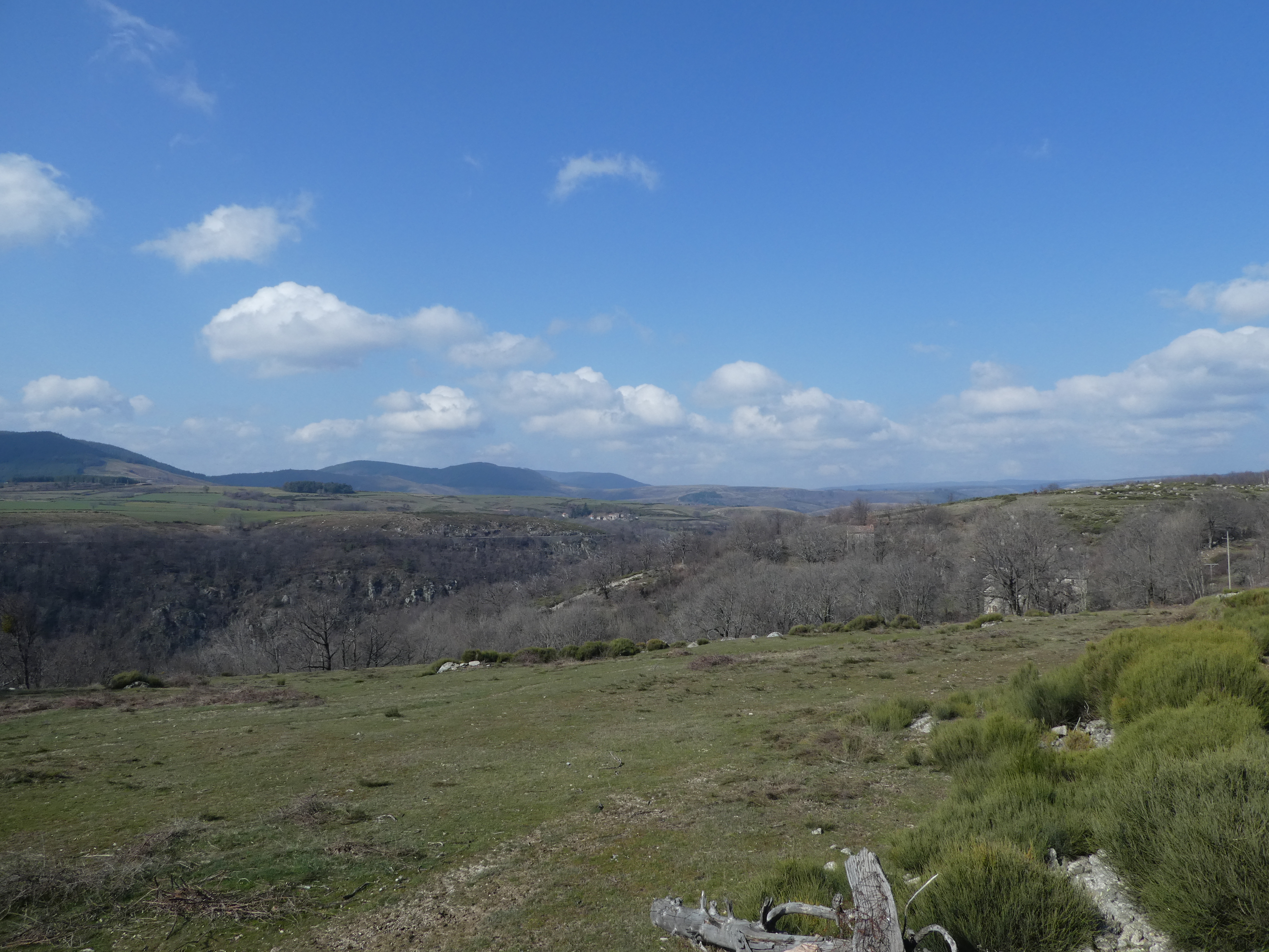 Belle vue sur les Gorges de l'Altier à droite et celles du Chassezac au fond ; à gauche, on aperçoit le hameau de la Viale, le village de Pied-de-Borne et en fond de vallée, le village de Sainte-Marguerite-Lafigère