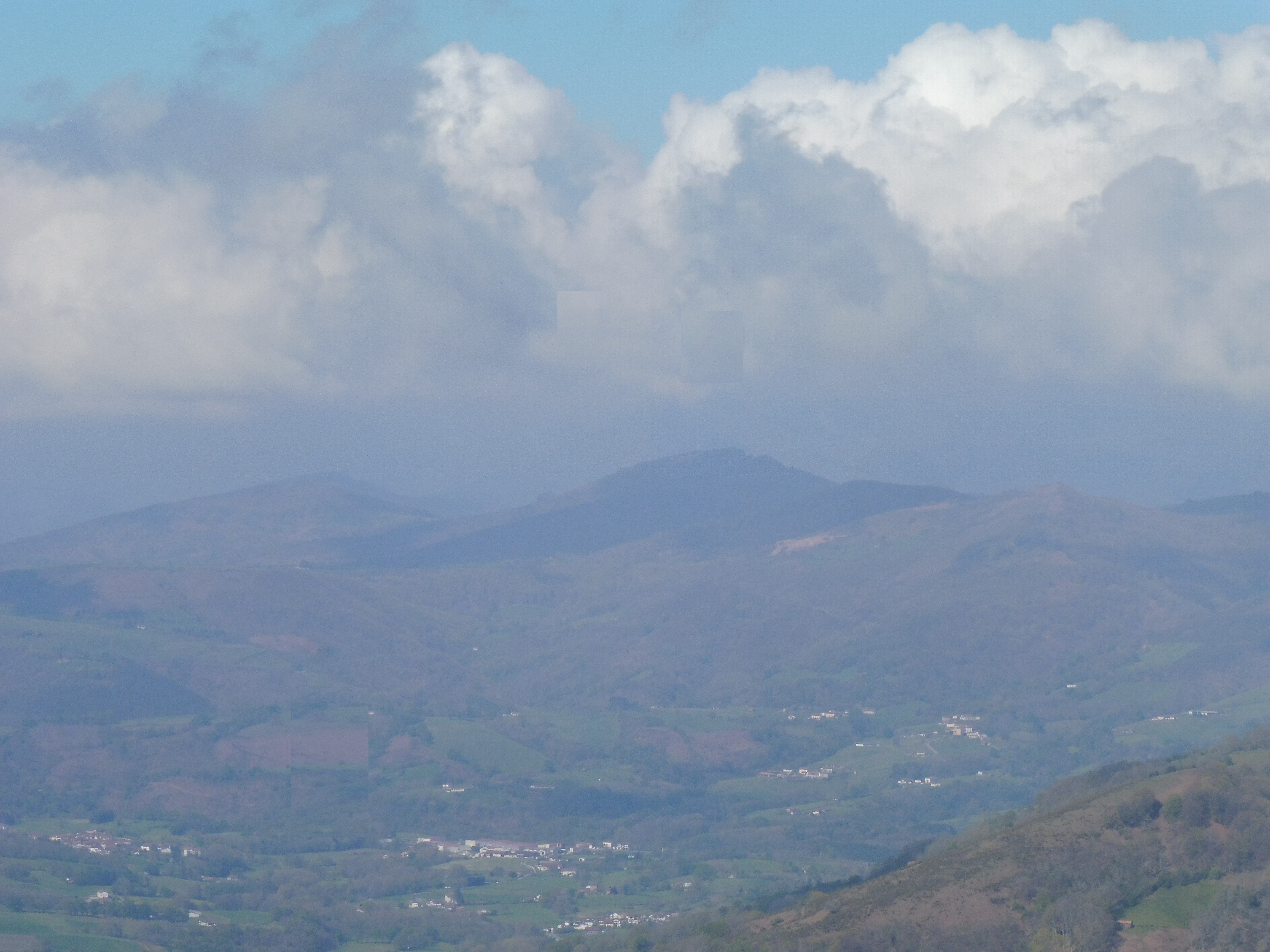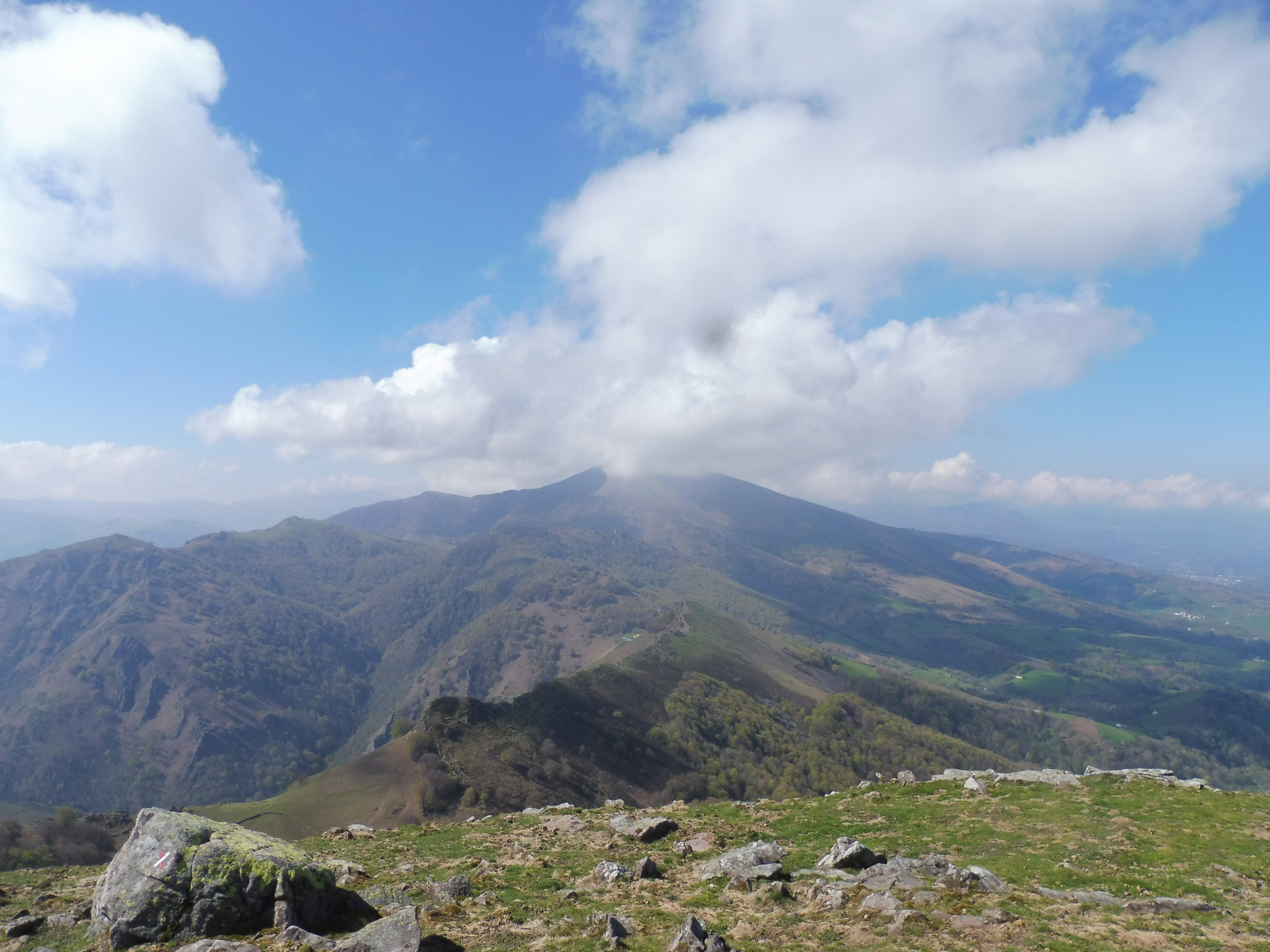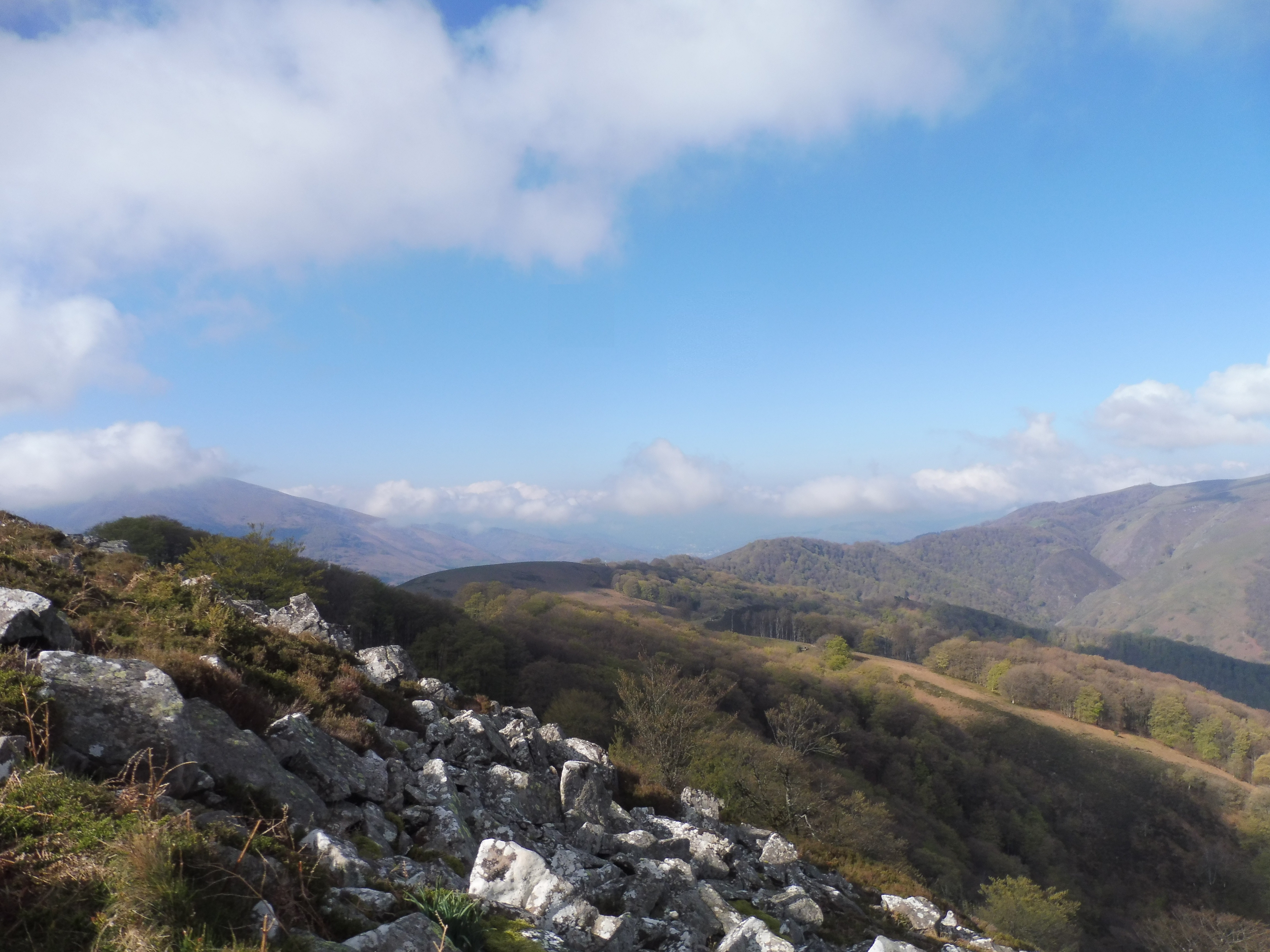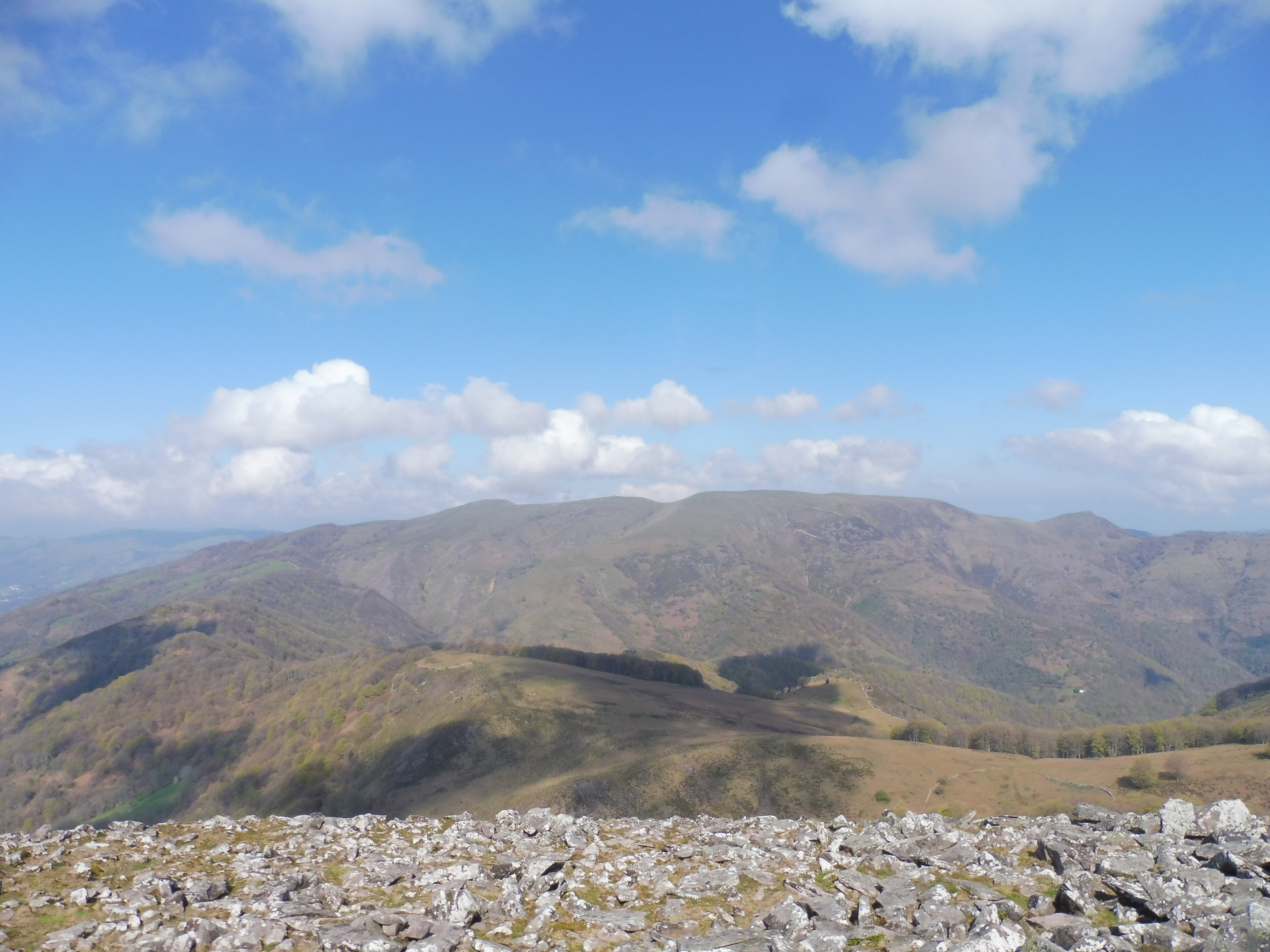 Arrivée au sommet d'Astate (1015 m) : beau panorama sur les sommets de la Valle de Baztan, des Crêtes d'Iparla et de la Basse-Navarre malgré la présence de nuages