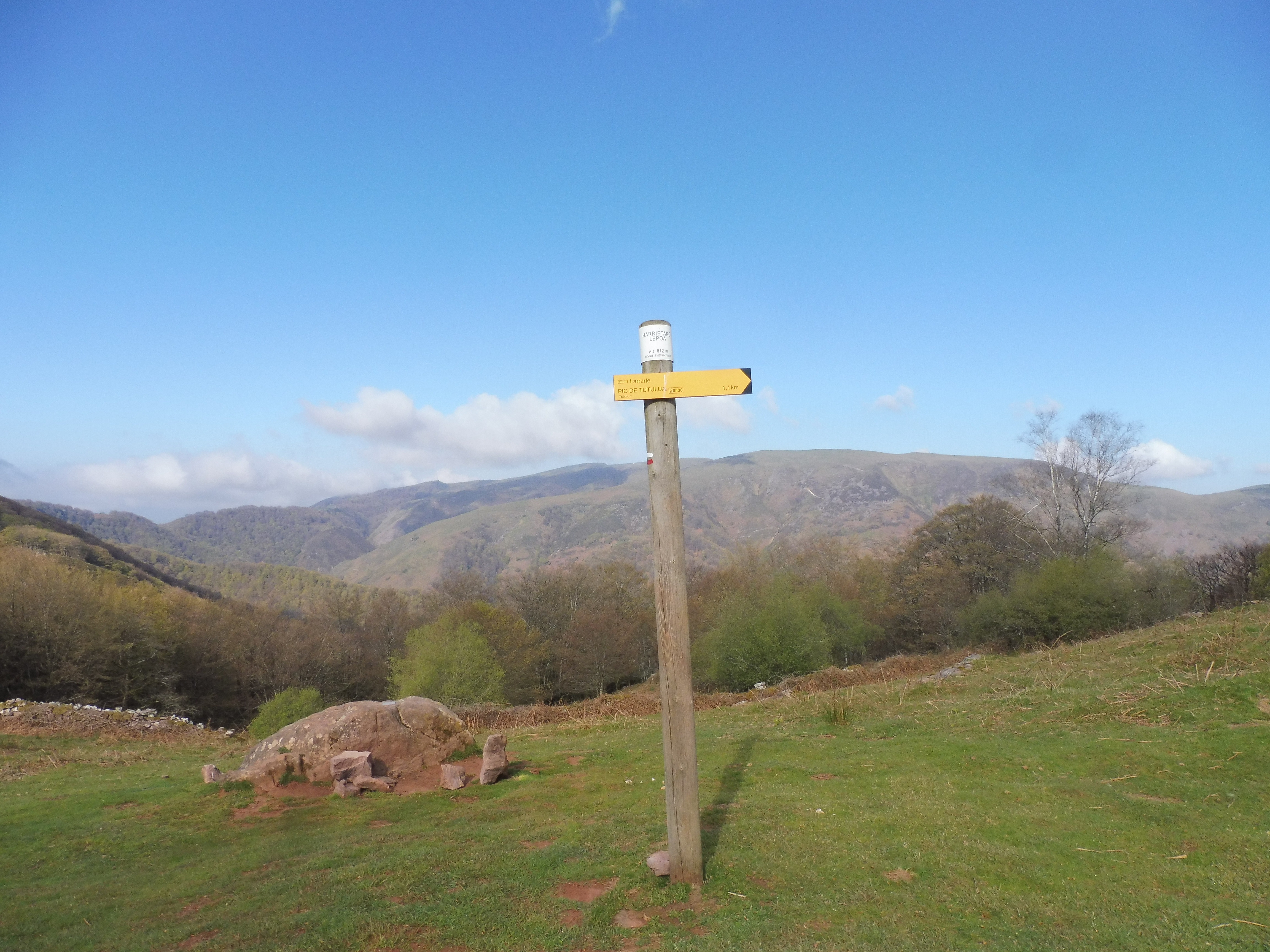 Buztanzelhaiko Lepoa (843 m) : frontière franco-espagnole (retour en France) : suivre le GR10 partant sur la gauche direction Saint-Étienne-de-Baïgorry, balisé en rouge et blanc
