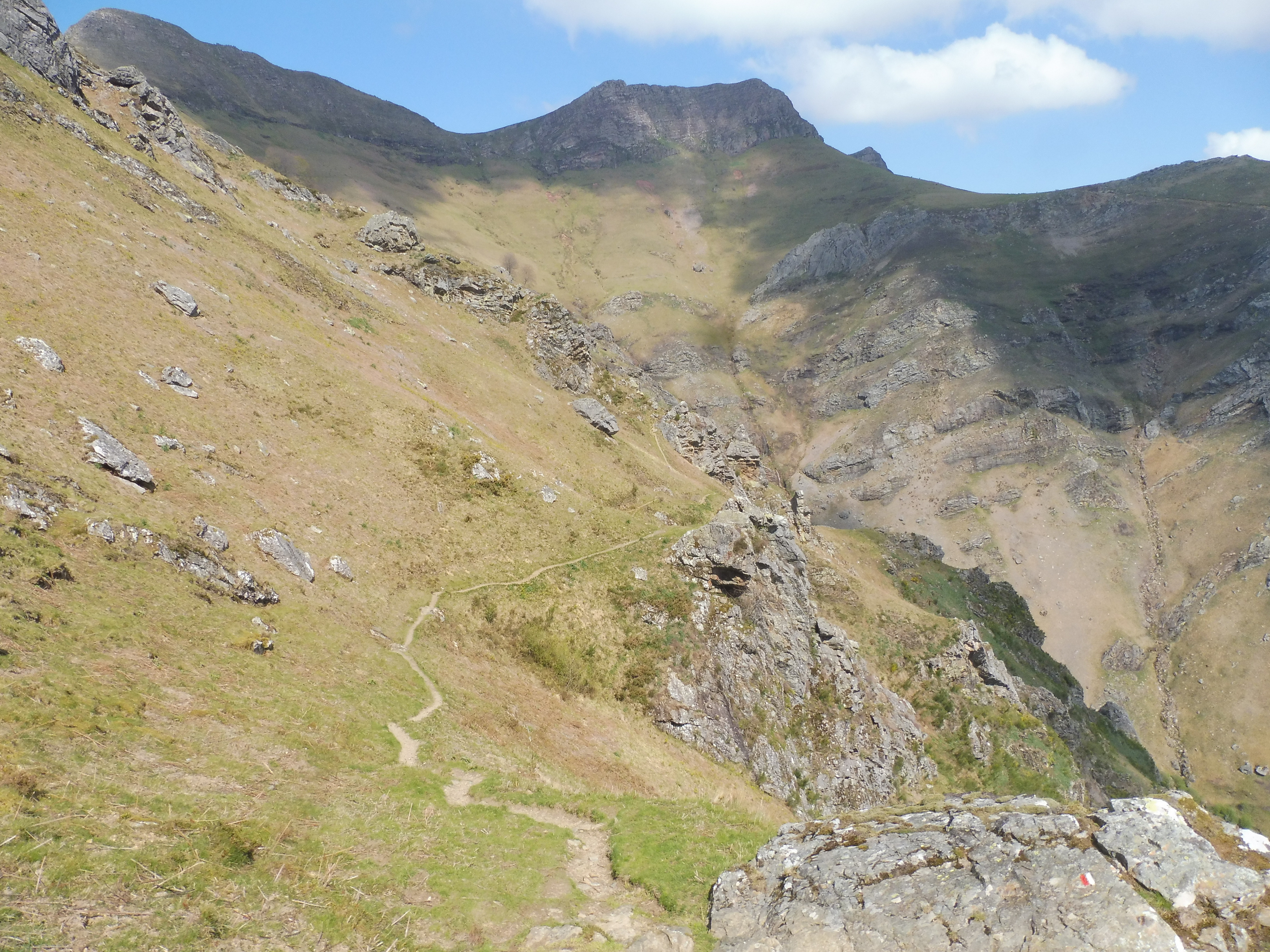 Vue arrière sur le passage en écharpe du GR10 légèrement exposé au vide au-dessus du Vallon du Leizparzko Erreka