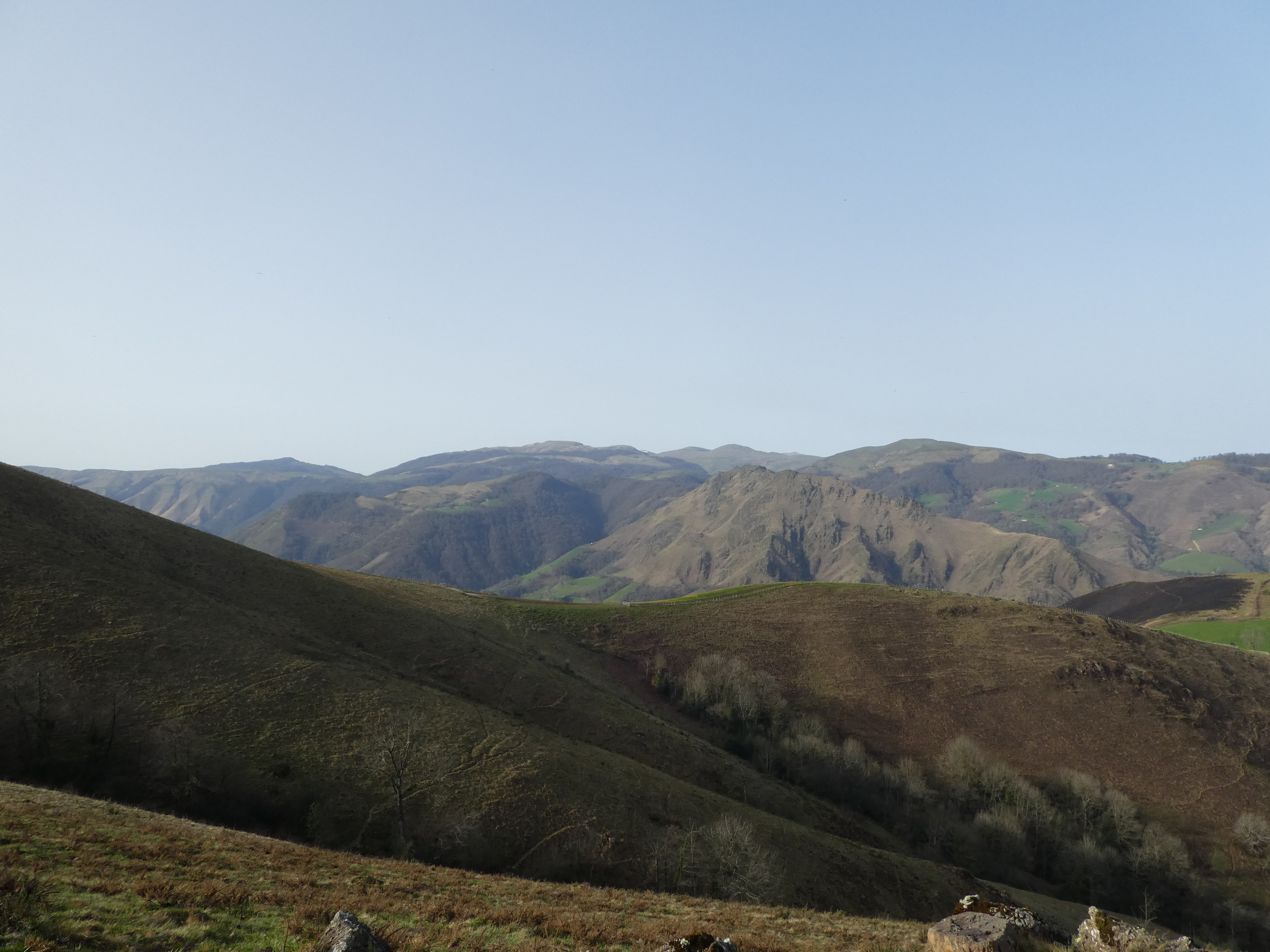 Arrivée au sommet de Gatarre (761 m) : très beau panorama sur les sommets de la Vallée de la Nive (Urkulu, Leizaratheka, Orisson, Iparla, Artzamendi, Baïgura, Ursuya, ...), du Pays de Cize (Adartza, Munhoa, Jara, ...), de la Vallée du Laurhibar (Pic de Belchou, Pic de Béhorléguy, ...) ainsi que sur le Pays de Cize ... au loin, on peut également distinguer les sommets béarnais (Anie, Soum Couy)