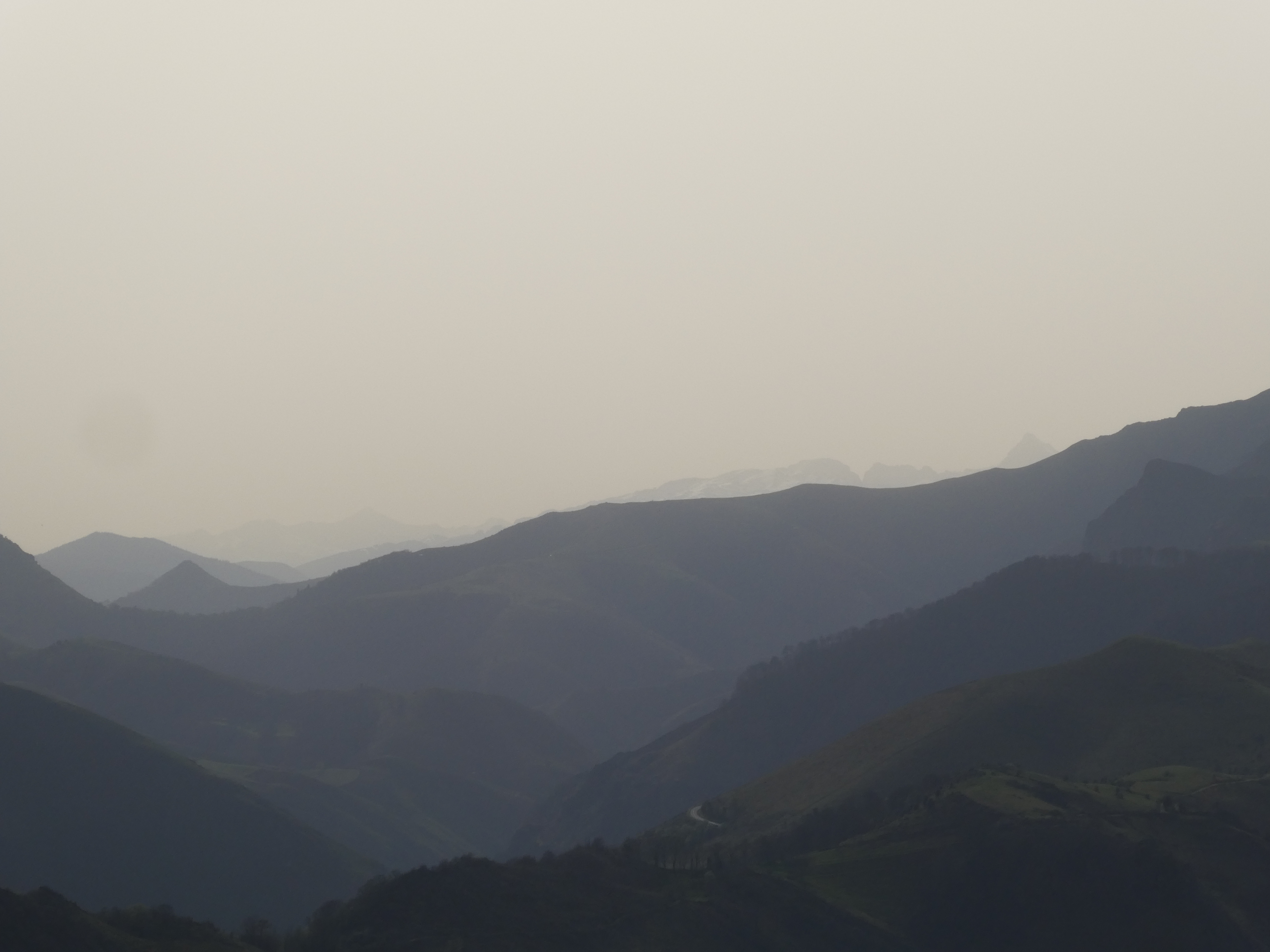 Zoom sur les sommets béarnais distinguables malgré l'ambiance sableuse qui règne depuis quelques jours avec le Pic Permayou, le Pic d'Isabe, le Pic de Sesques, le Pic du Soum Couy et le Pic d'Anie