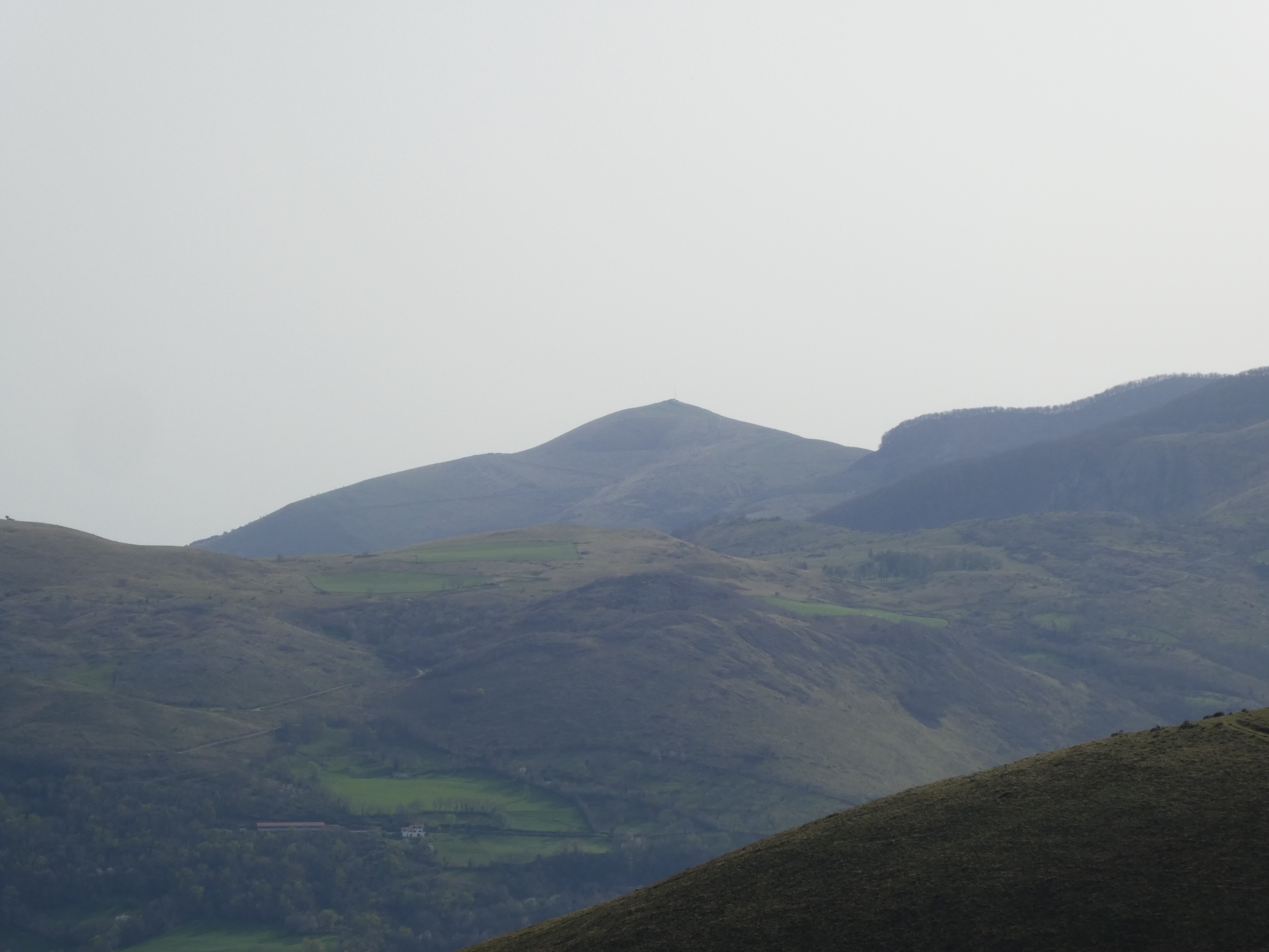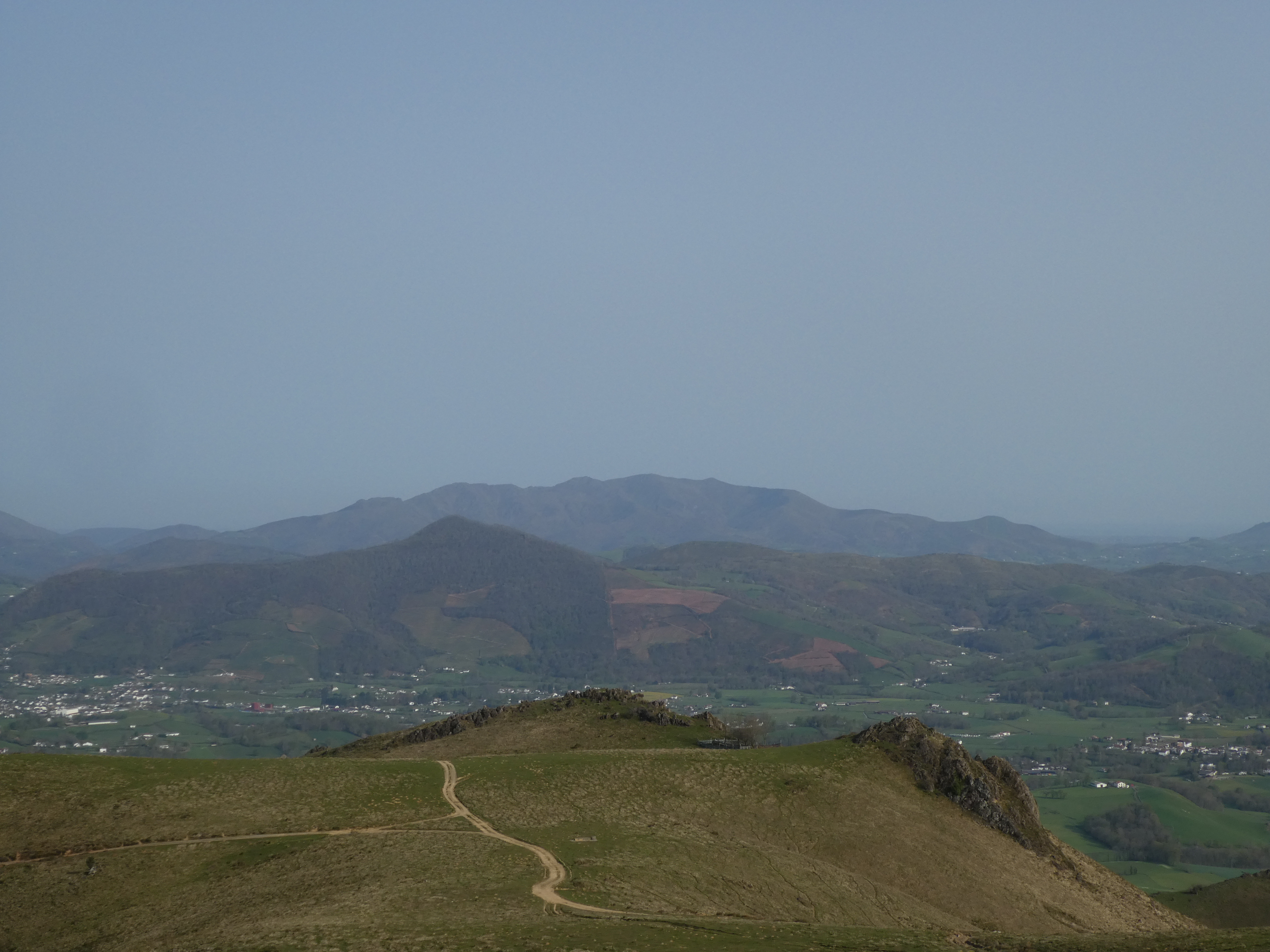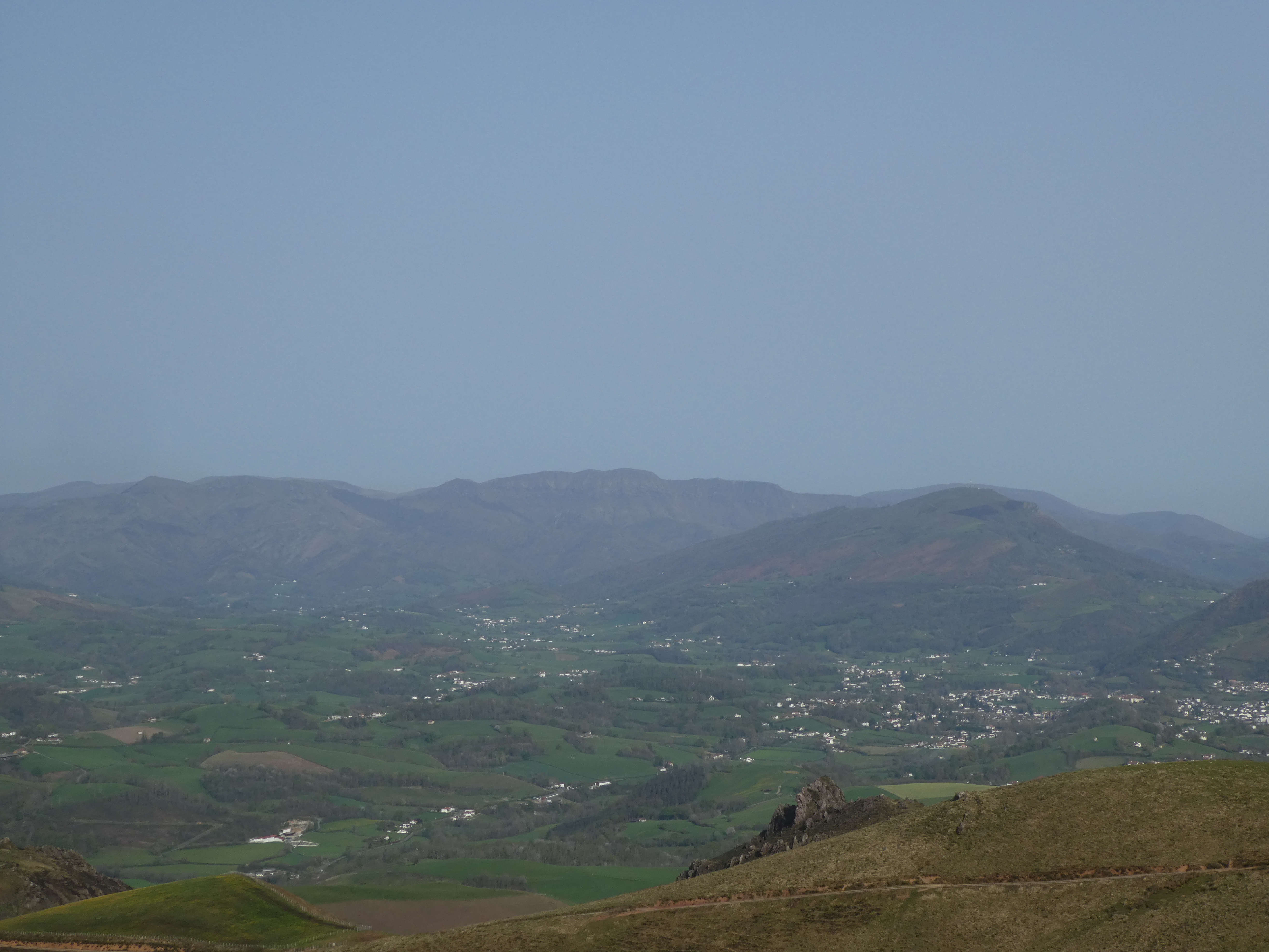 Les crêtes frontalières d'Iparla et le sommet de Jara à droite ... en contrebas, les villages d'Irouléguy (Irulegi) et de Saint-Jean-Pied-de-Port (Donibane Garazi)
