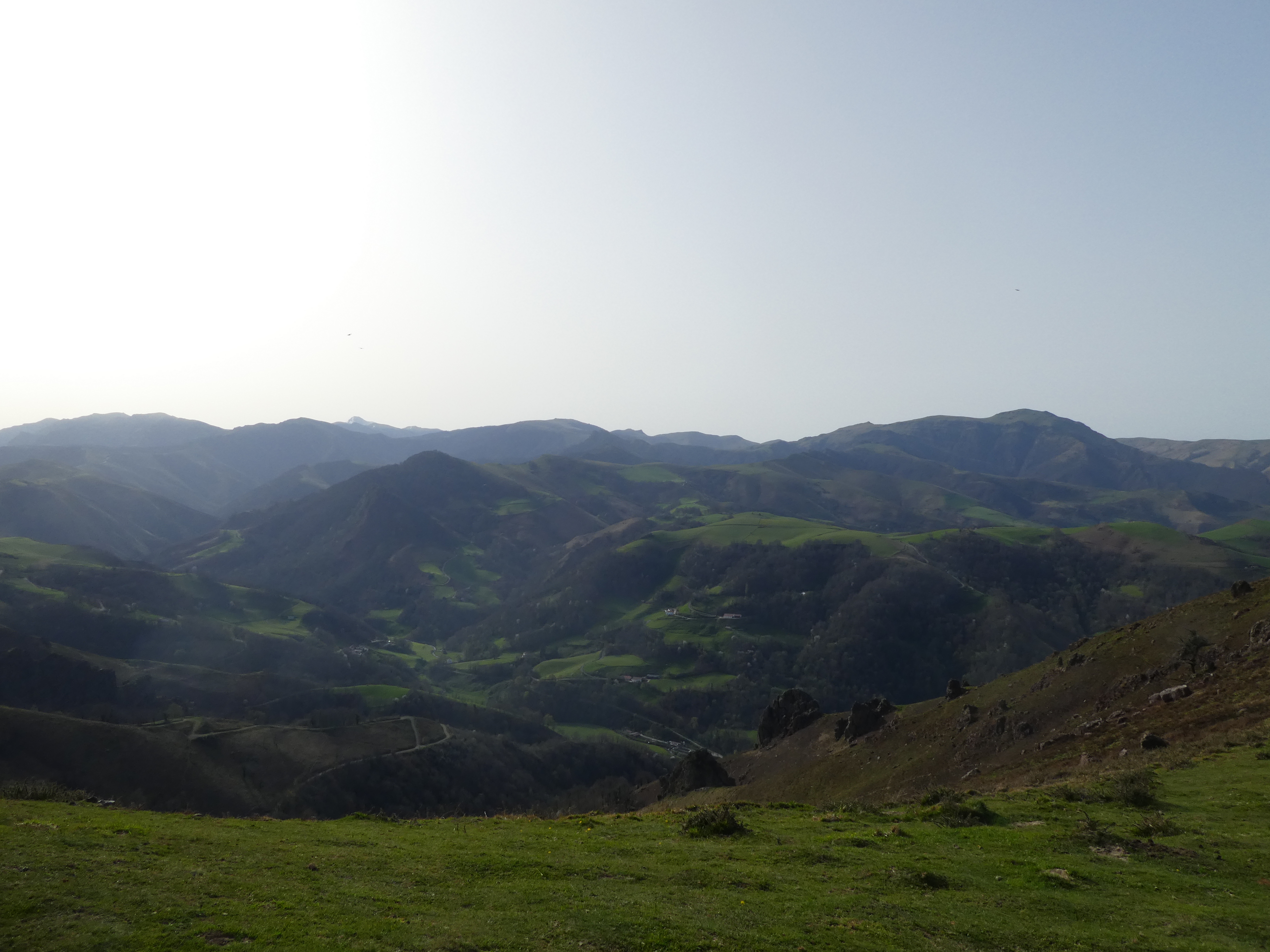 Arrivée au sommet d'Handiagamendi (642 m) : panorama similaire à celui de Gatarre avec vue supplémentaire sur la Vallée de la Nive de Béhérobie et le Pays de Cize