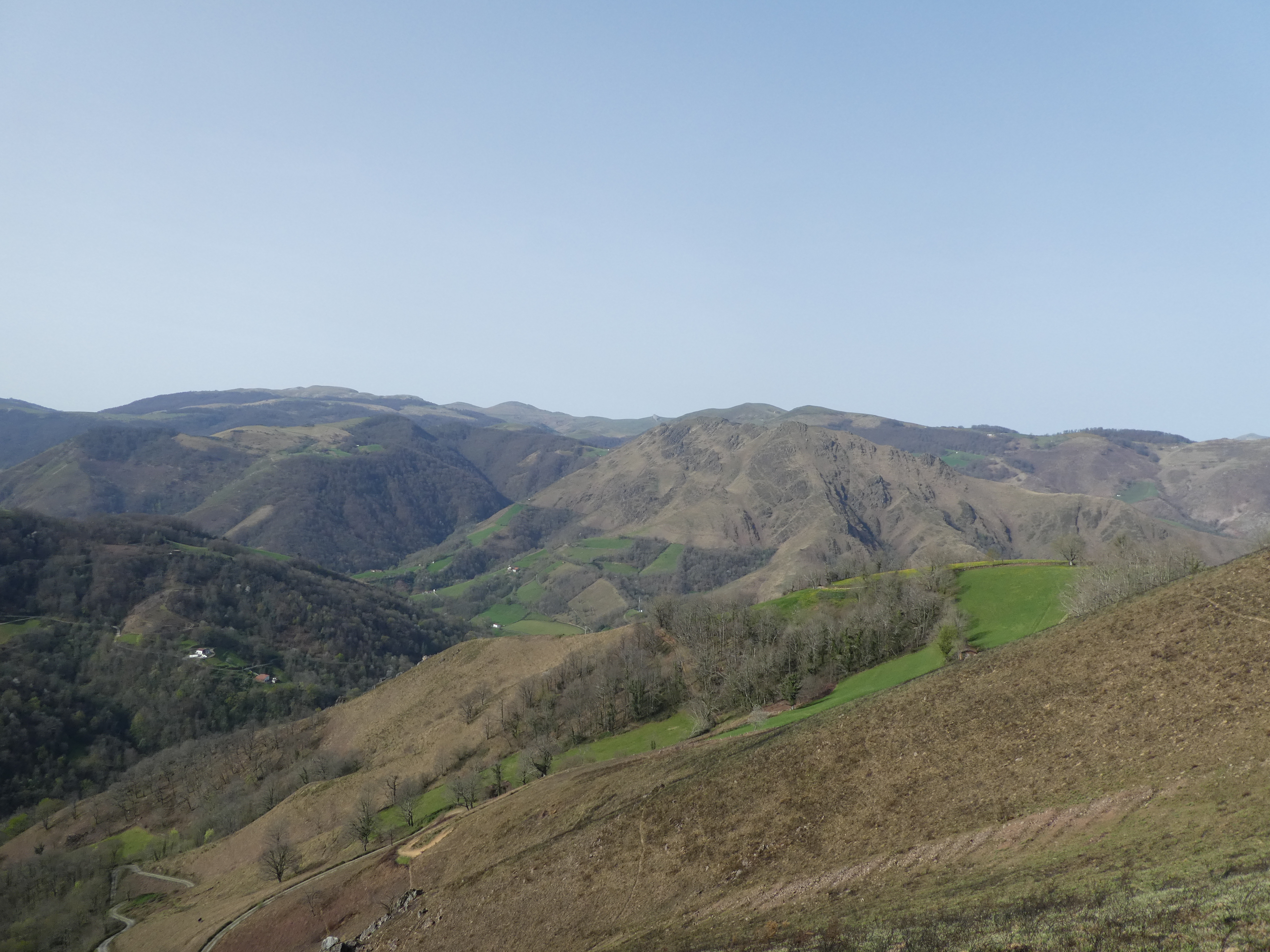 La vue commence à se dévoiler sur le Pays de Cize avec le village de Çaro et en arrière-plan, l'Adartza, le Munhoa, les crêtes d'Iparla et Jara