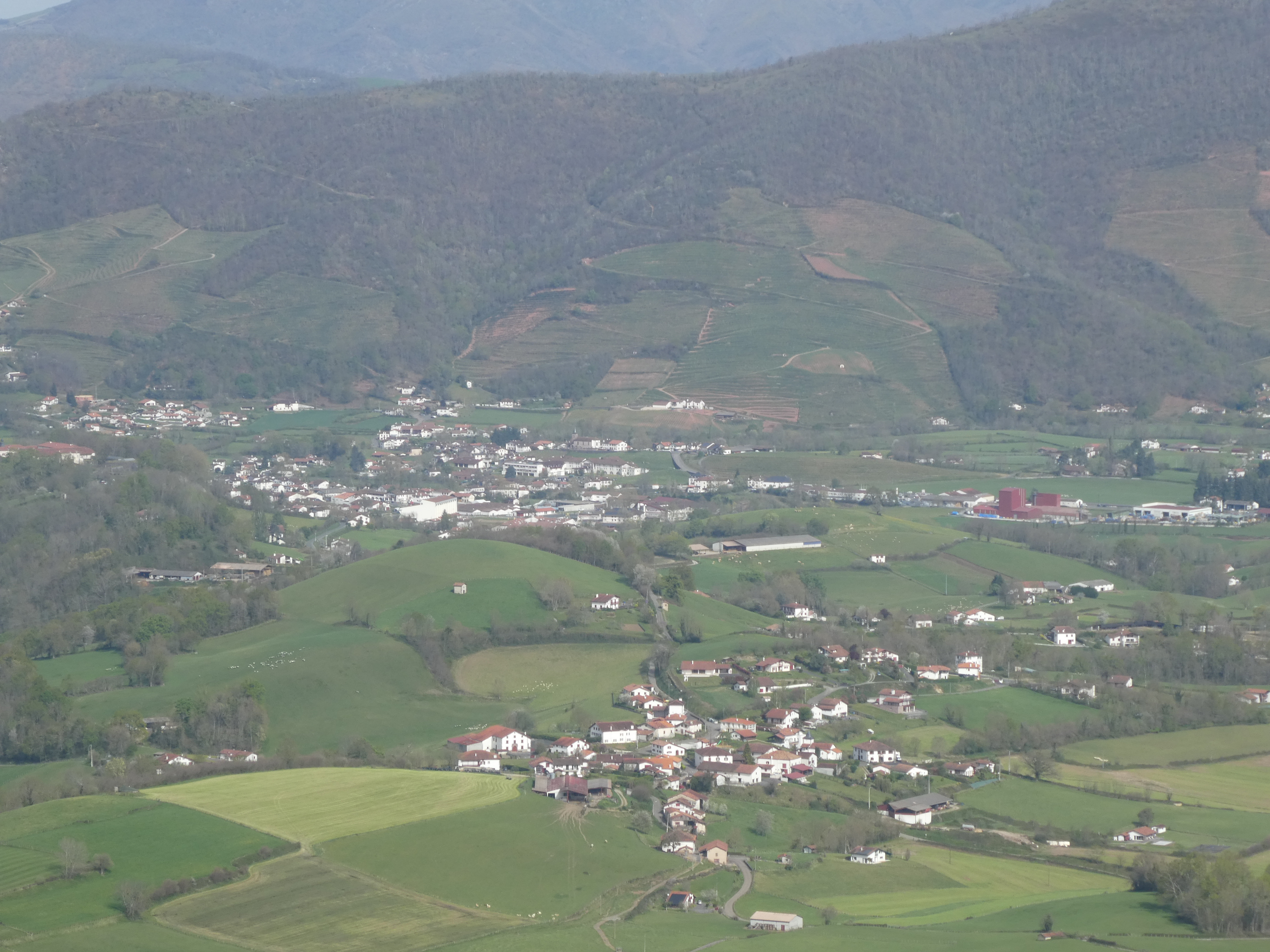 Belle vue sur le Pays de Cize avec les villages d'Irouléguy (Irulegi en basque), Saint-Jean-Pied-de-Port (Donibane Garazi en basque), Saint-Jean-le-Vieux (Donazaharre en basque) et Aincille (Aintzila en basque)