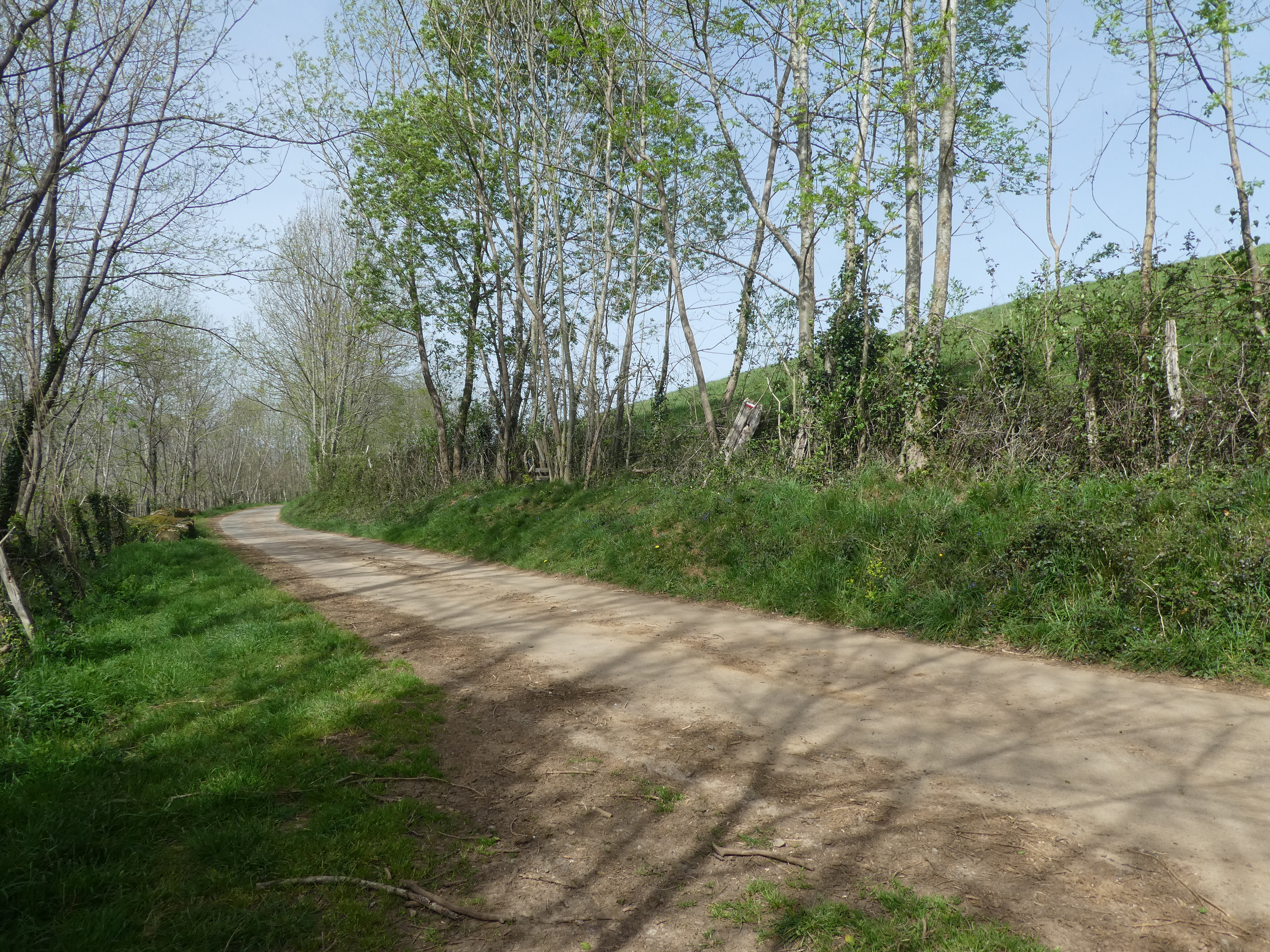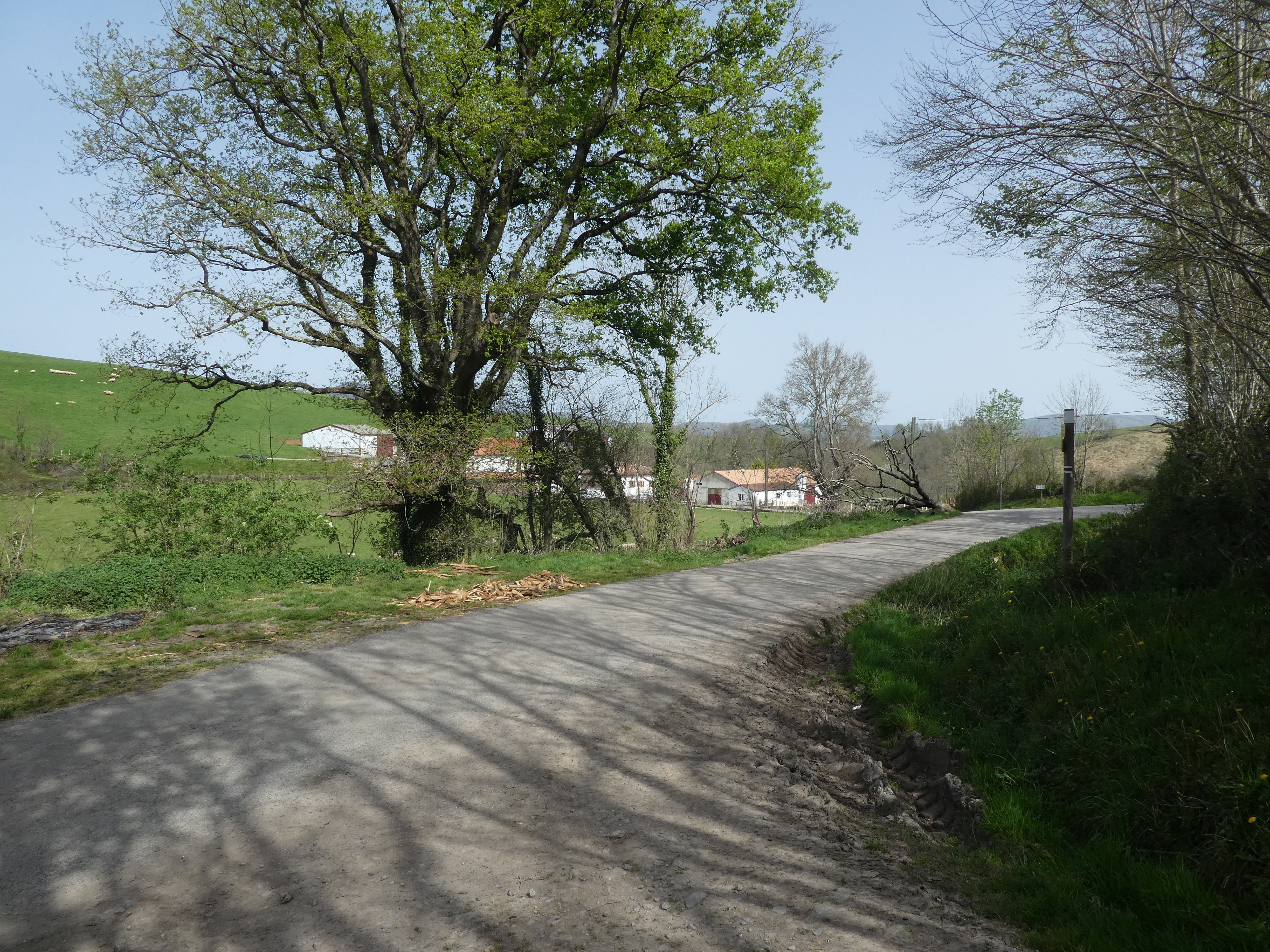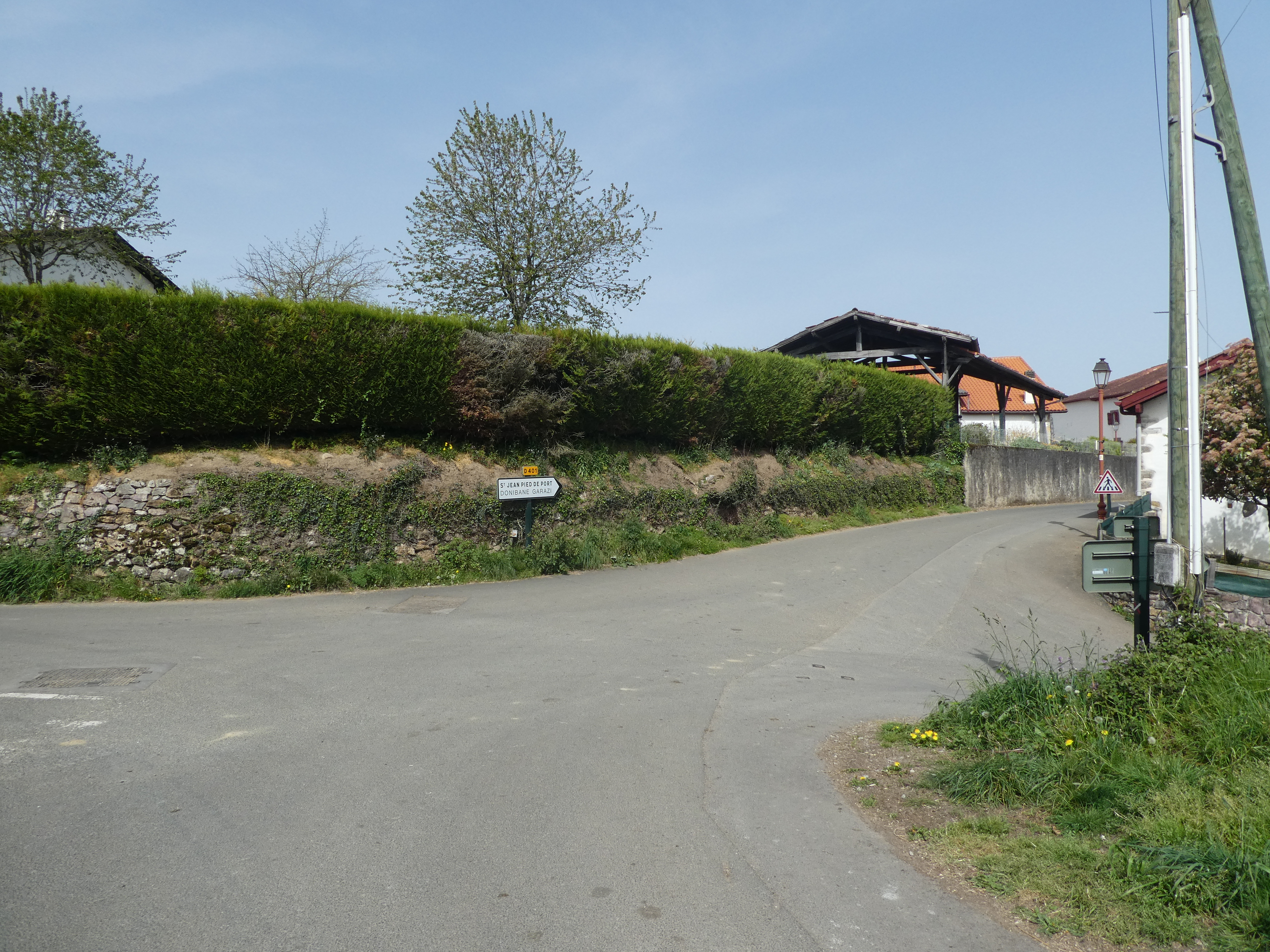 A ce croisement très peu marqué (300 mètres après le précédent), descendre légèrement sur la droite en suivant les poteaux balisés en rouge et blanc direction Saint-Jean-Pied-de-Port, balisé en rouge et blanc