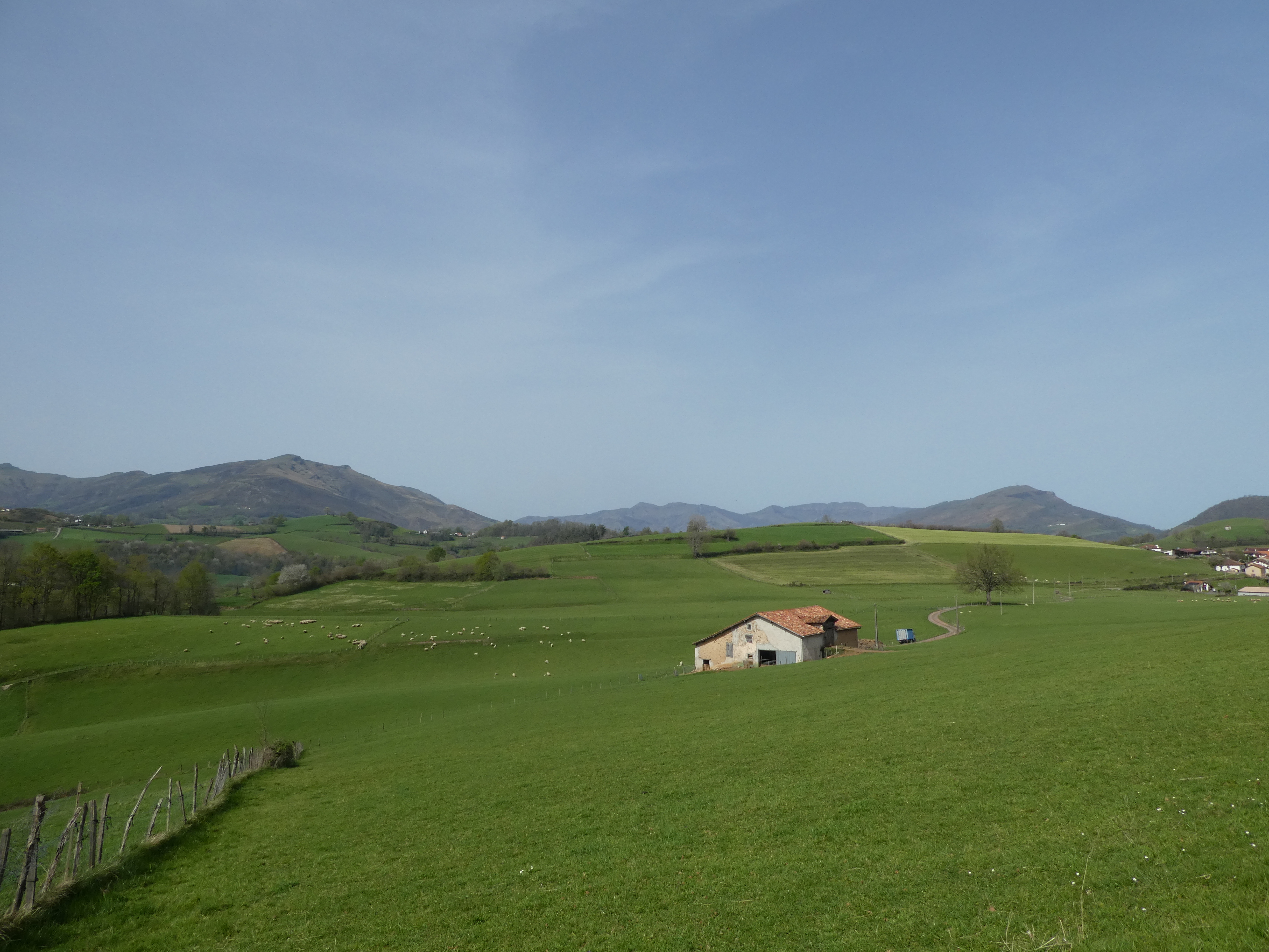 Bordes d'Handiague (585 m) : suivre le chemin partant sur la gauche direction Saint-Jean-Pied-de-Port, balisé en rouge et blanc