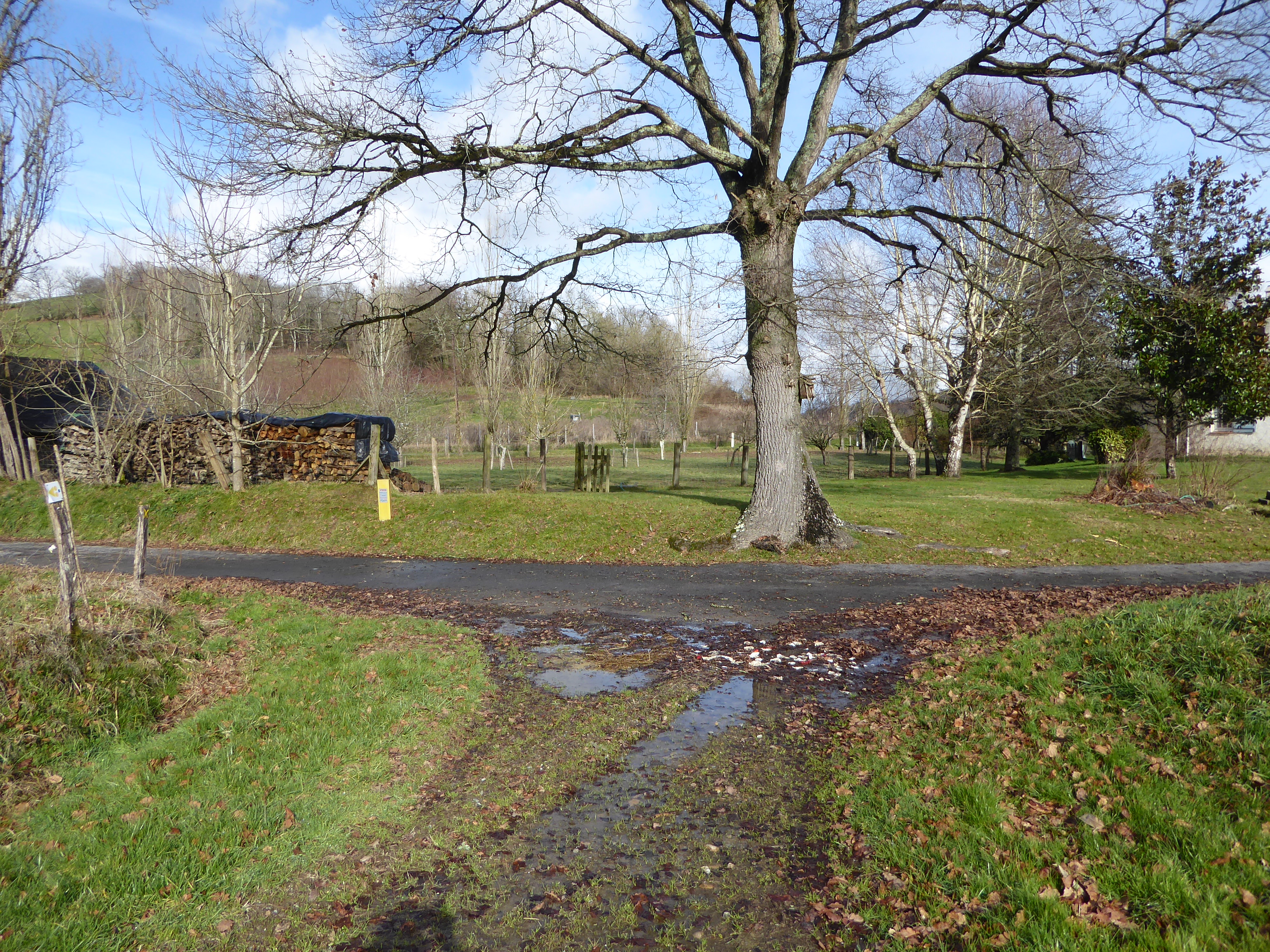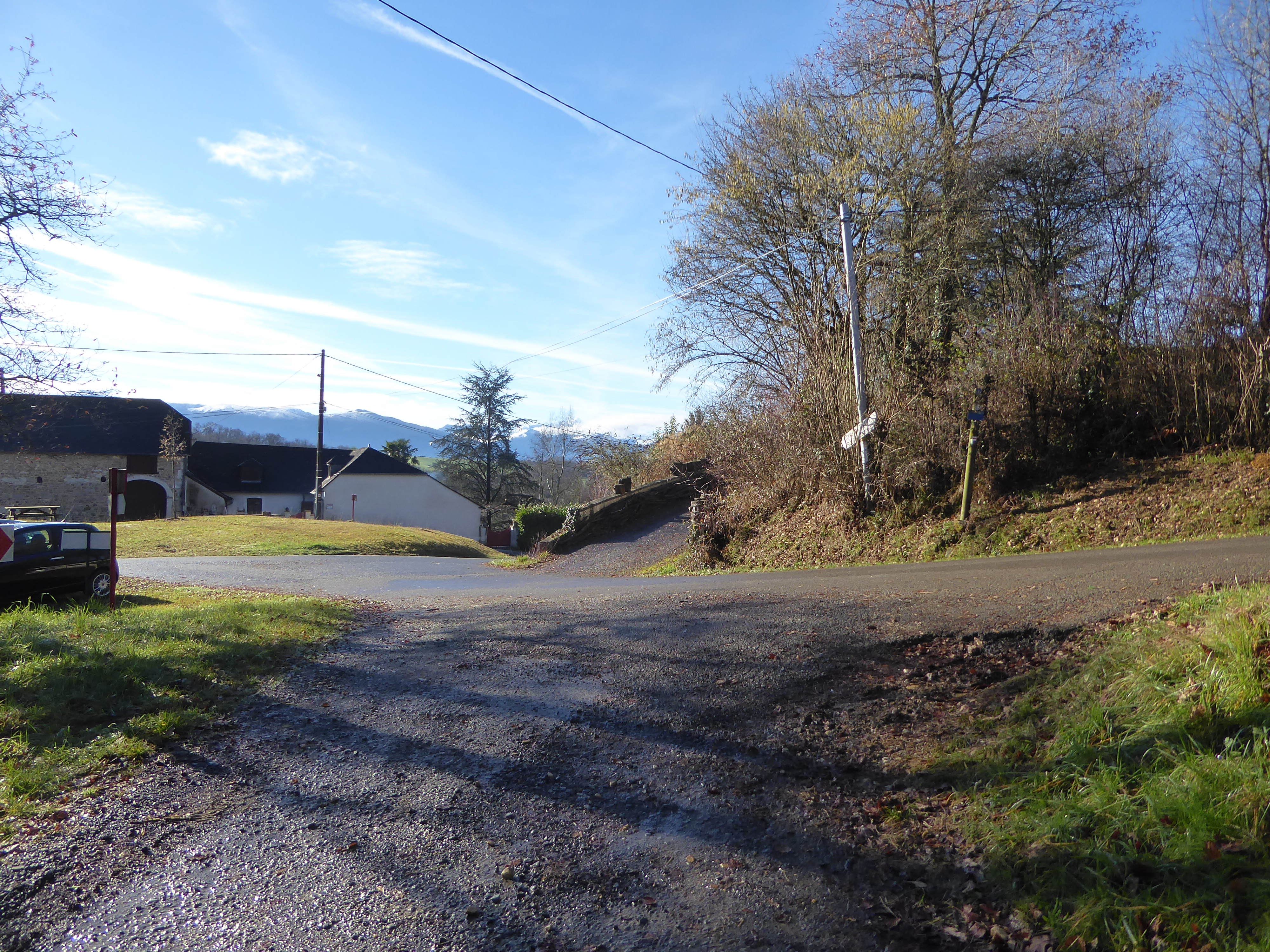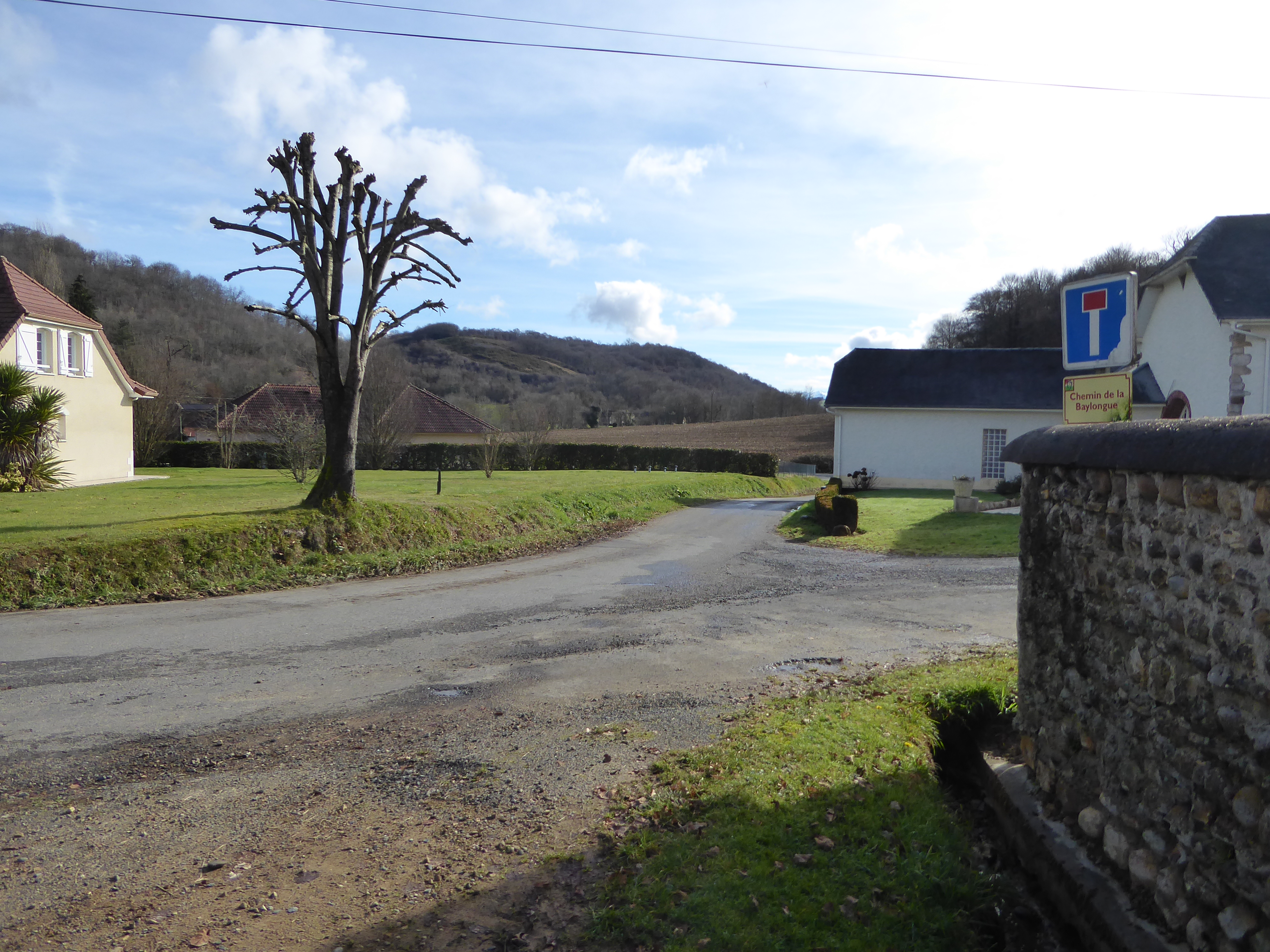 A ce croisement avec une route bitumée (193 m) (300 mètres après le croisement du poteau), suivre cette dernière sur la droite direction Pont sur la Baylongue, balisé sporadiquement en jaune