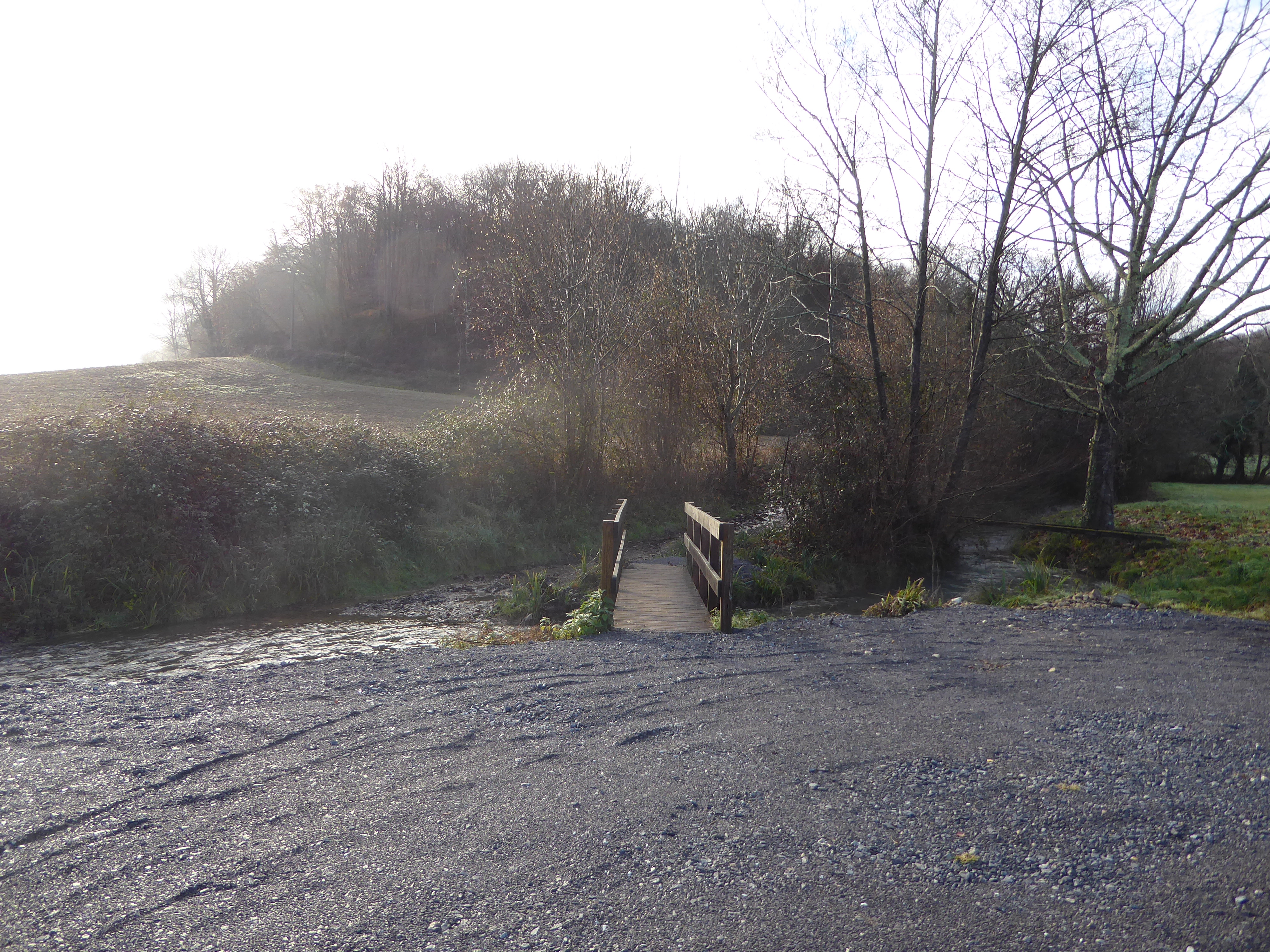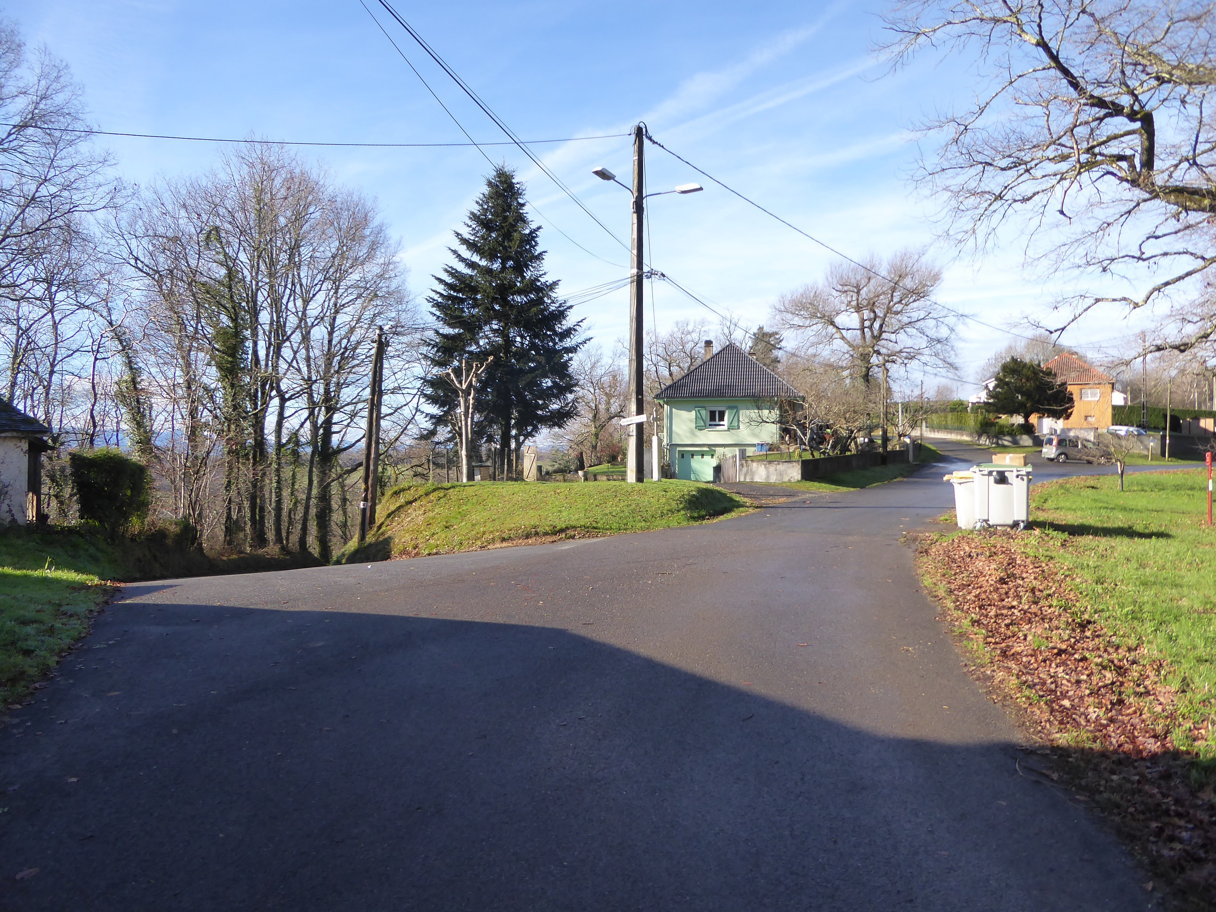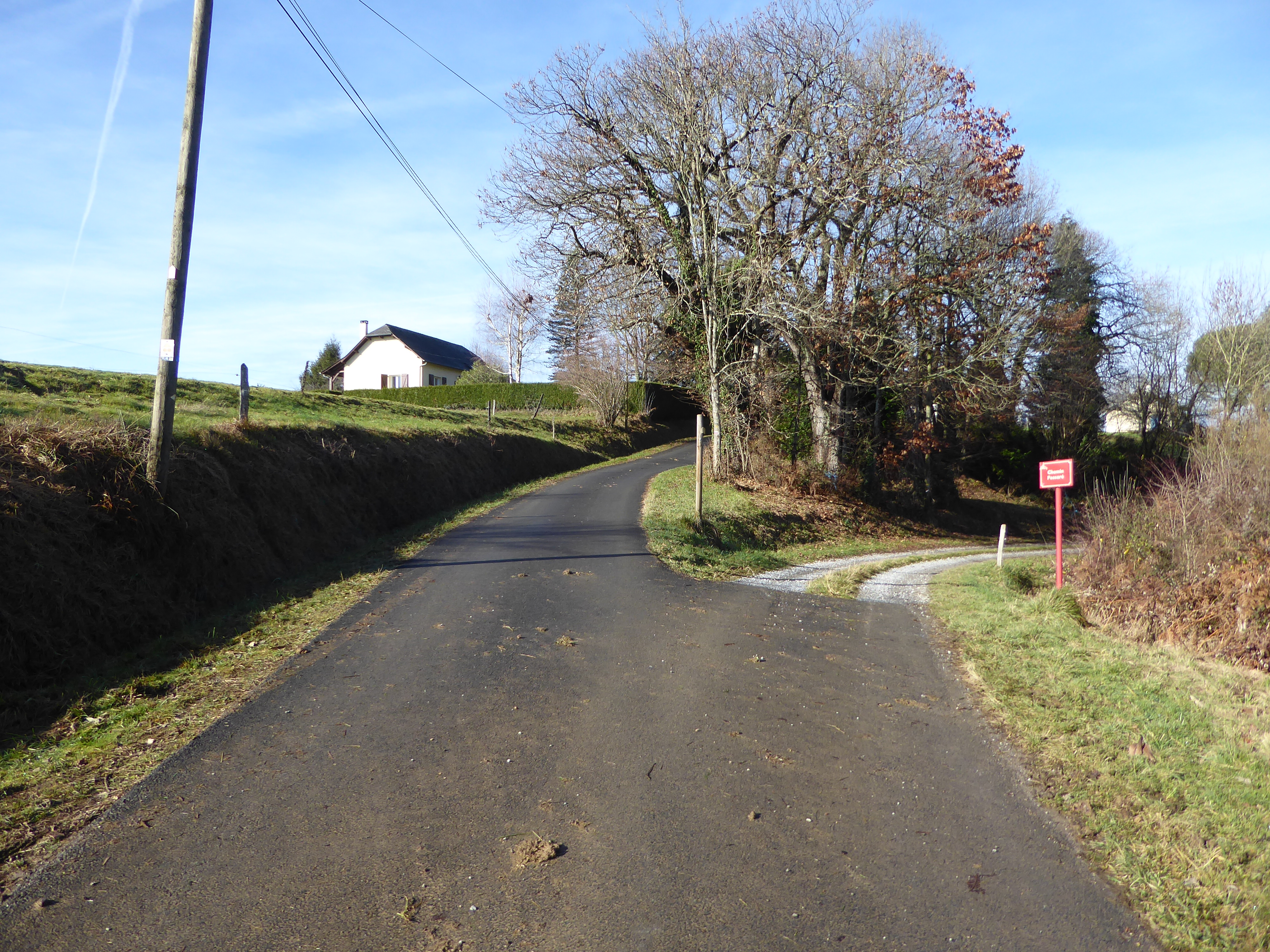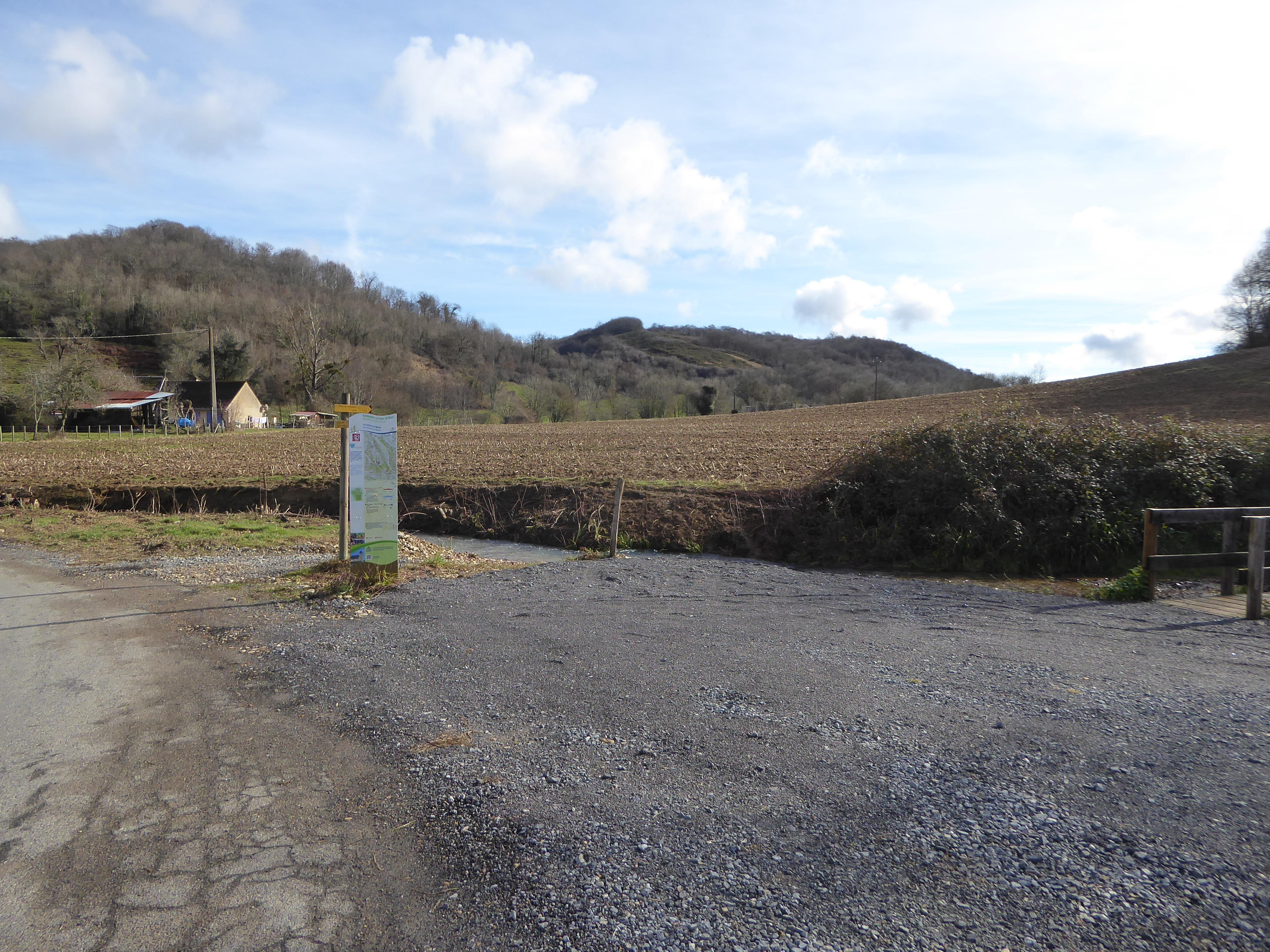 A ce croisement avec une route bitumée (193 m) (300 mètres après le croisement du poteau), suivre cette dernière sur la droite direction Pont sur la Baylongue, balisé sporadiquement en jaune