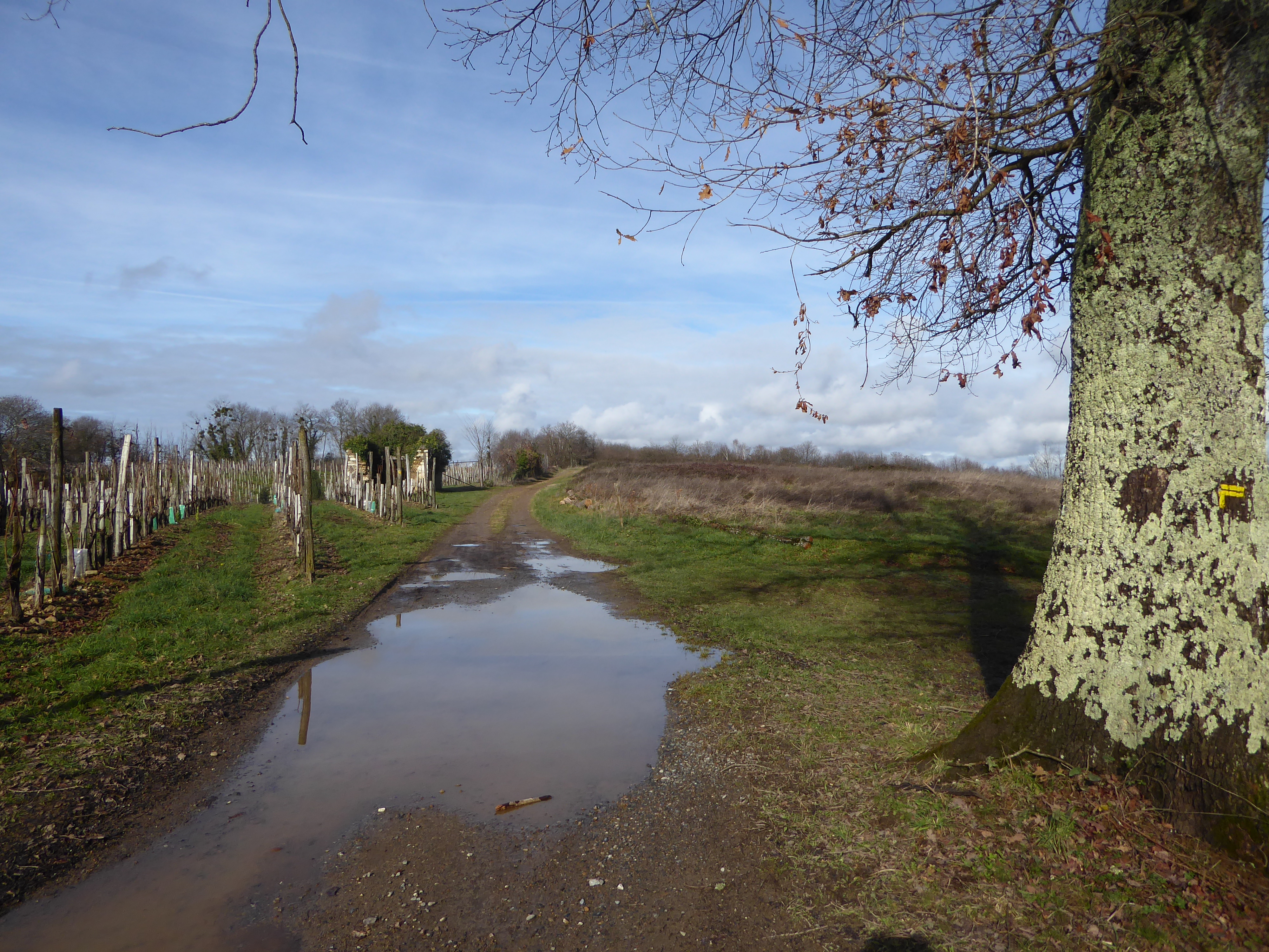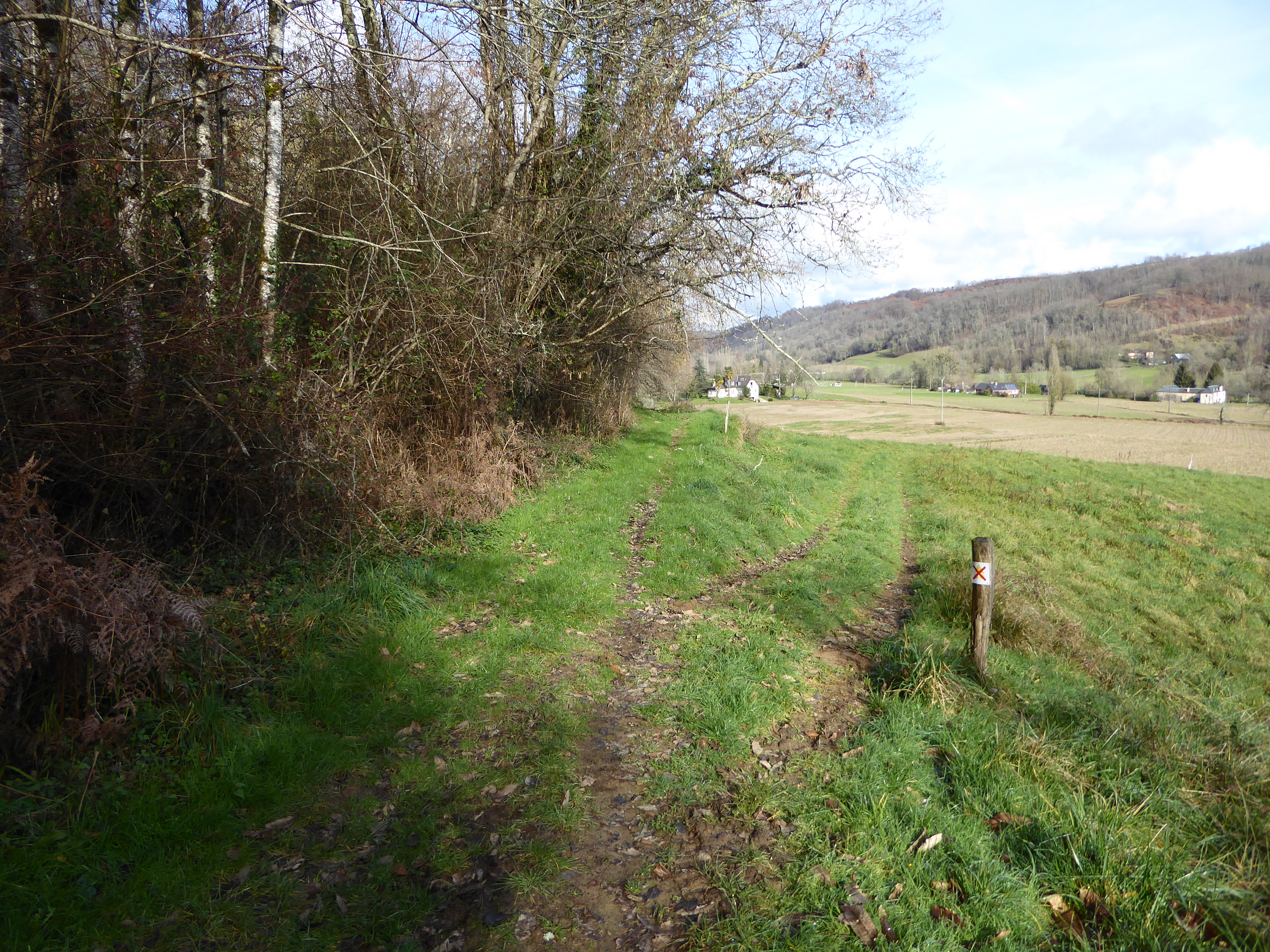 A ce croisement marqué par ce poteau indicateur, suivre le chemin partant tout droit direction Pont sur la Baylongue, balisé sporadiquement en jaune dorénavant