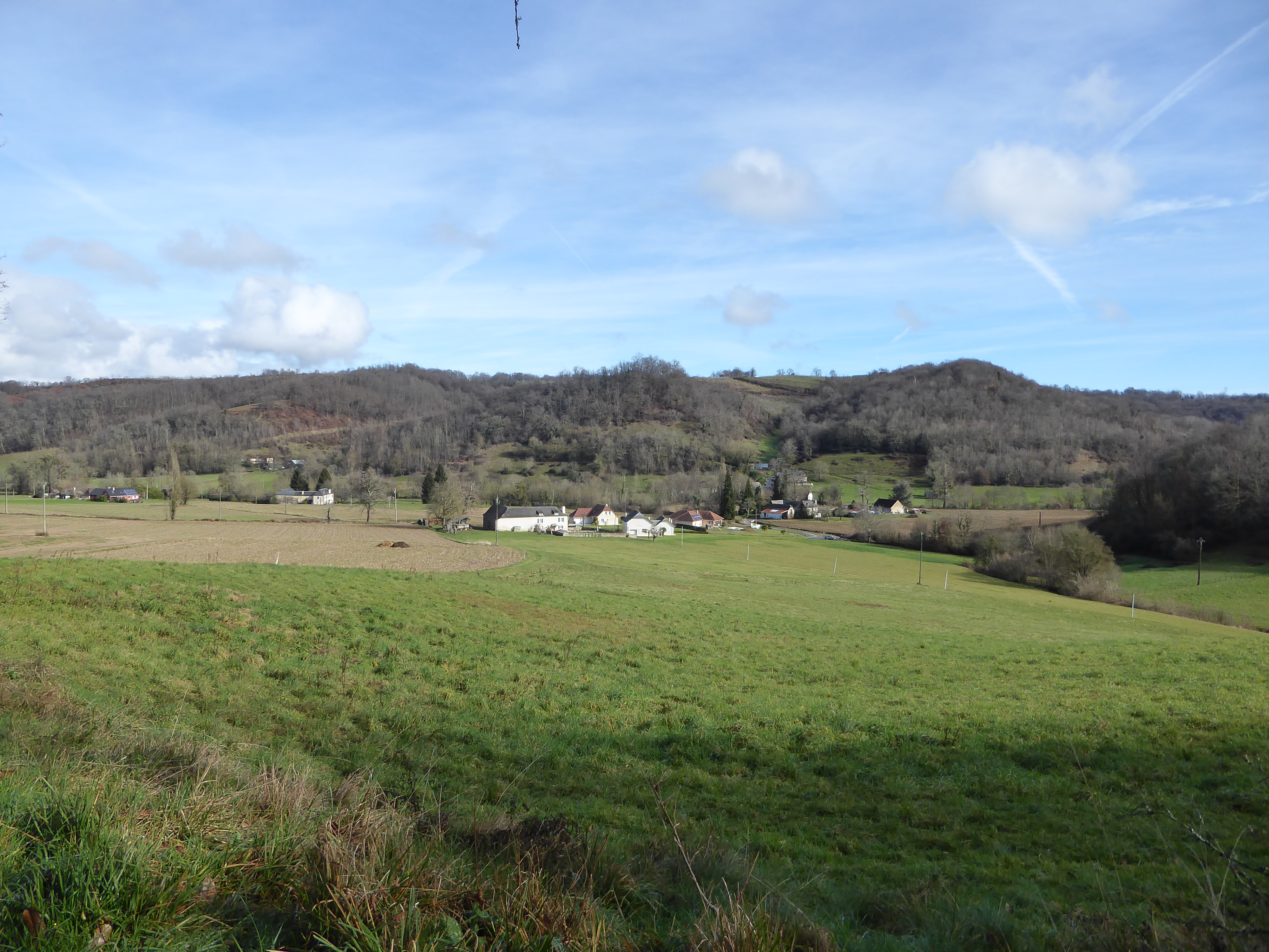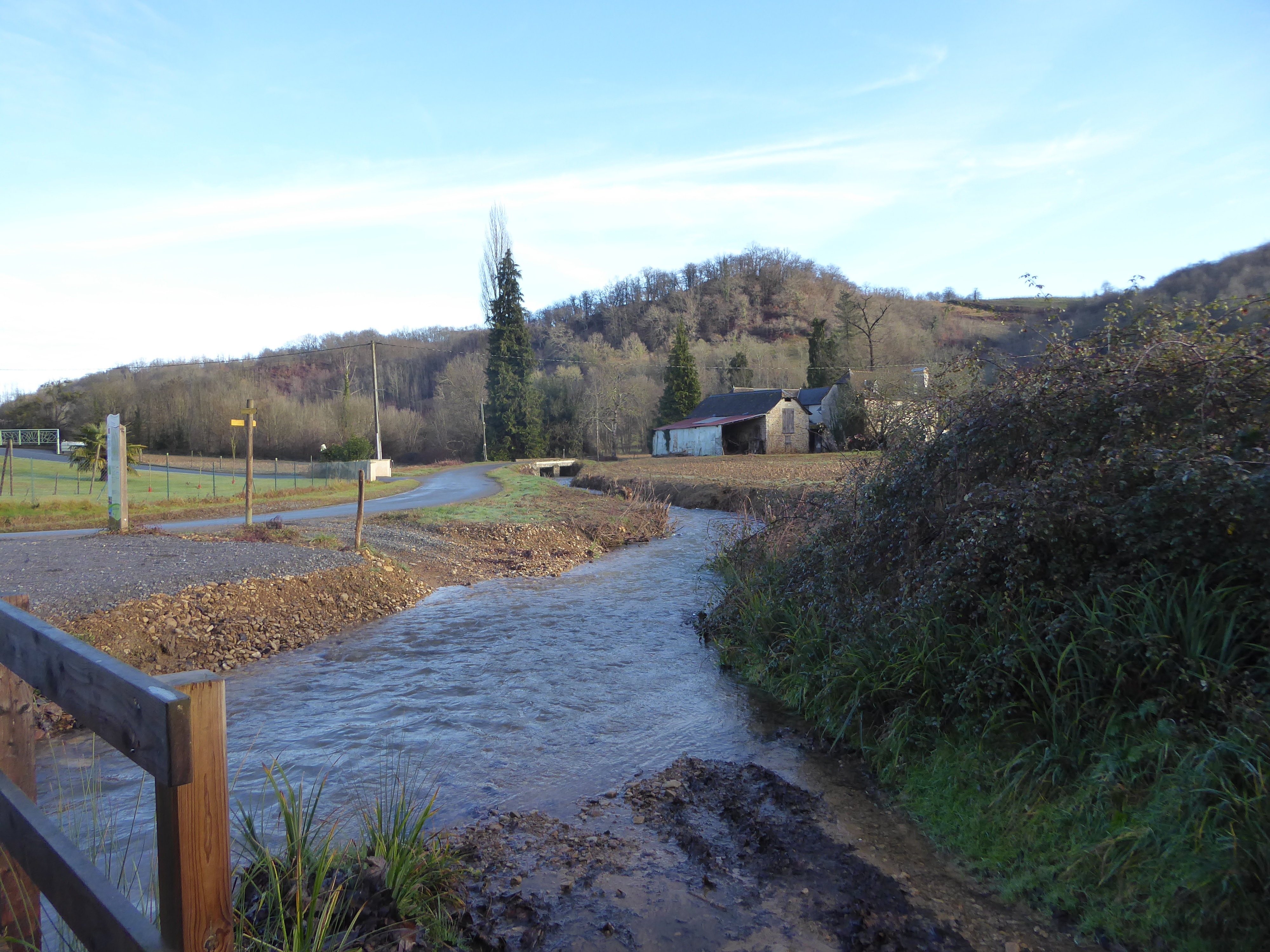 A ce croisement avec la route du départ (200 mètres après le précédent croisement), suivre cette dernière tout droit direction Pont sur la Baylongue, balisé sporadiquement en jaune