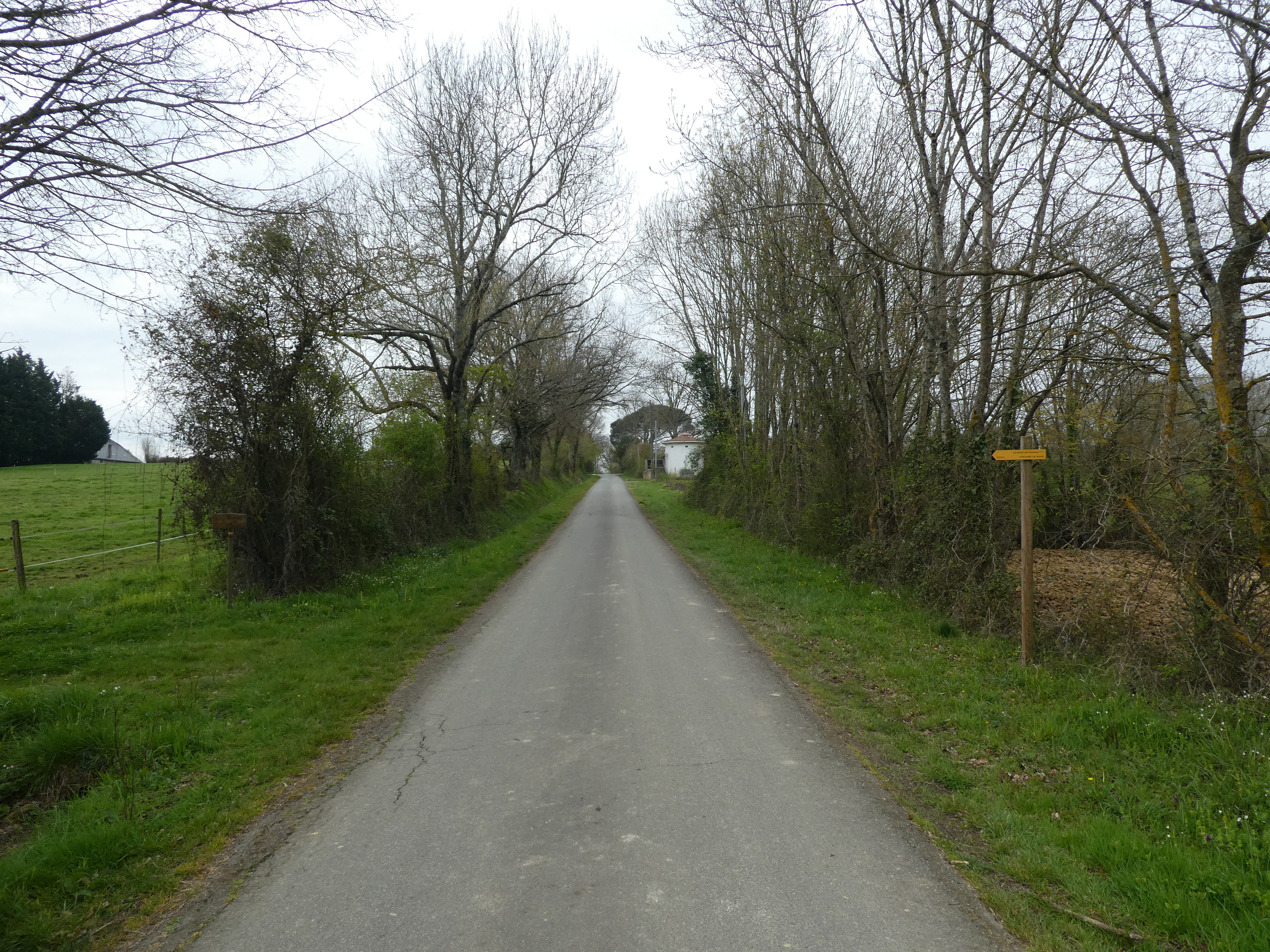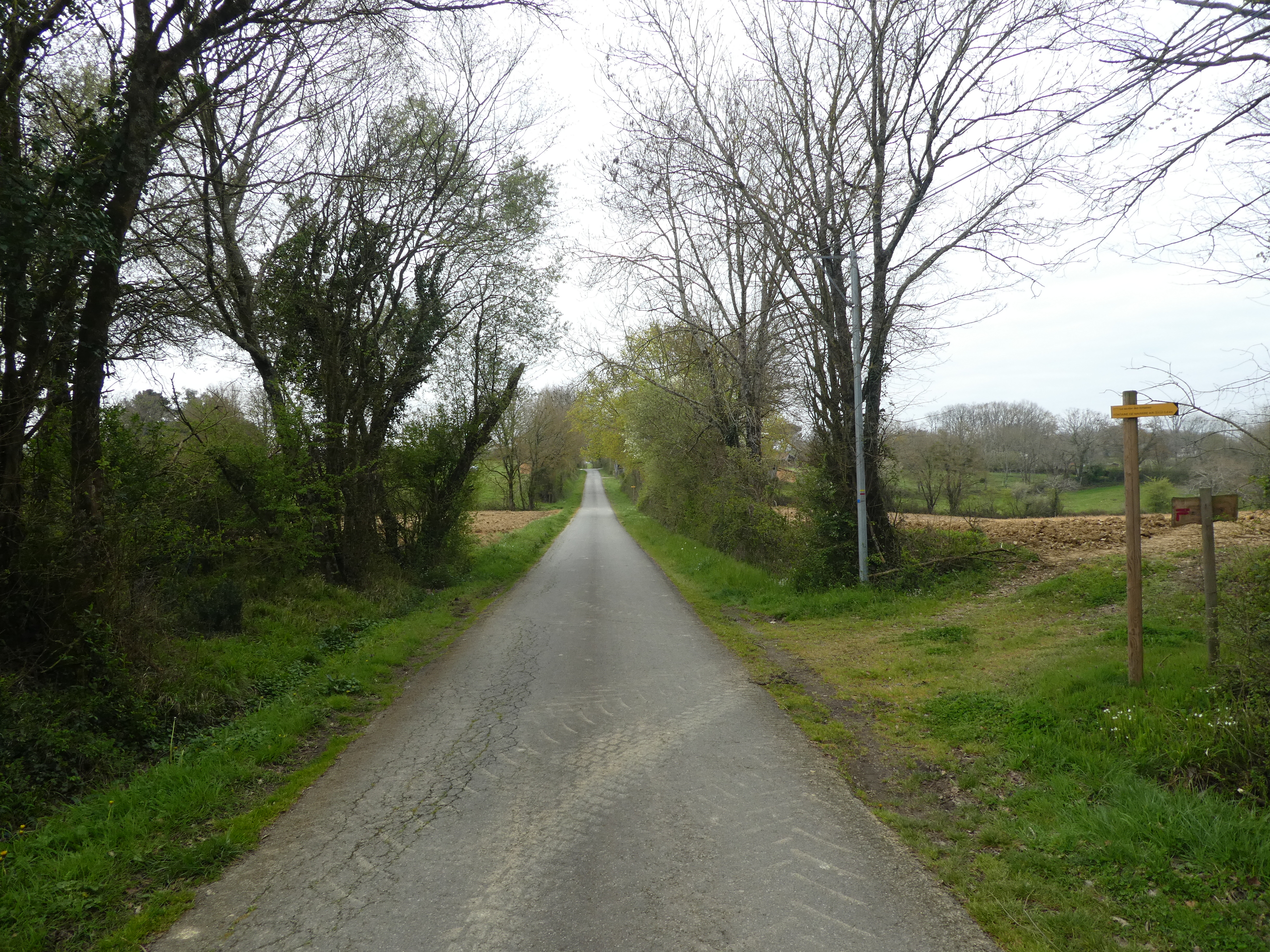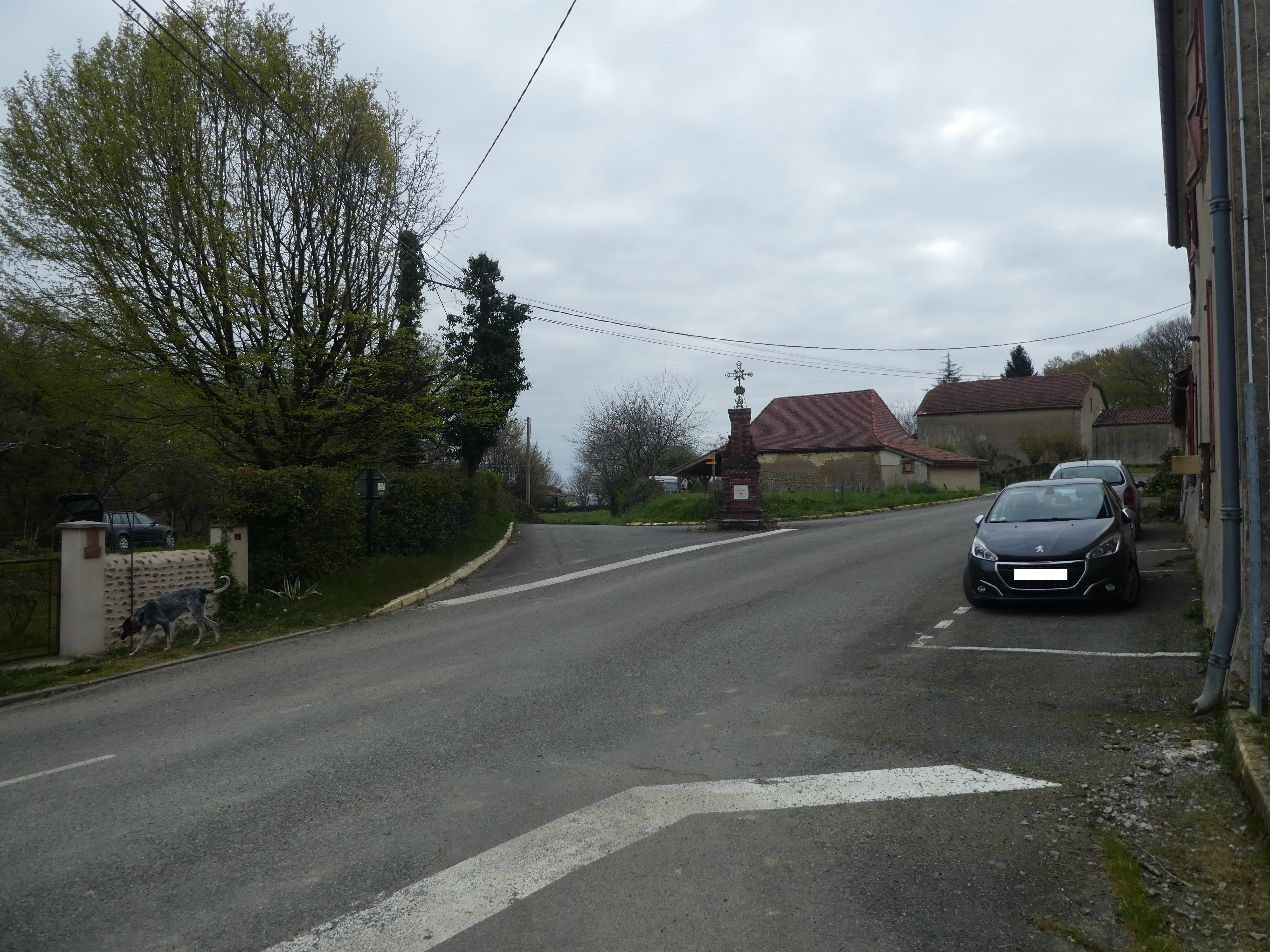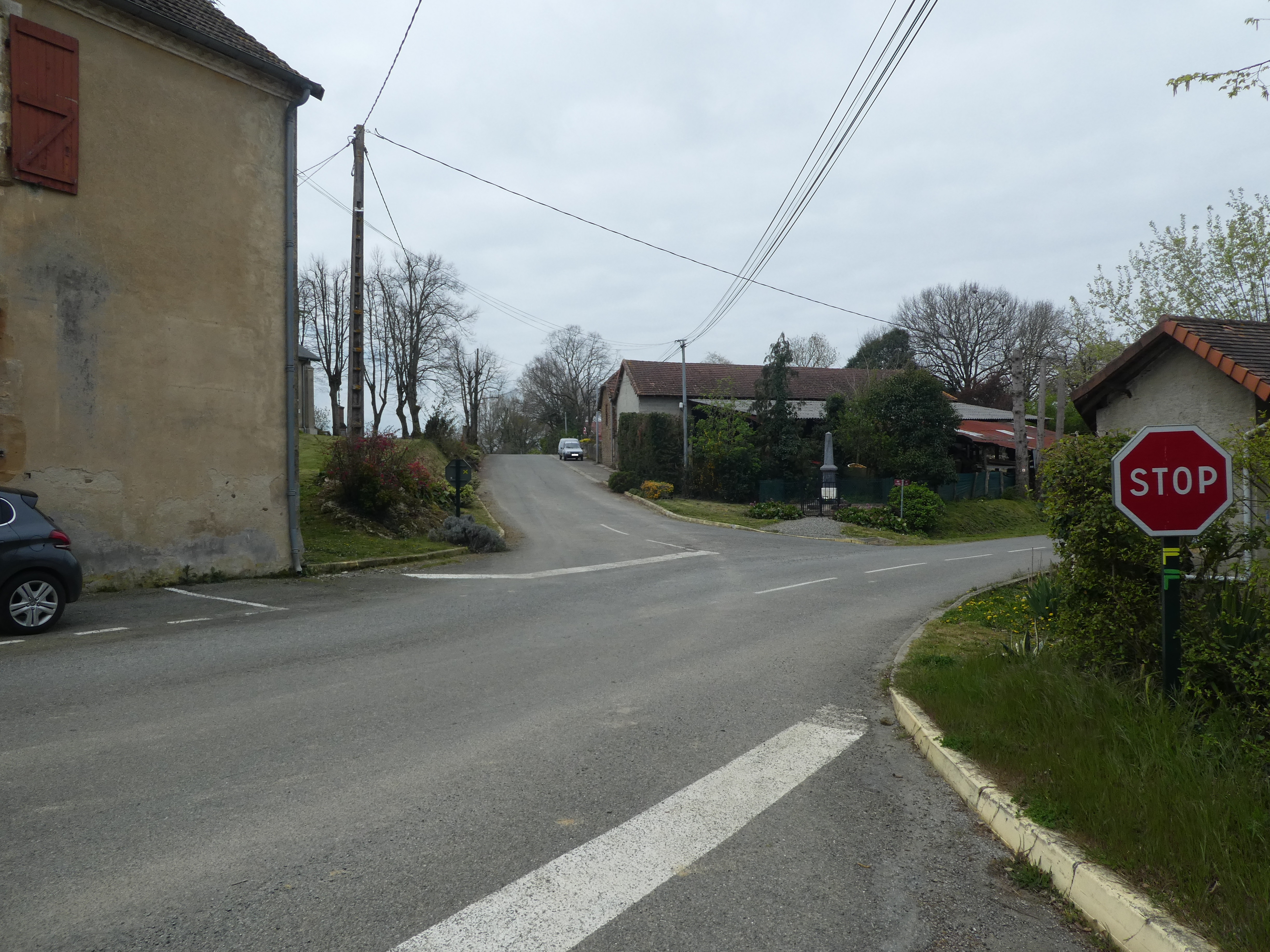 A ce croisement marqué par la présence d'un panneau directionnel (200 mètres après avoir quitté la Fontaine de Page), suivre la route montant sur la gauche direction Moncaup - Mairie, balisé en jaune