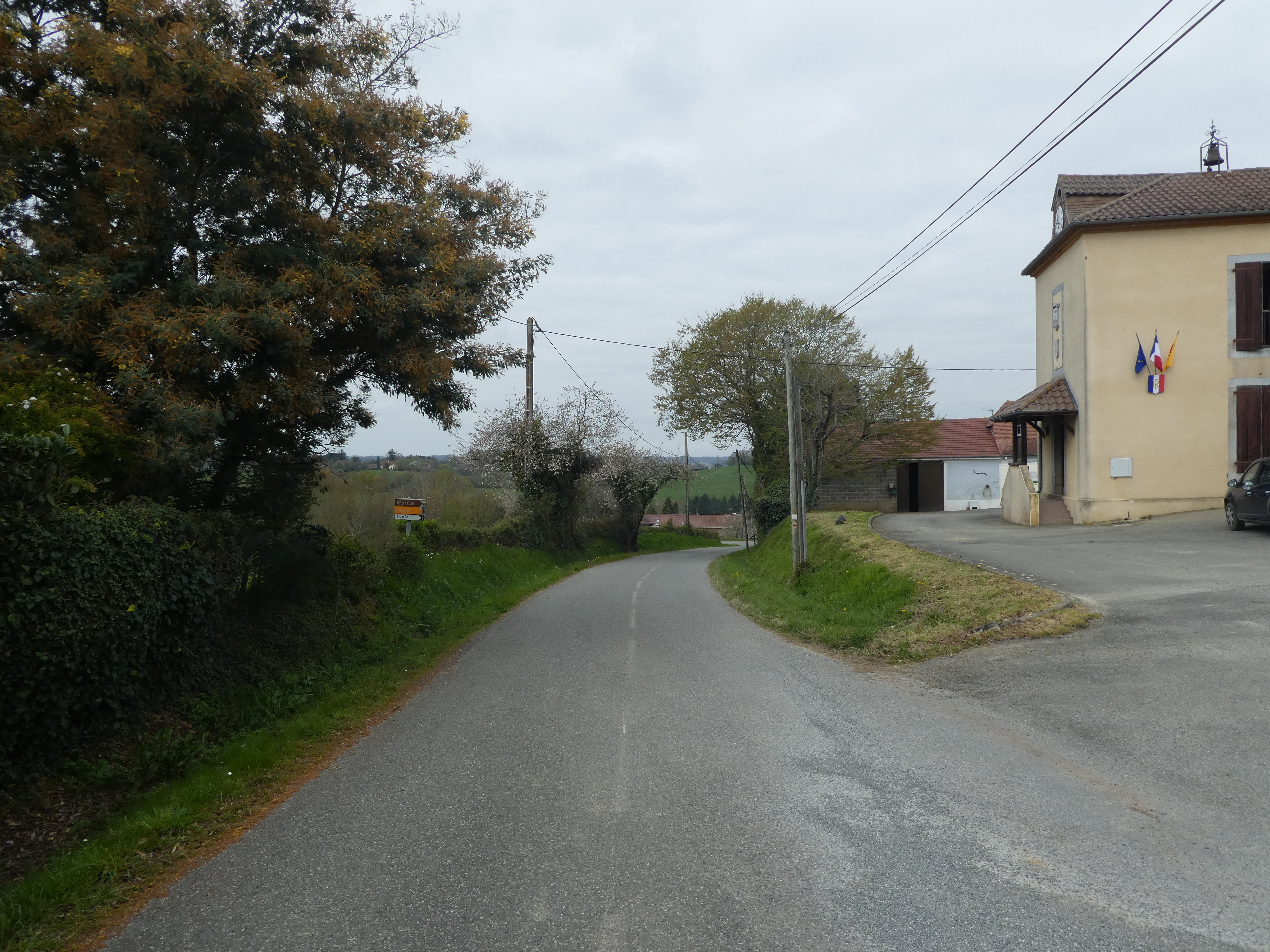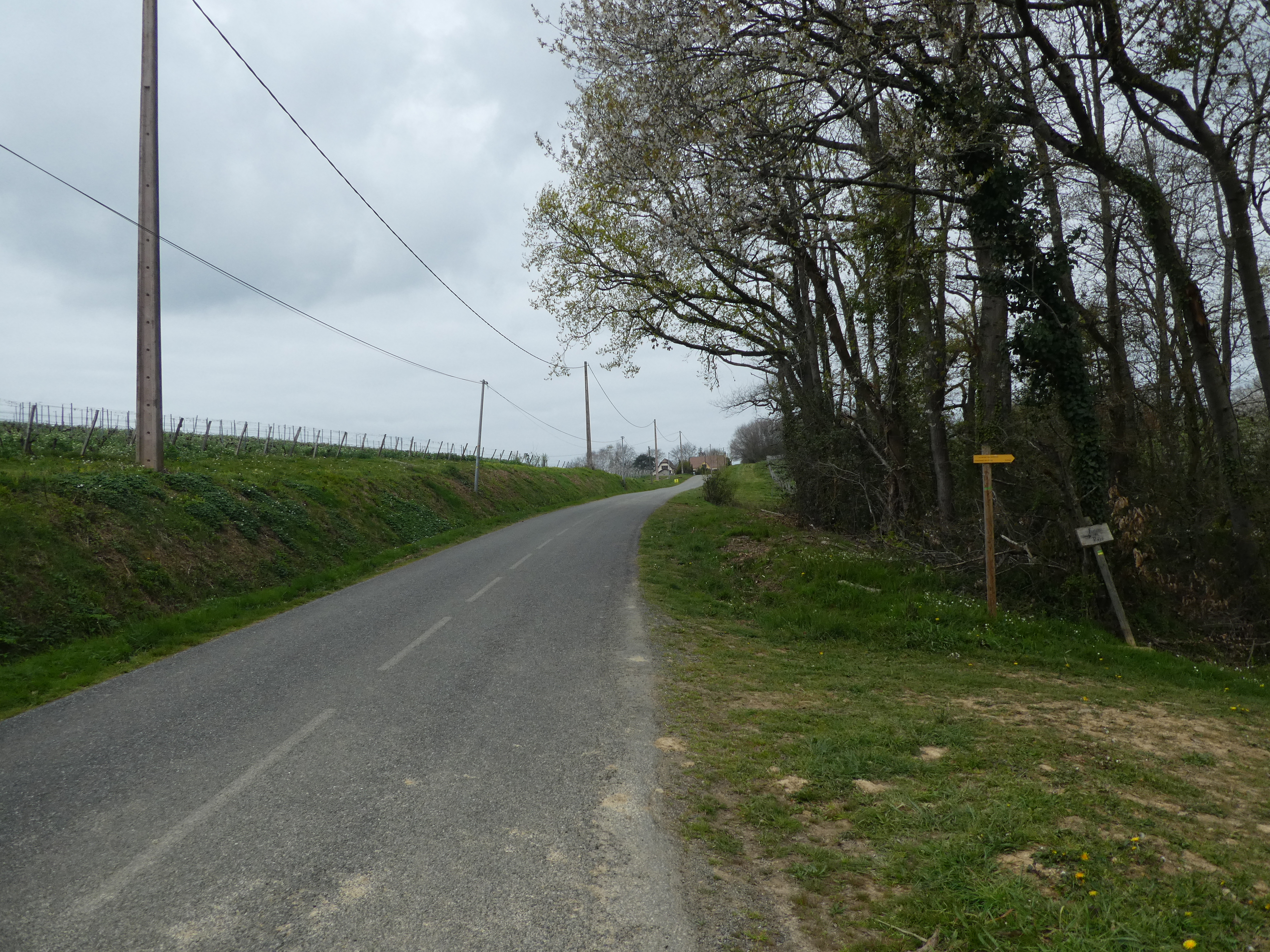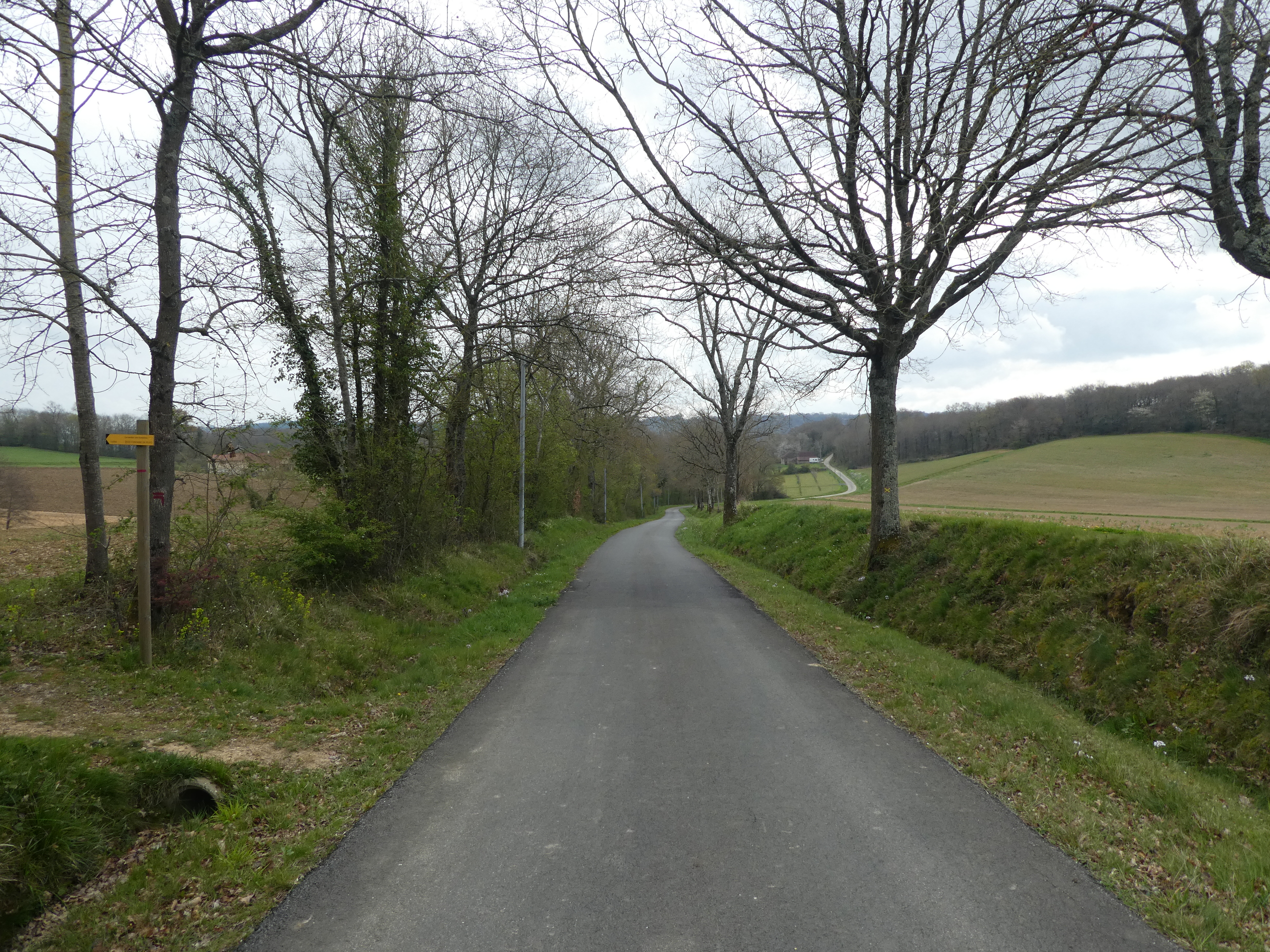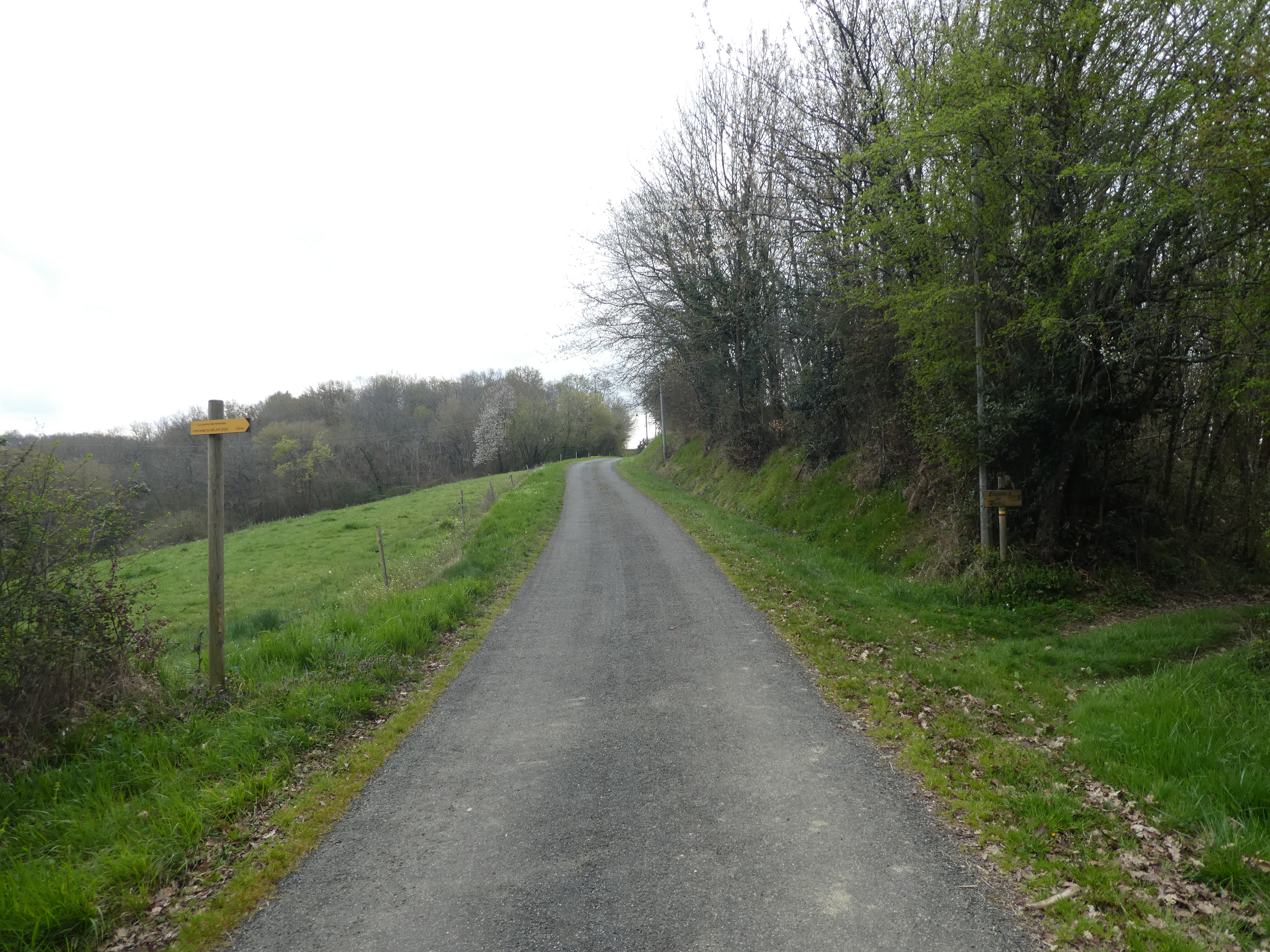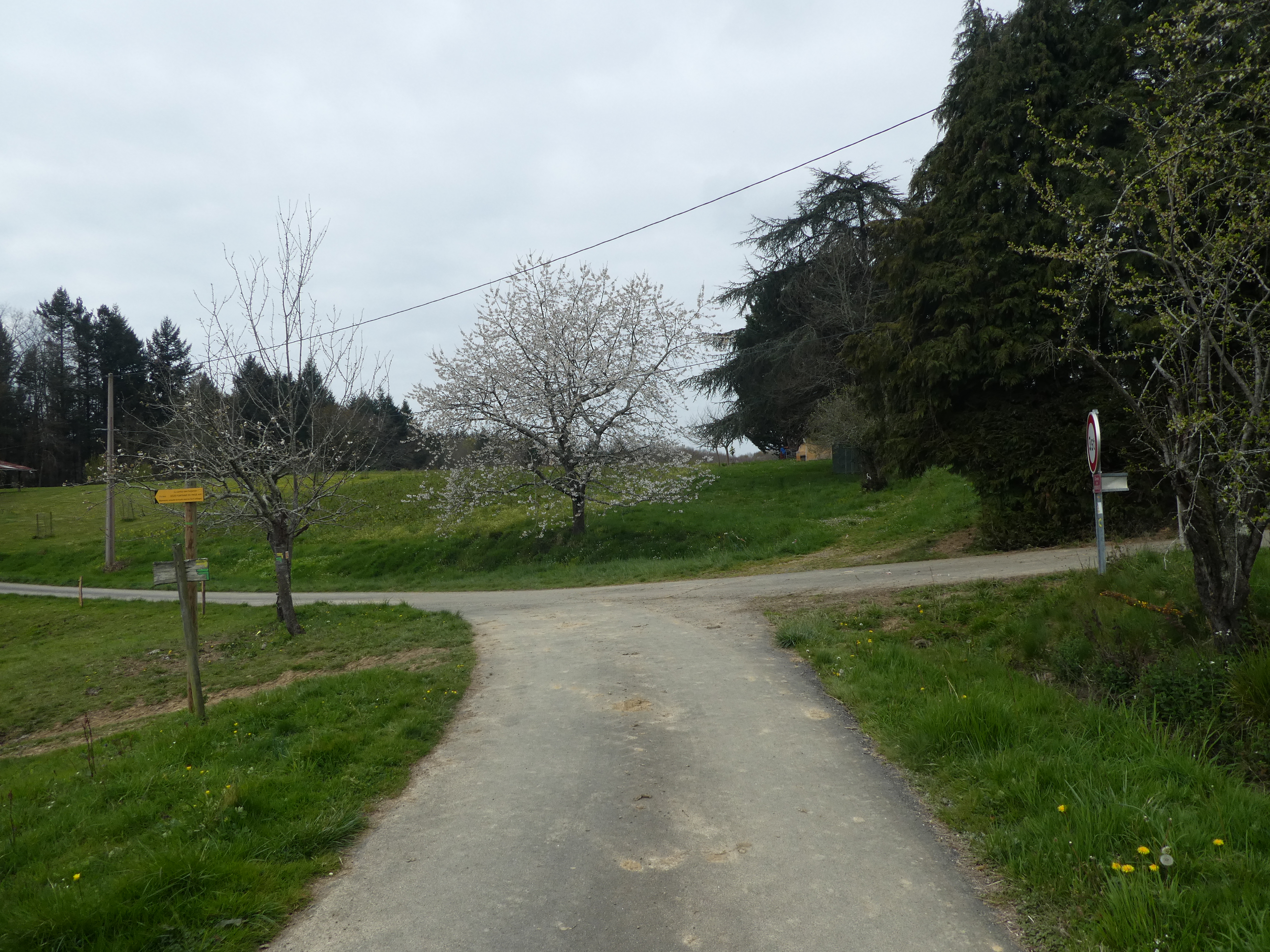 A ce croisement marqué par la présence d'un panneau directionnel (200 mètres après avoir quitté la Fontaine de Page), suivre la route montant sur la gauche direction Moncaup - Mairie, balisé en jaune