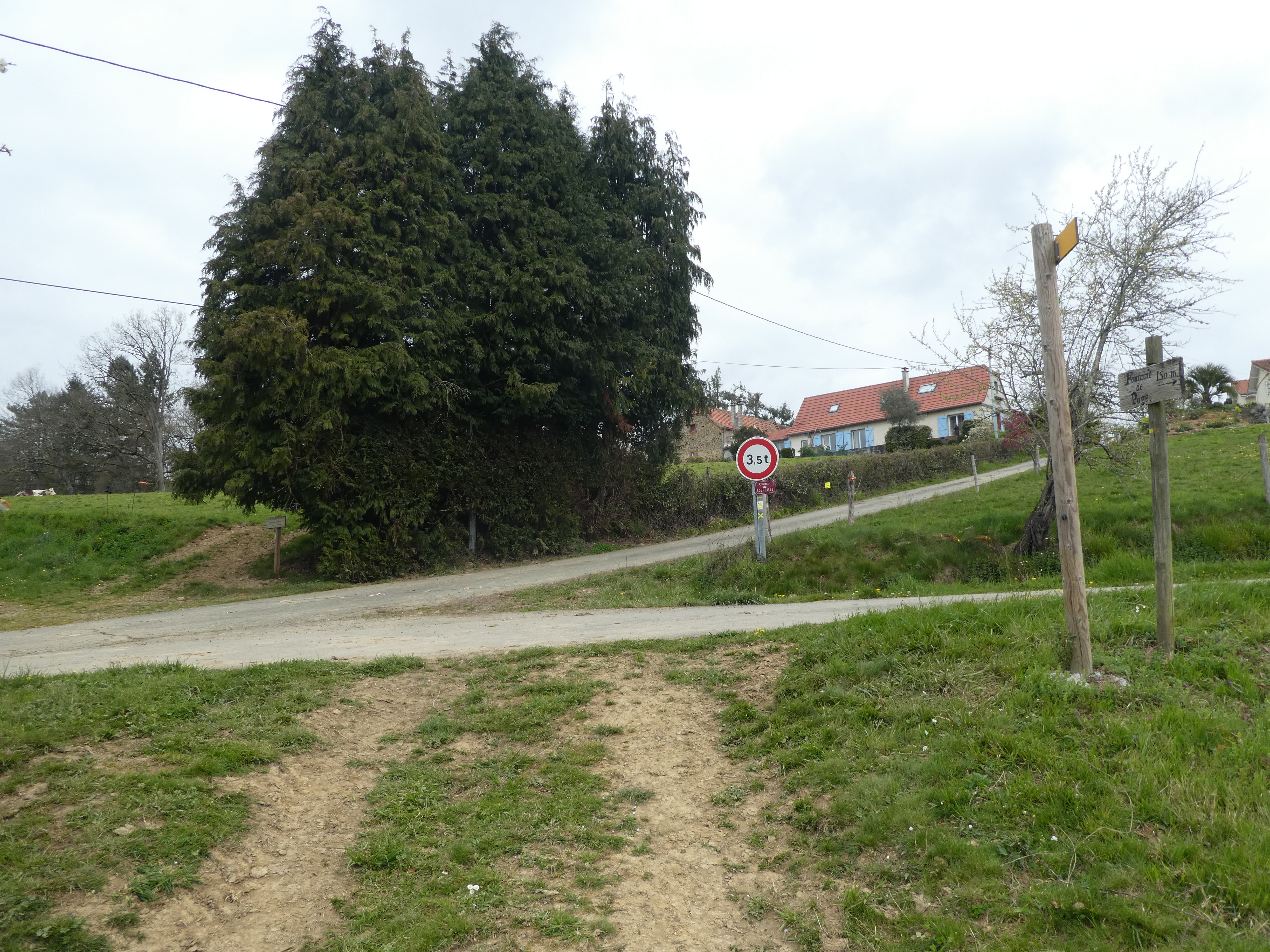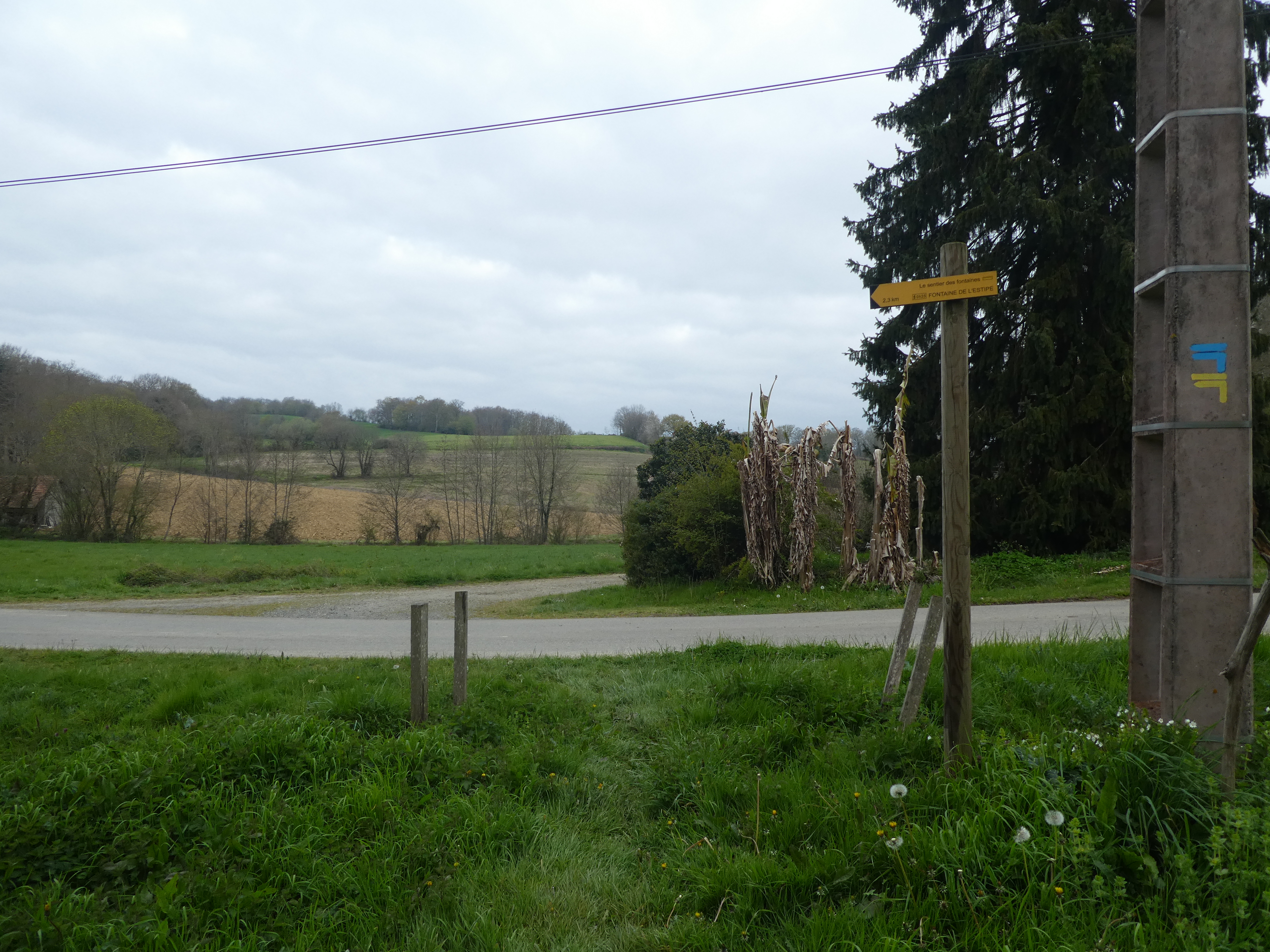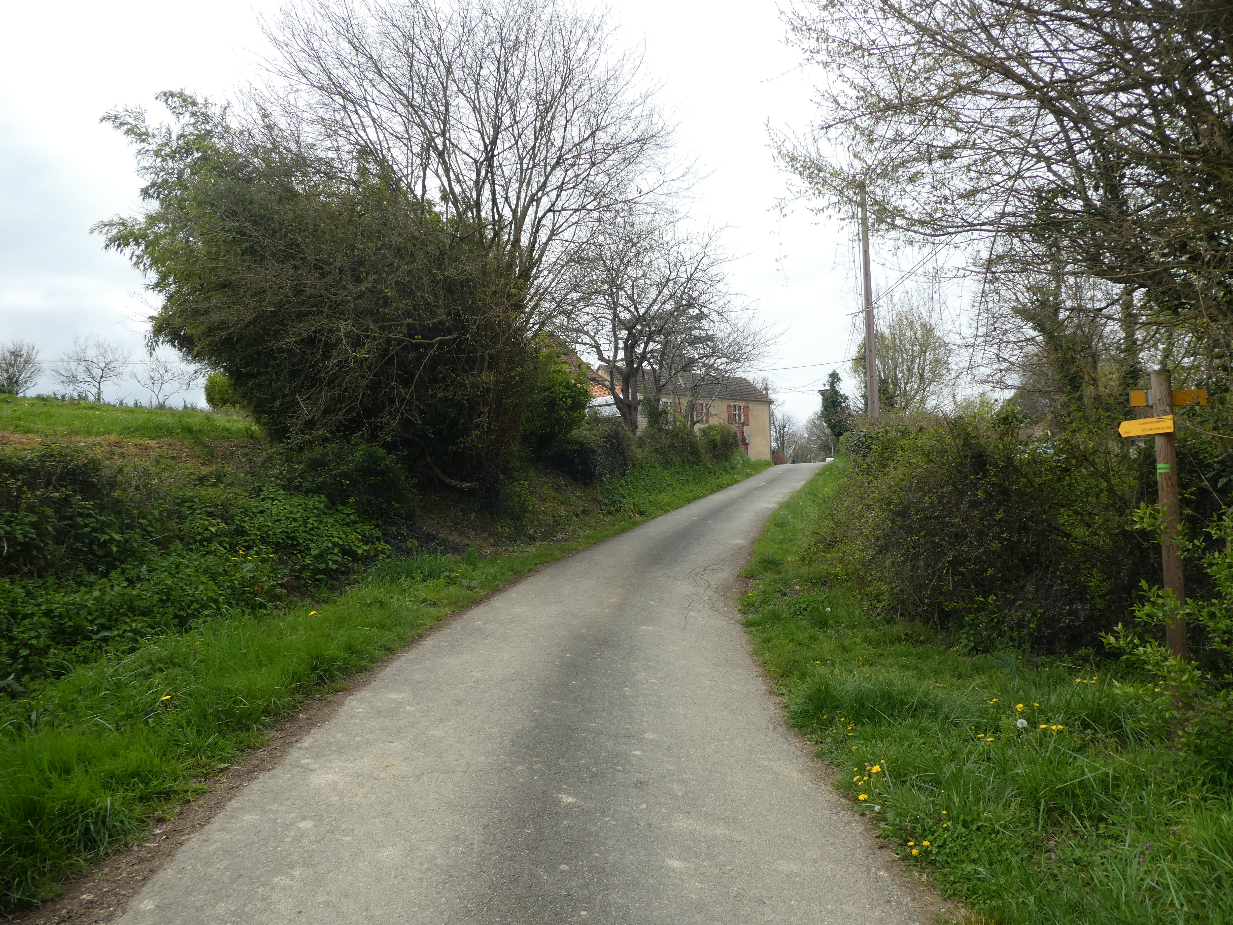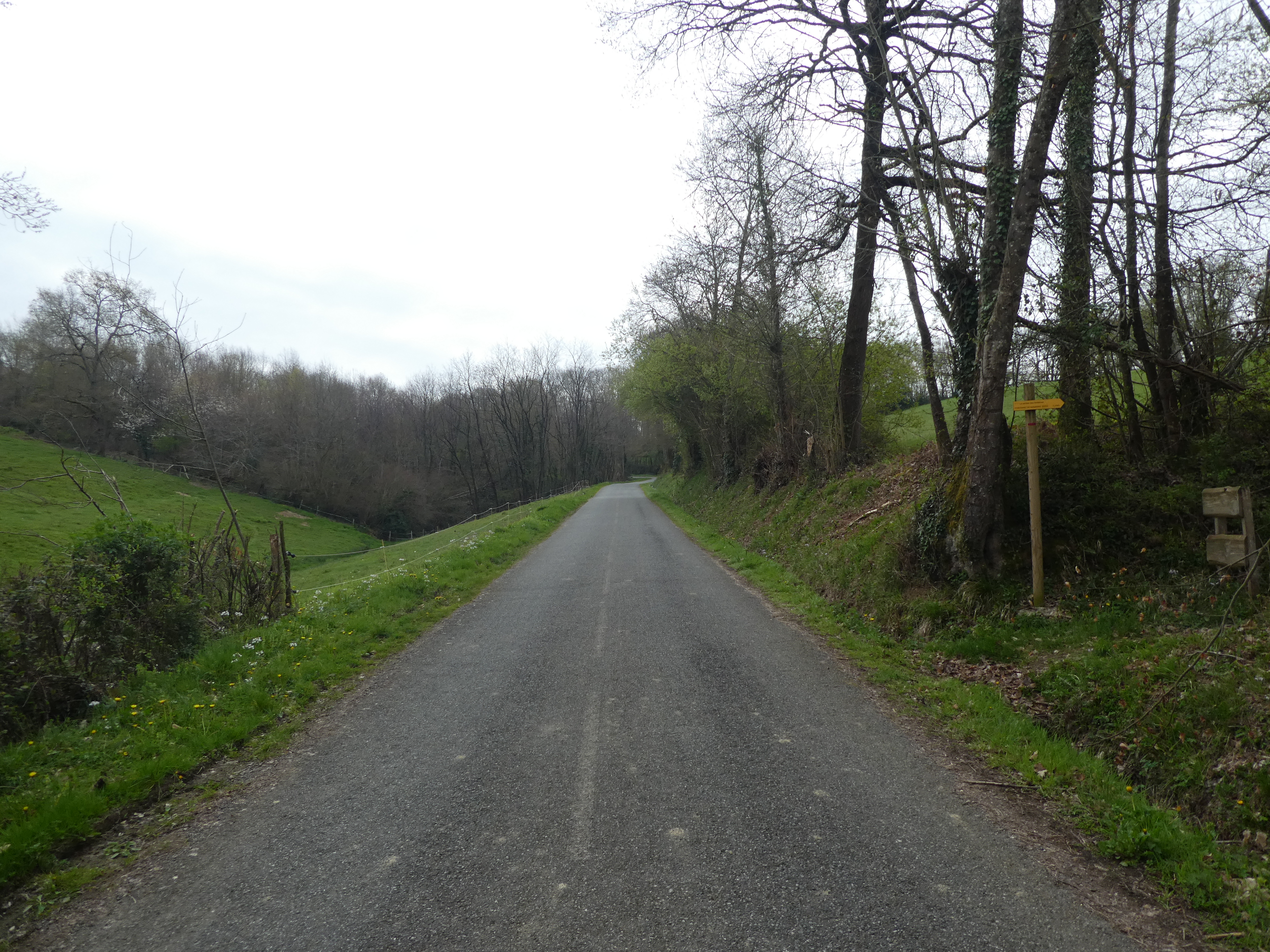 A ce croisement marqué par la présence d'un panneau directionnel (200 mètres après avoir quitté la Fontaine de Page), suivre la route montant sur la gauche direction Moncaup - Mairie, balisé en jaune