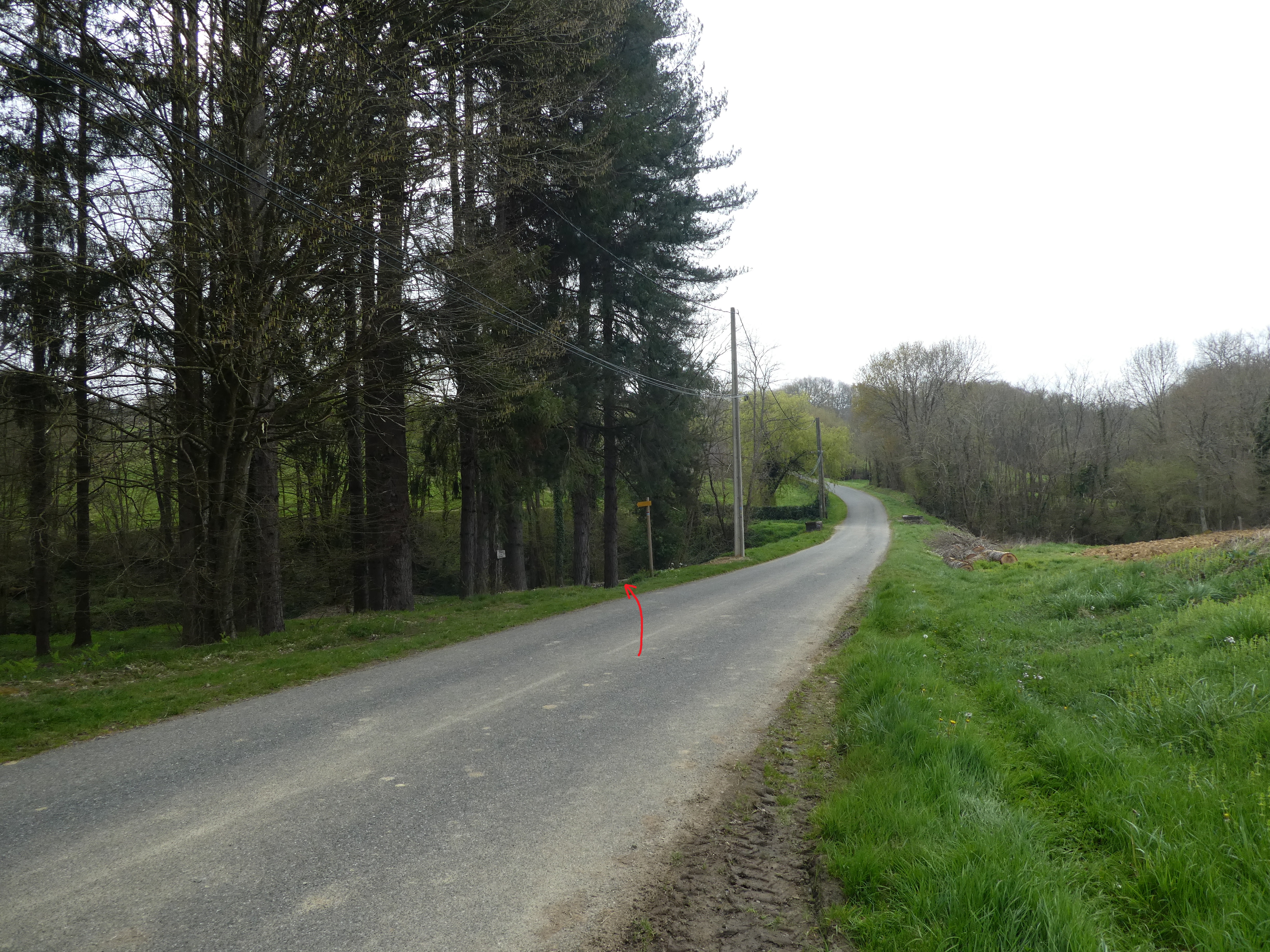 A cette intersection marquée par la présence d'un panneau directionnel (350 mètres après le départ) (276 m), suivre la route partant tout droit direction Fontaine de Floris, balisé en jaune