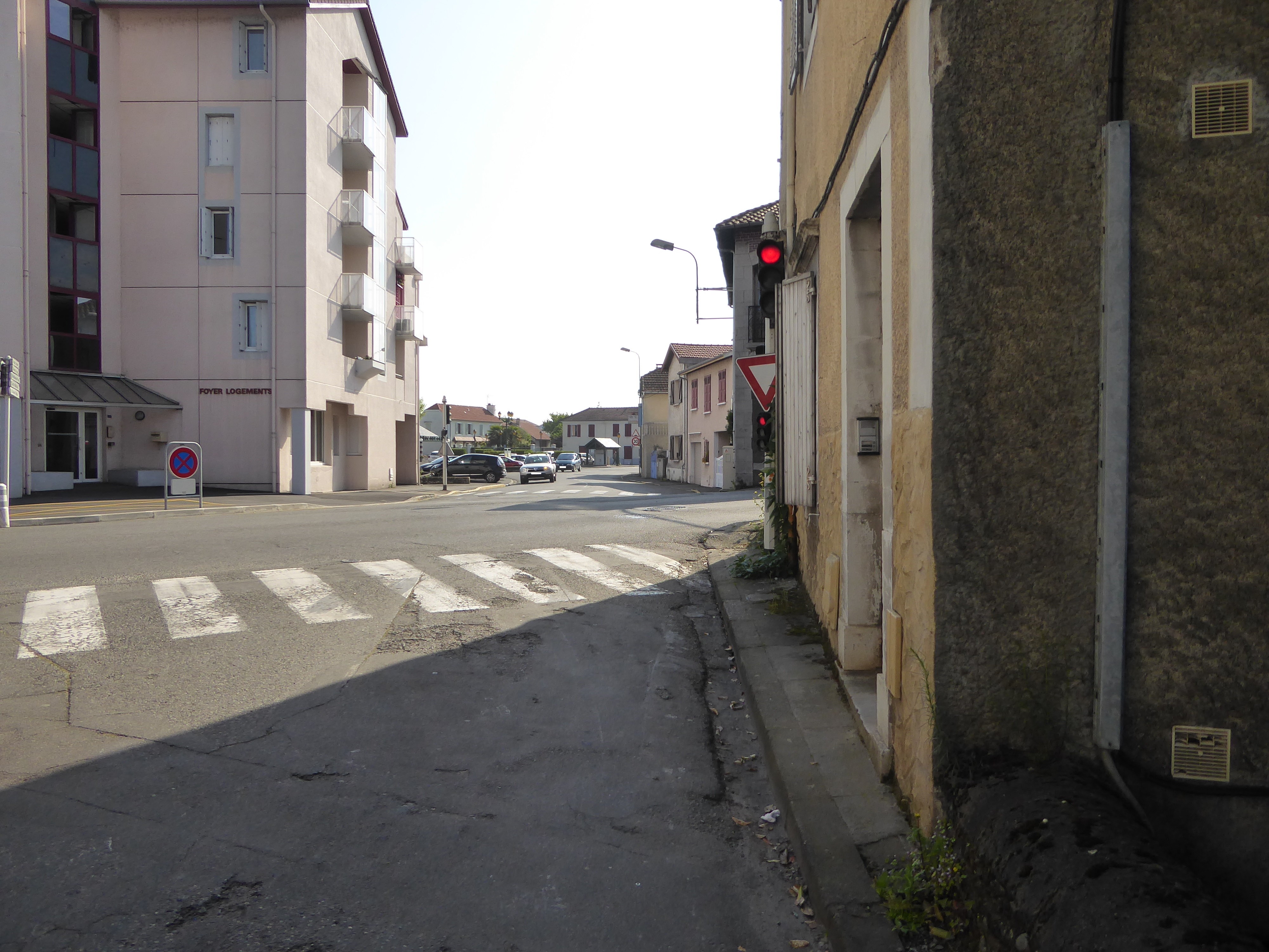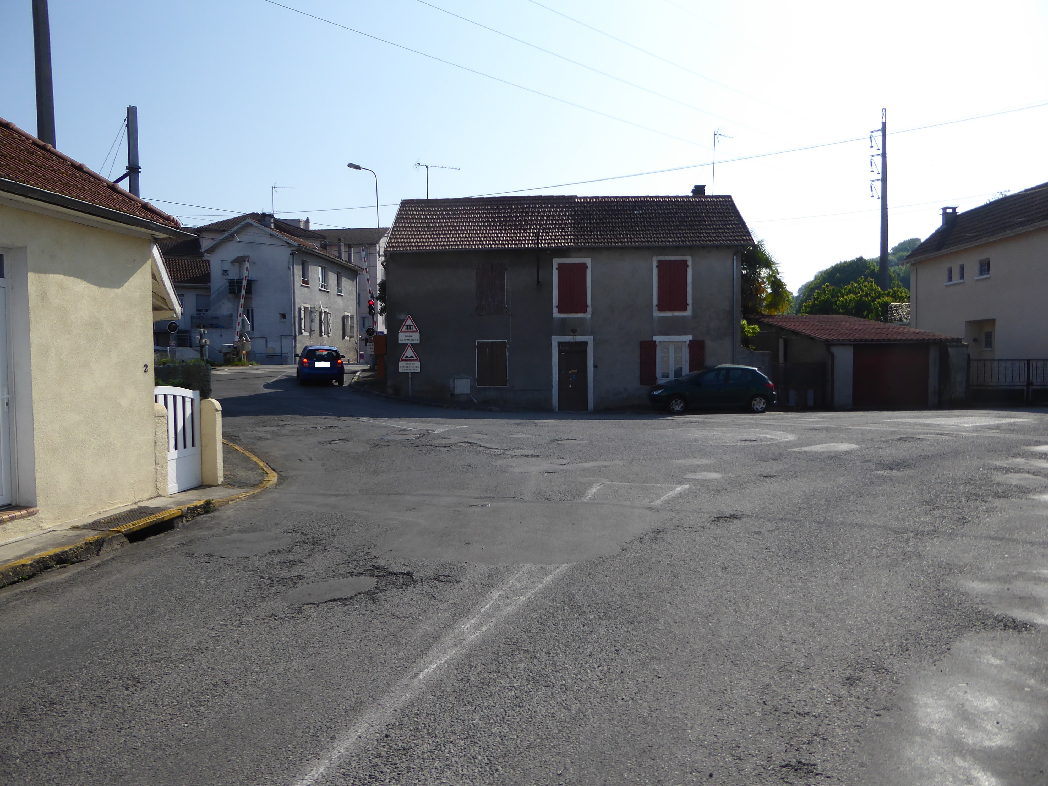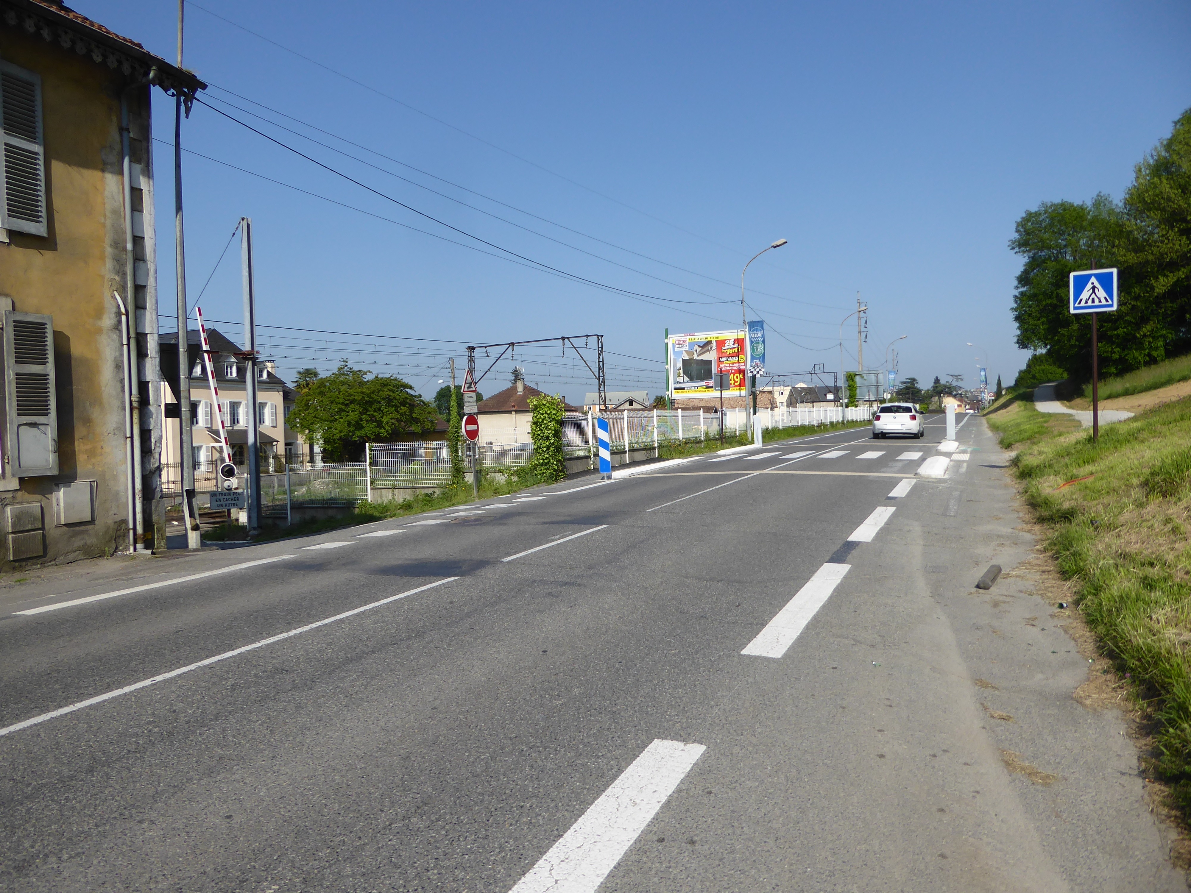 A cette intersection (200 mètres après avoir rejoint la route), suivre la rue descendant sur la gauche et traversant la voie ferrée direction Stade de Mazères-Lezons