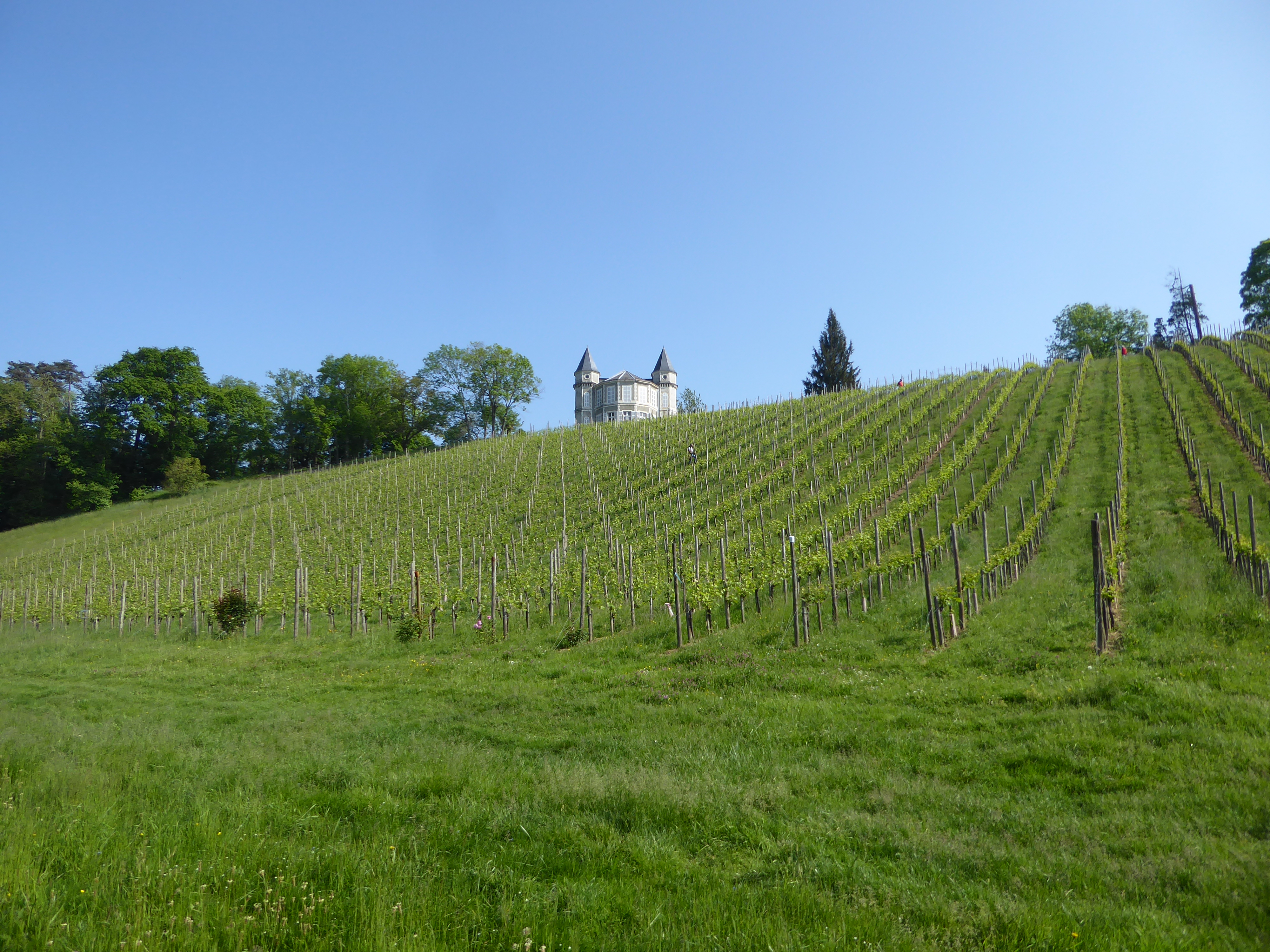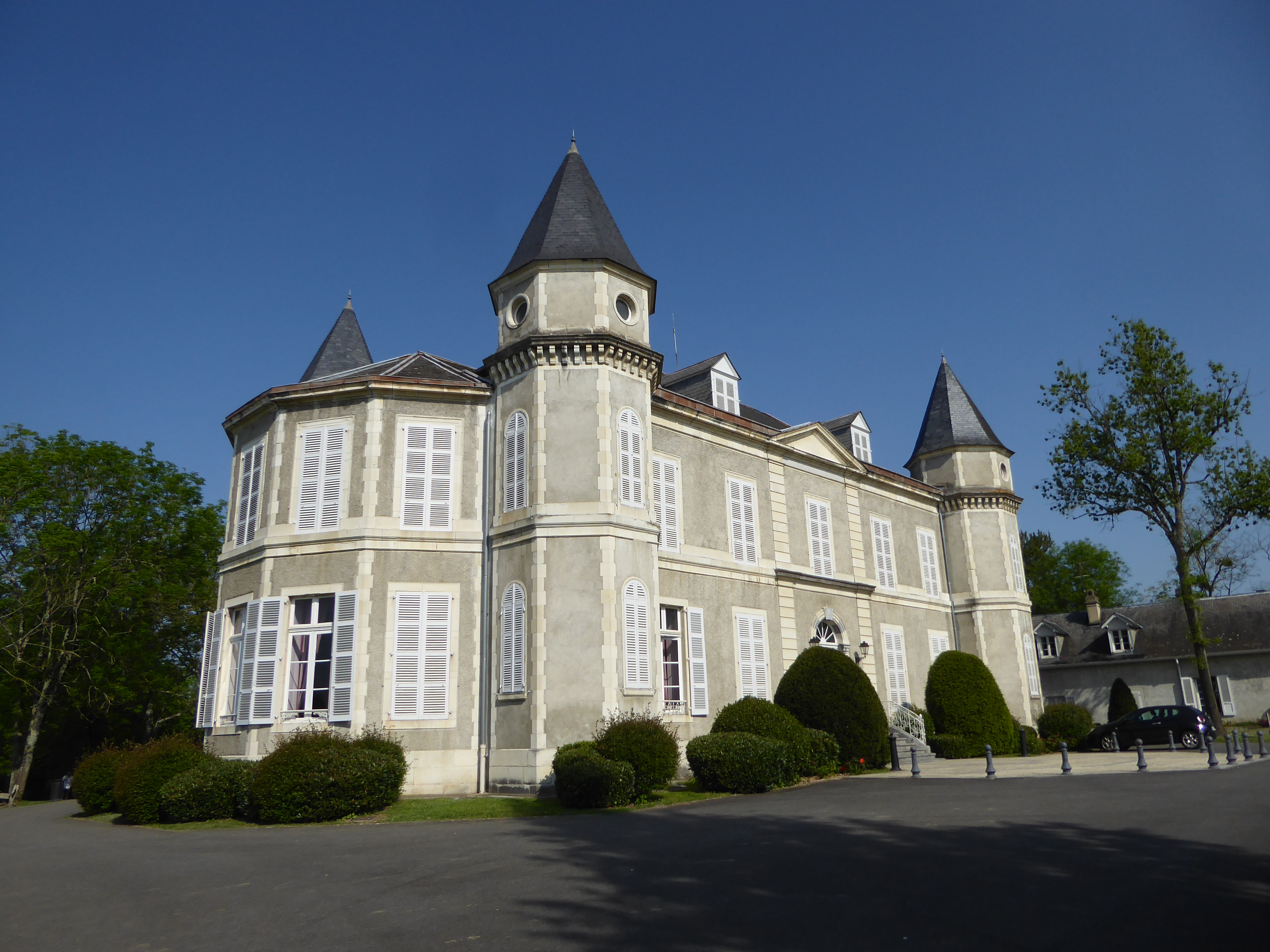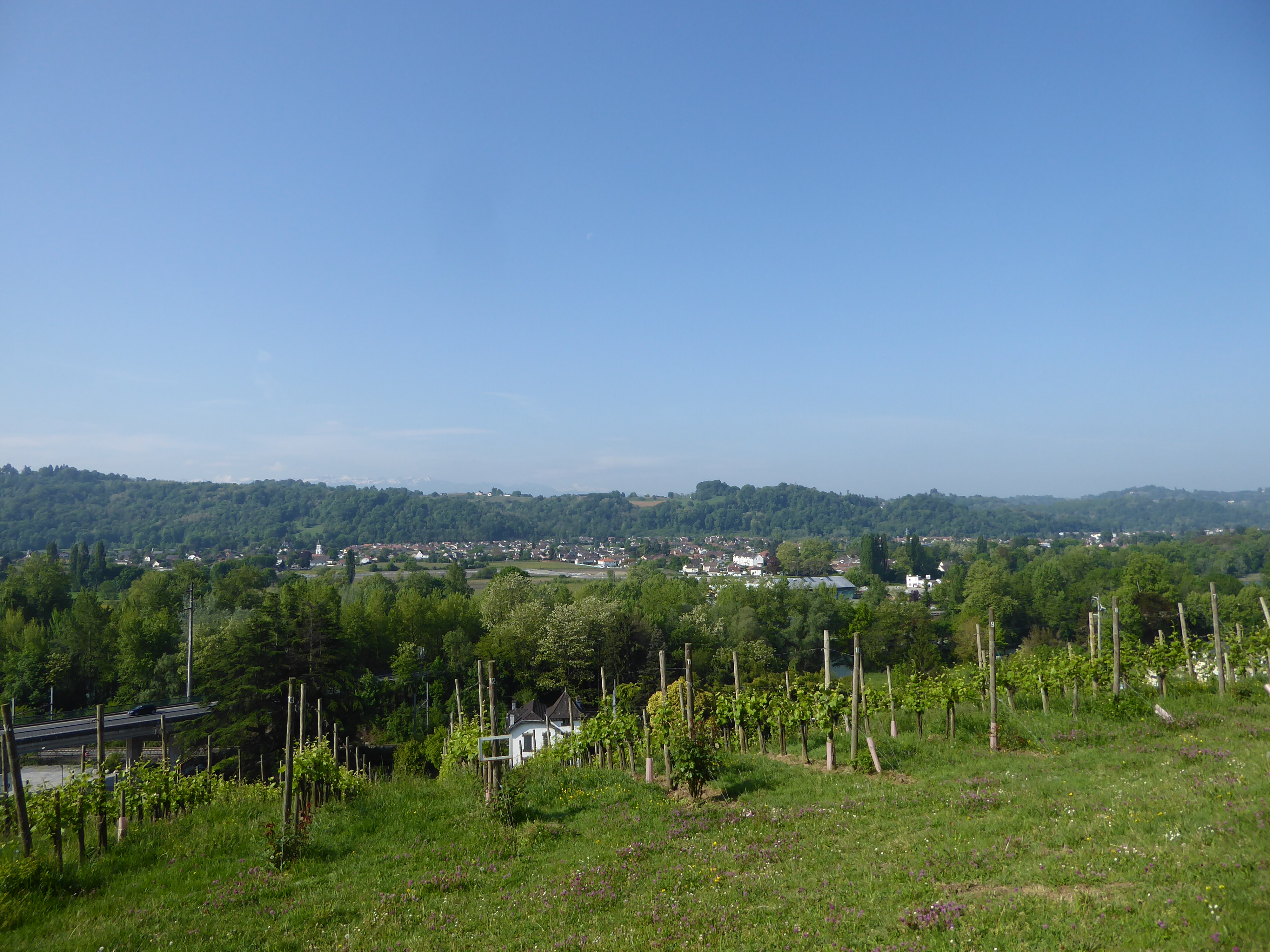 Arrivée au Château de Franqueville (225 m) : beau point de vue sur la Vallée du Gave de Pau du Pays de Nay jusqu'au Jurançonnais ; les sommets bigourdans et béarnais sont également bien visibles