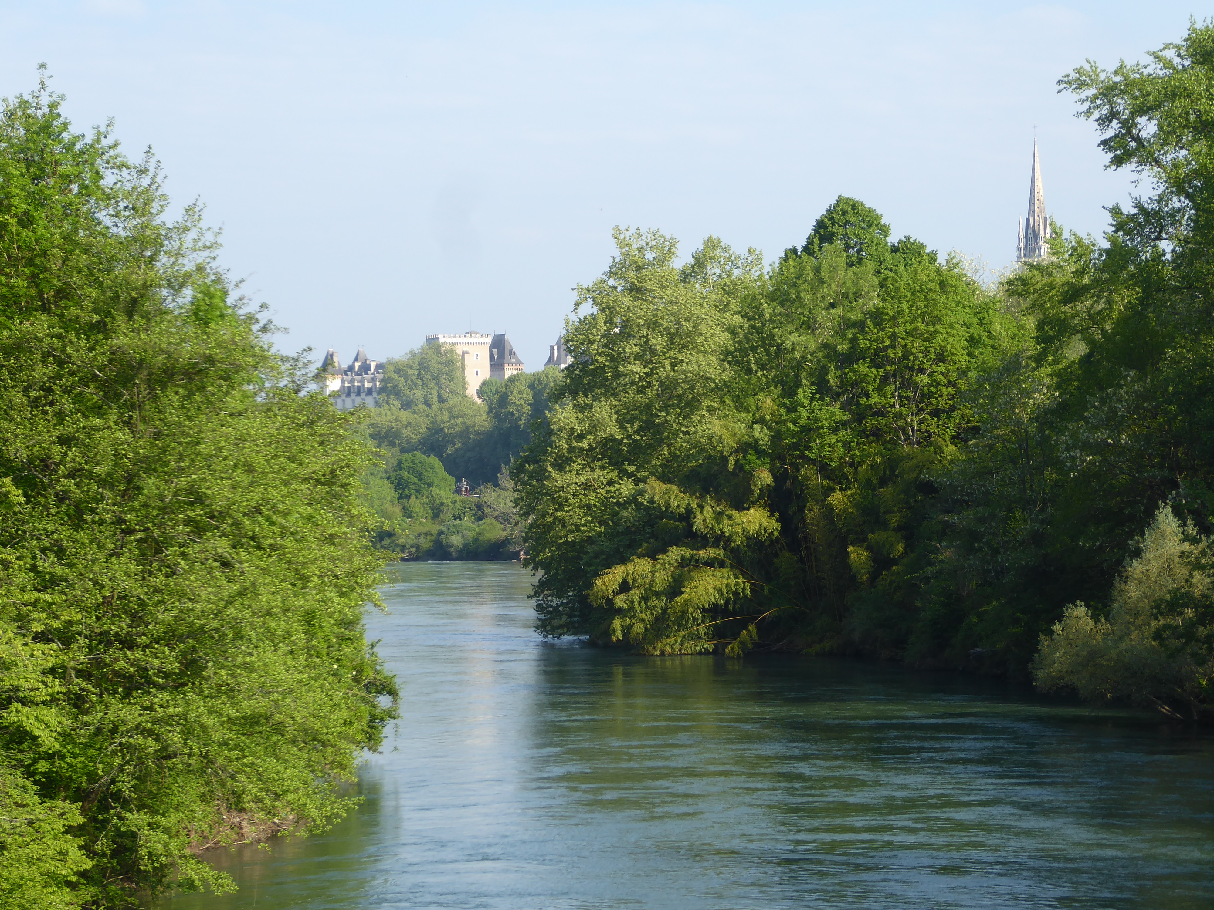 A ce croisement (50 mètres après la barrière), suivre le chemin partant tout droit et longeant le Gave de Pau (ne pas emprunter cette passerelle) direction Stade d'eaux vives