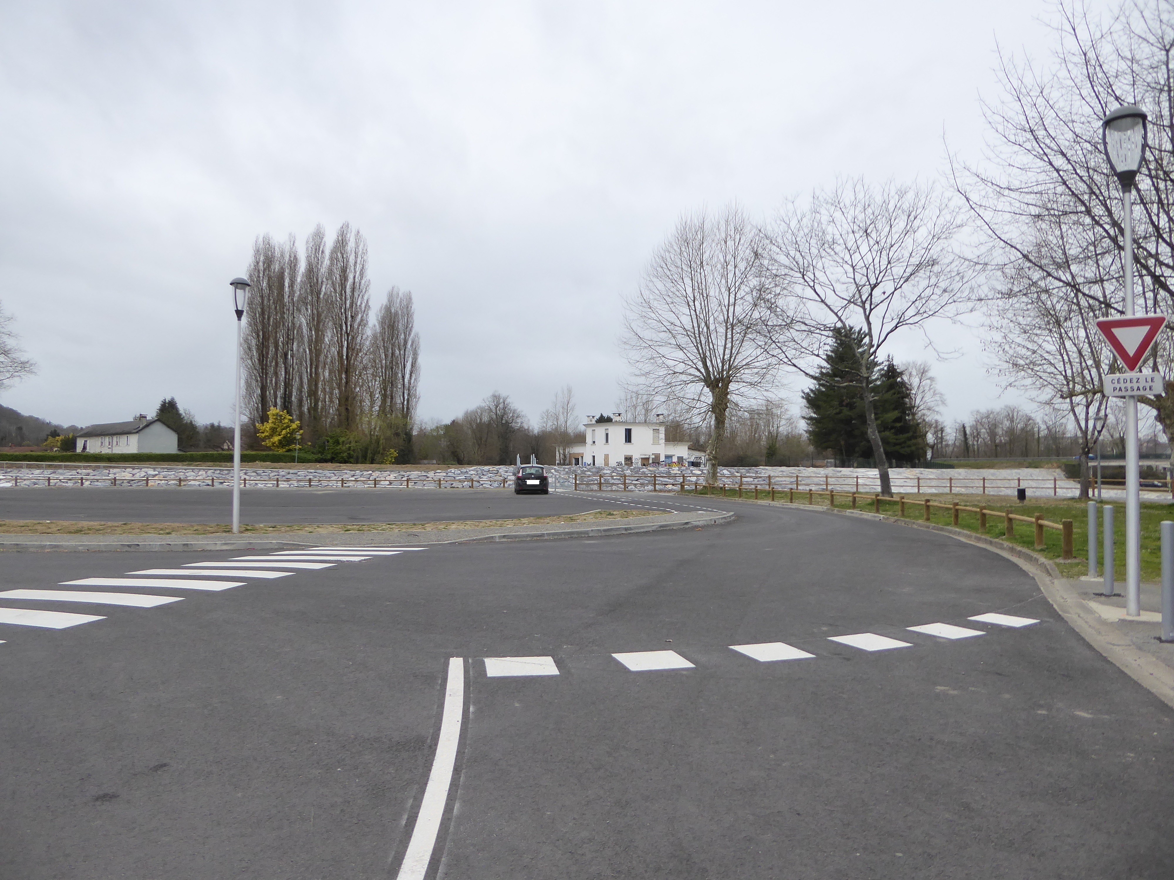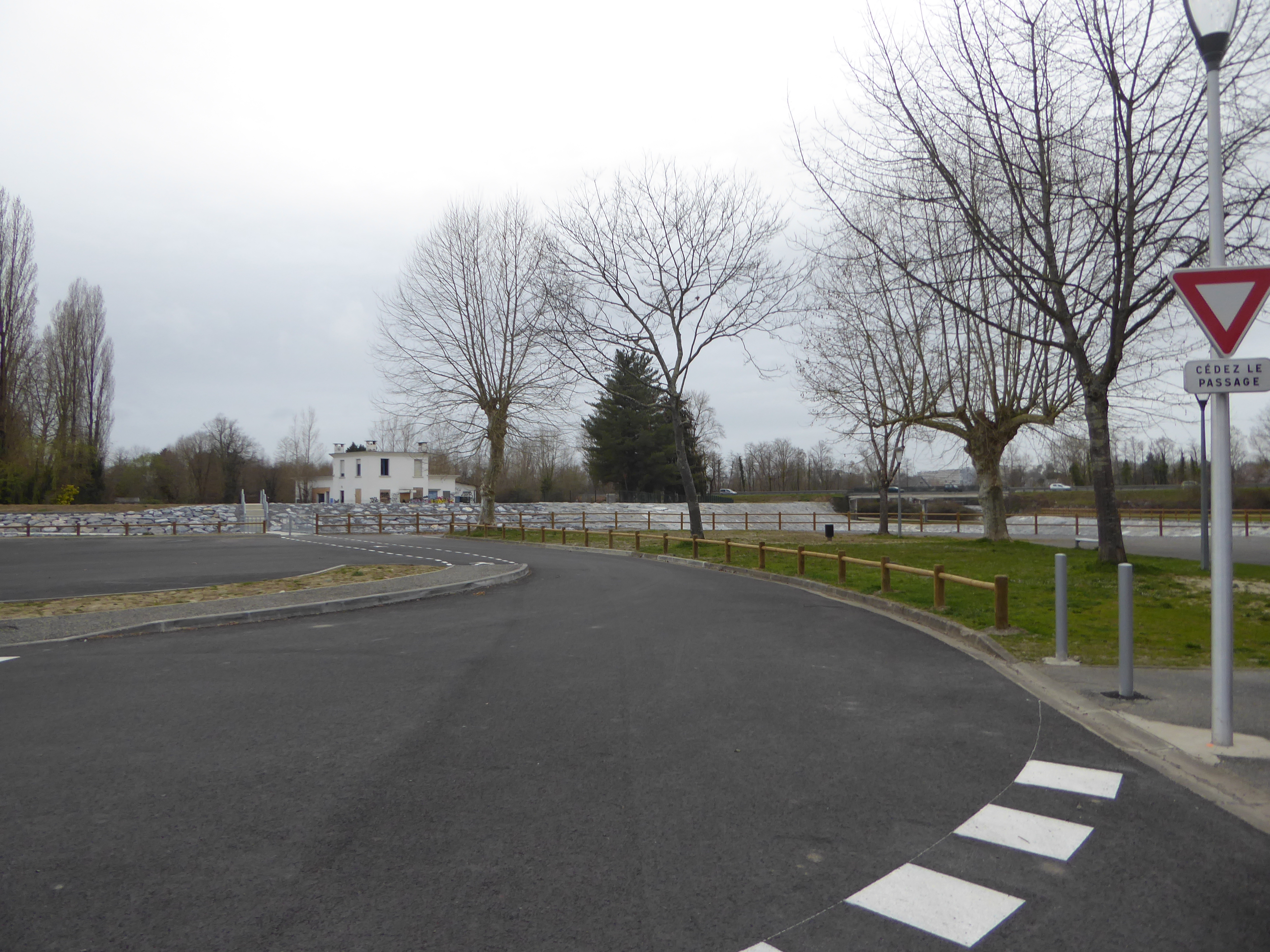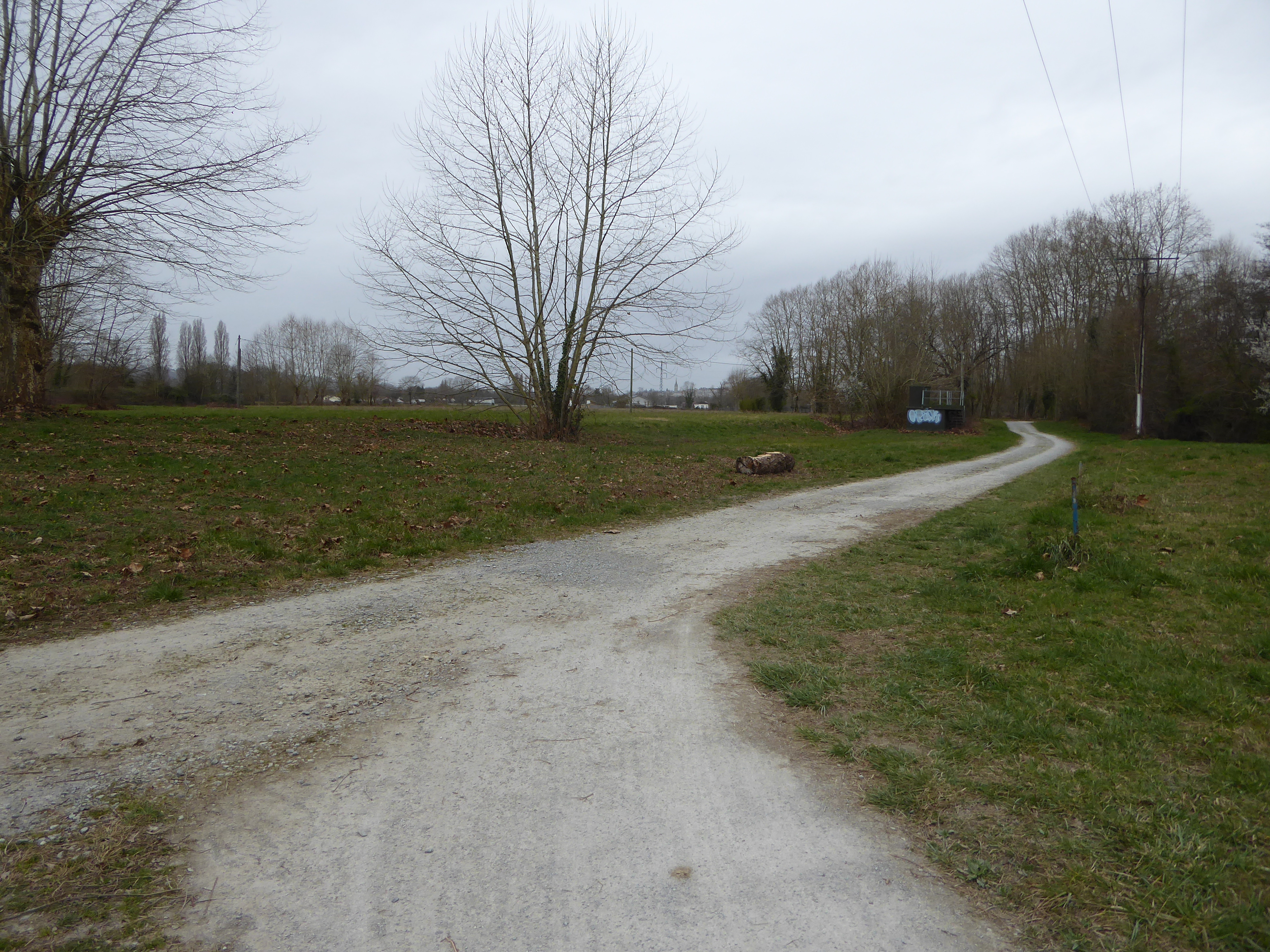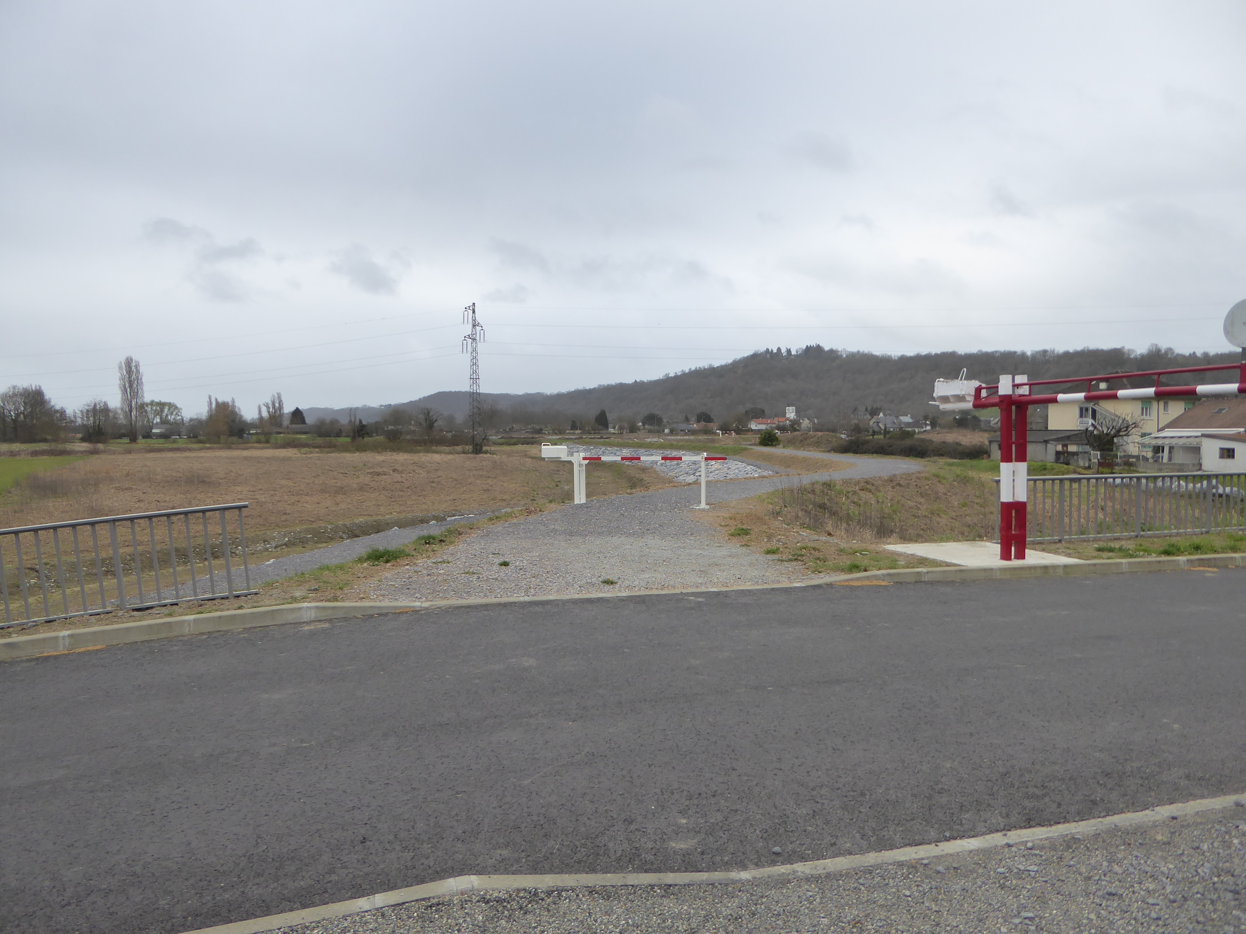 Départ Stade de Mazères-Lezons (183 m) : suivre la route partant tout droit puis continuer sur la gauche en longeant la nouvelle digue direction Pouchan, aucun balisage