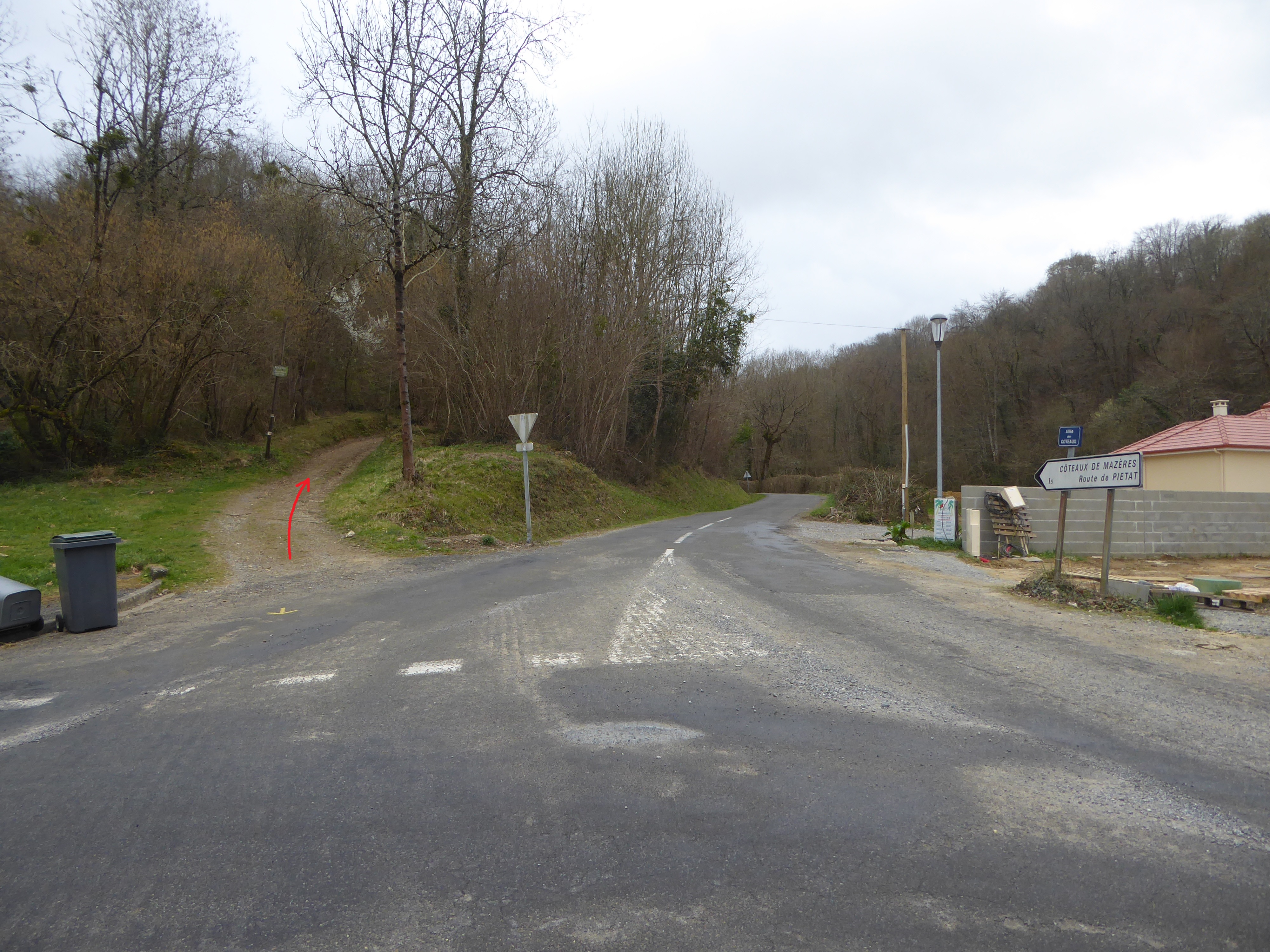 A ce croisement (650 mètres après le précédent), suivre le chemin mal tracé partant sur la gauche direction Stade de Mazères-Lezons