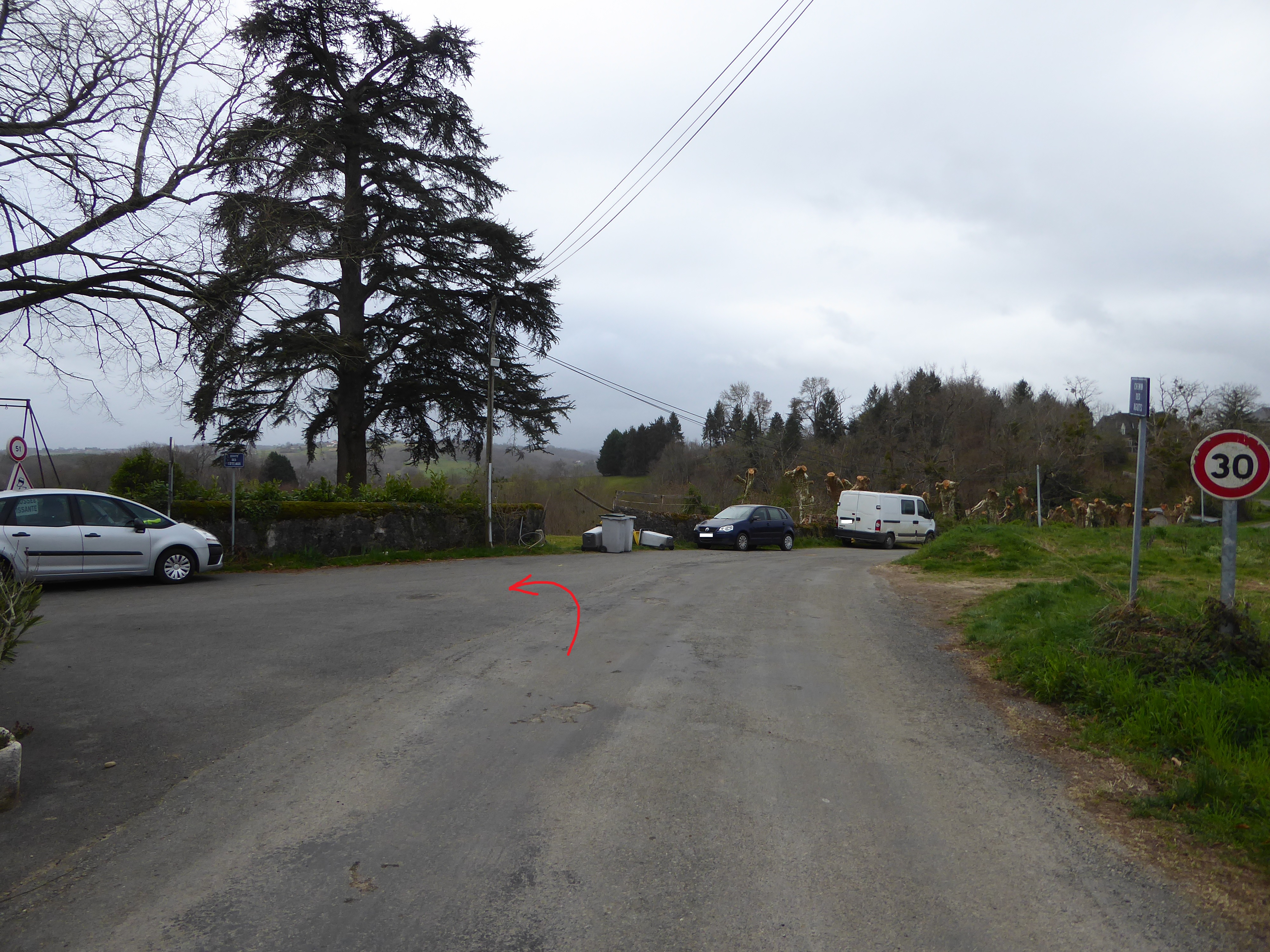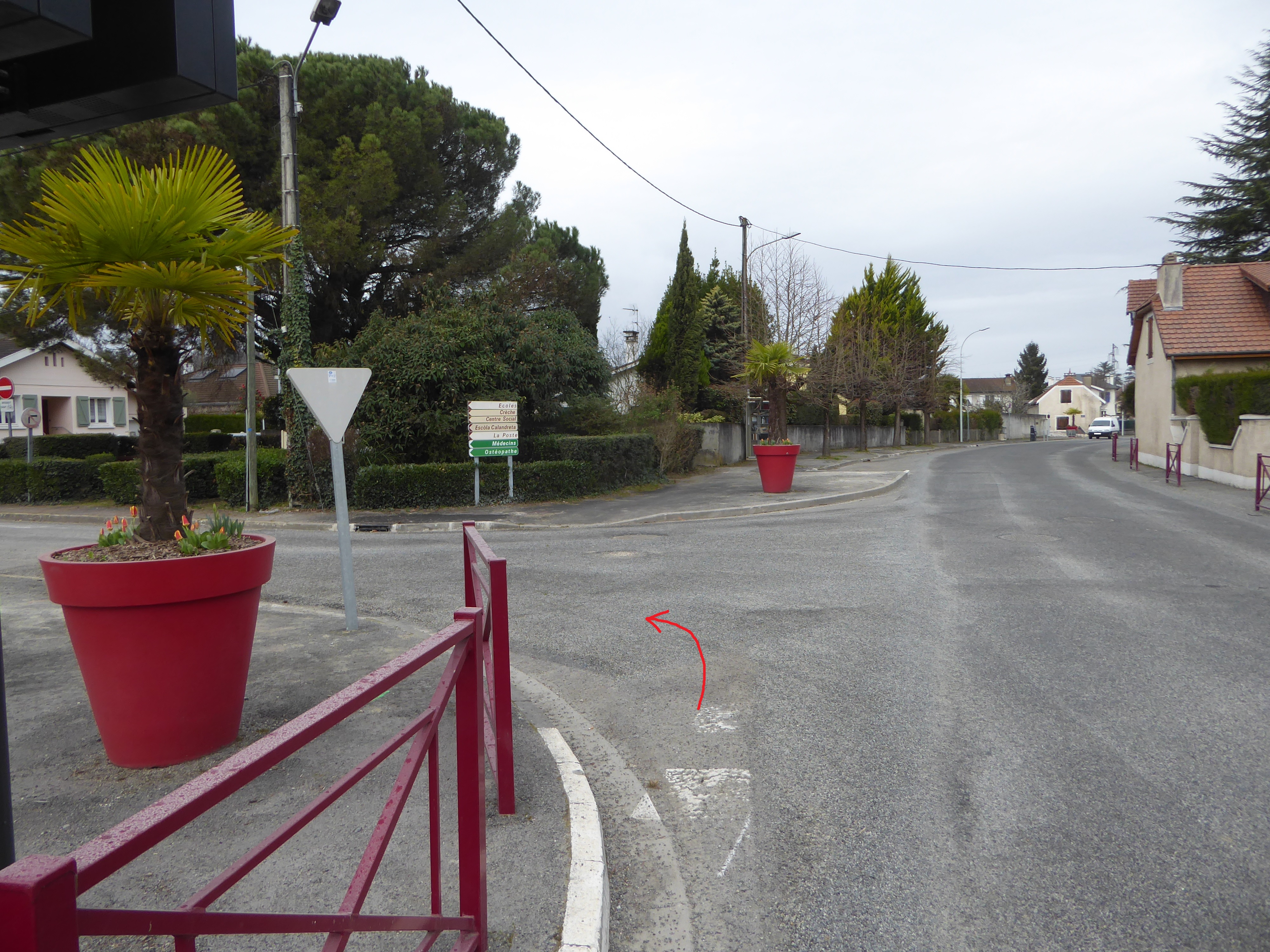 A cette intersection (350 mètres après la patte d'oie), suivre la rue partant sur la gauche direction Stade d'Uzos, aucun balisage dorénavant