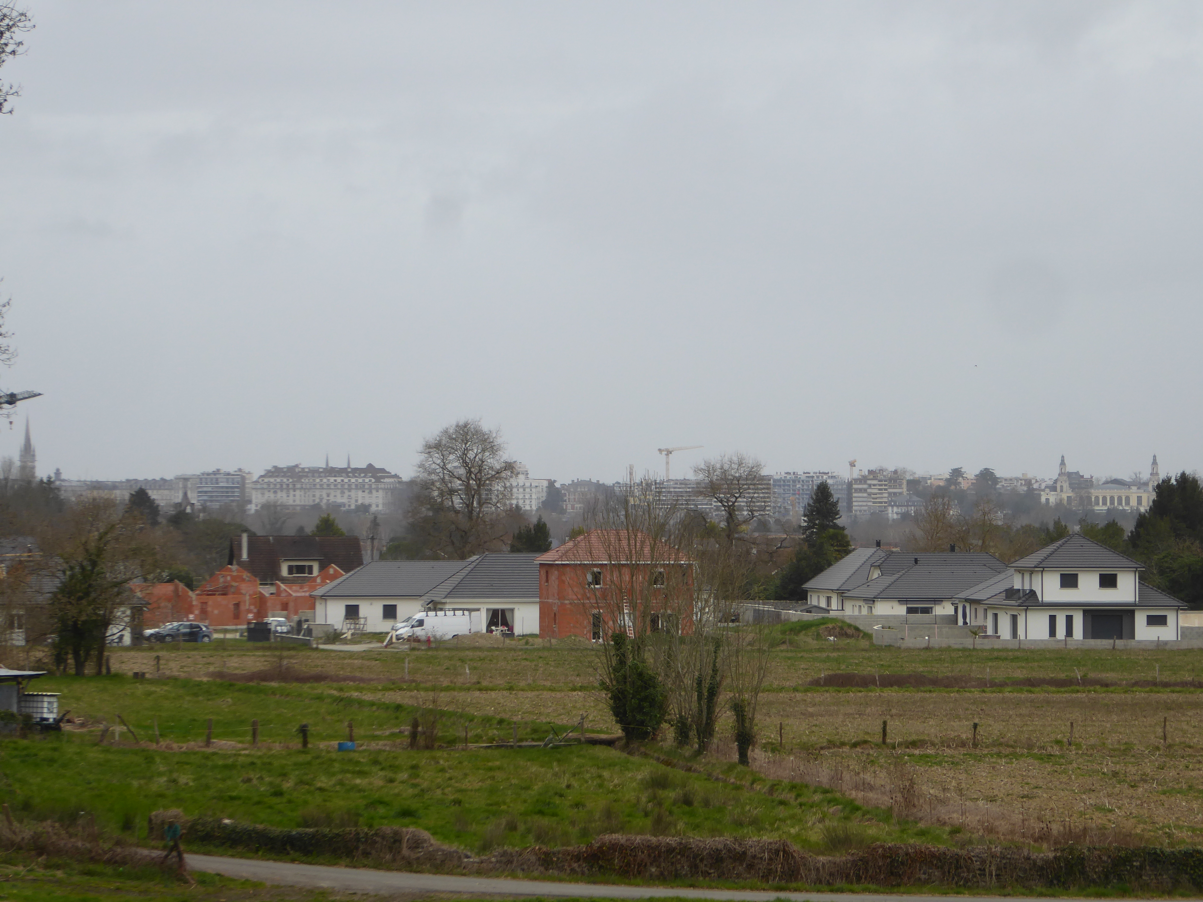 Zoom sur la ville de Pau en arrière-plan de l'église Saint-Martin jusqu'au Palais Beaumont et passant par les immeubles du Boulevard des Pyrénées