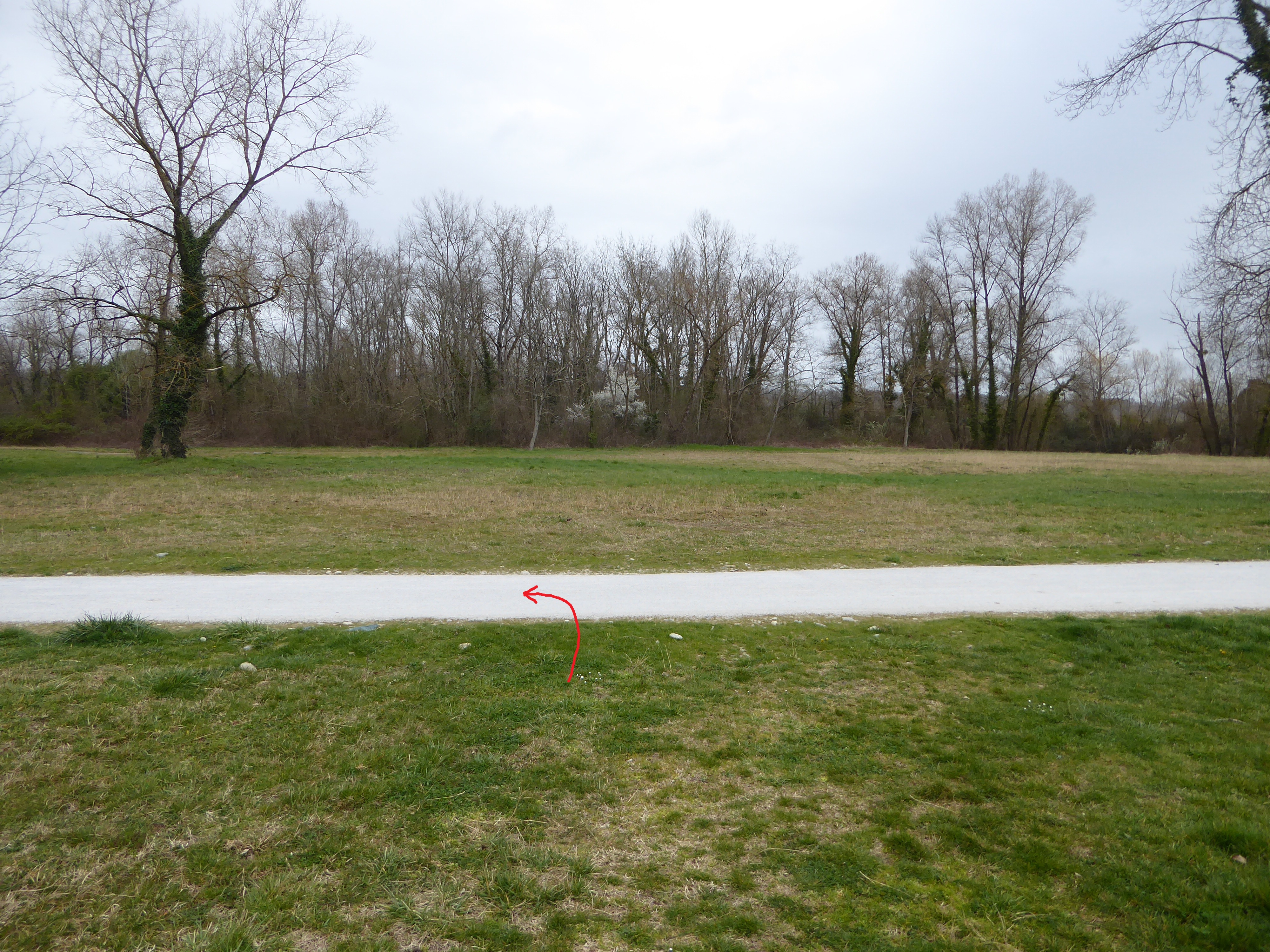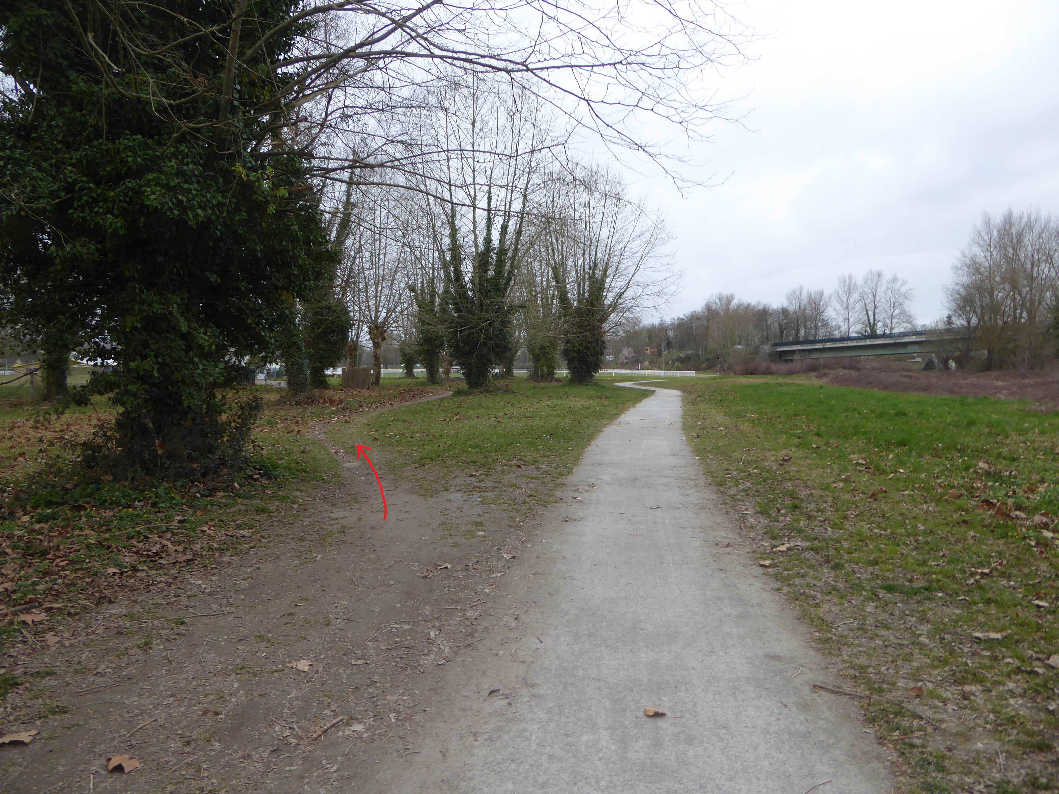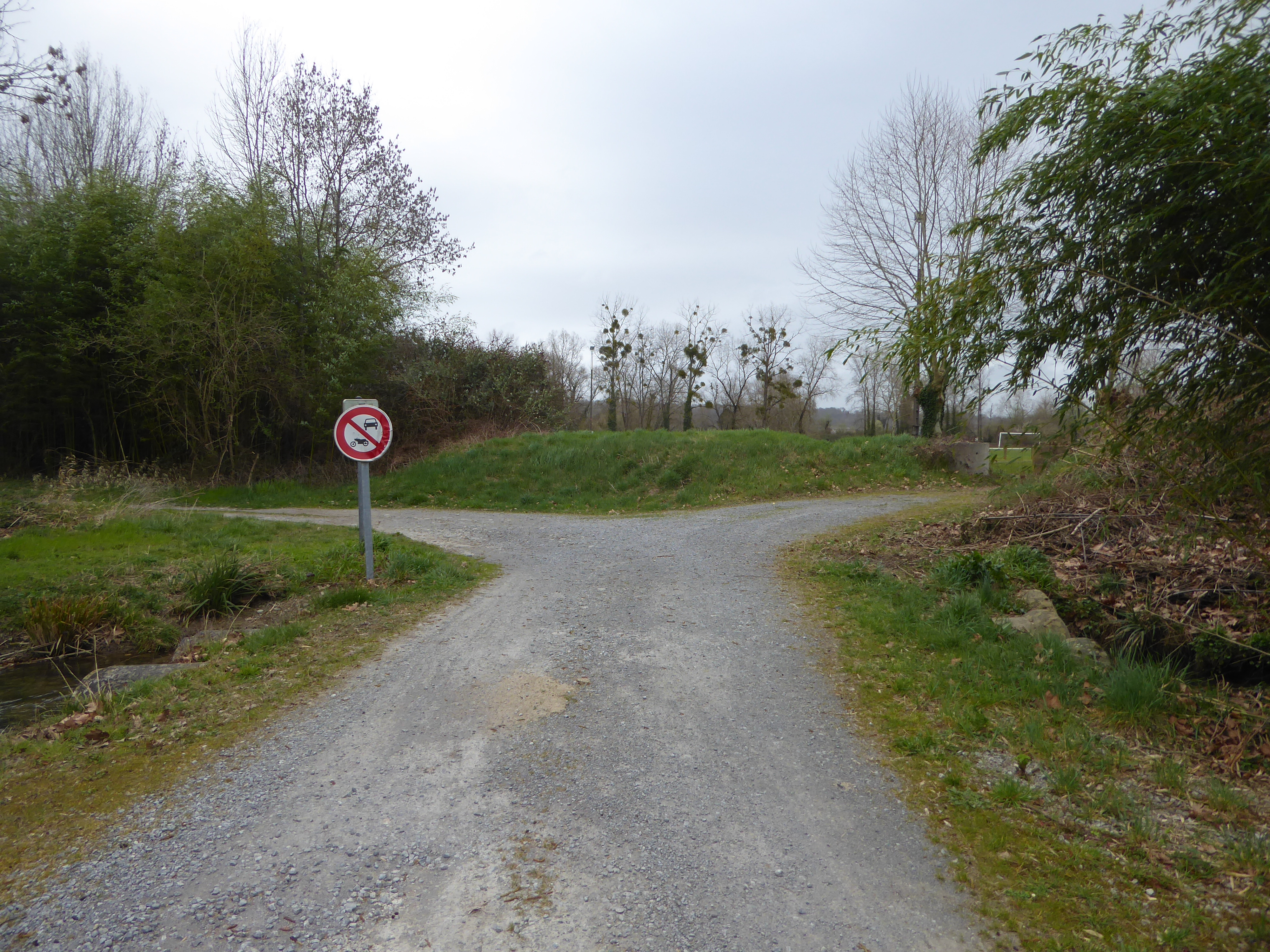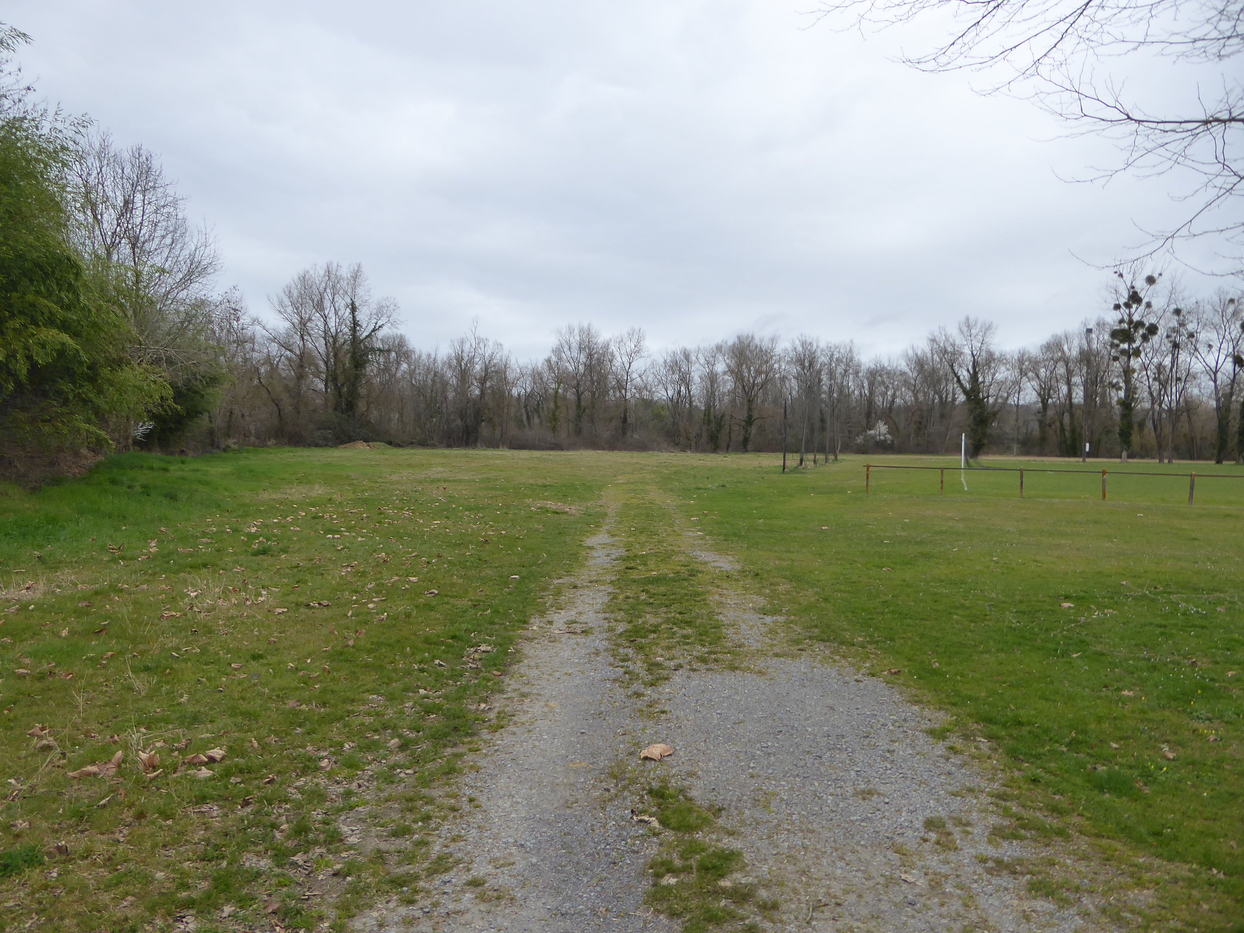 Lorsque le chemin de la digue coupe la route d'accès au stade, continuer à suivre le chemin partant tout droit direction Pouchan