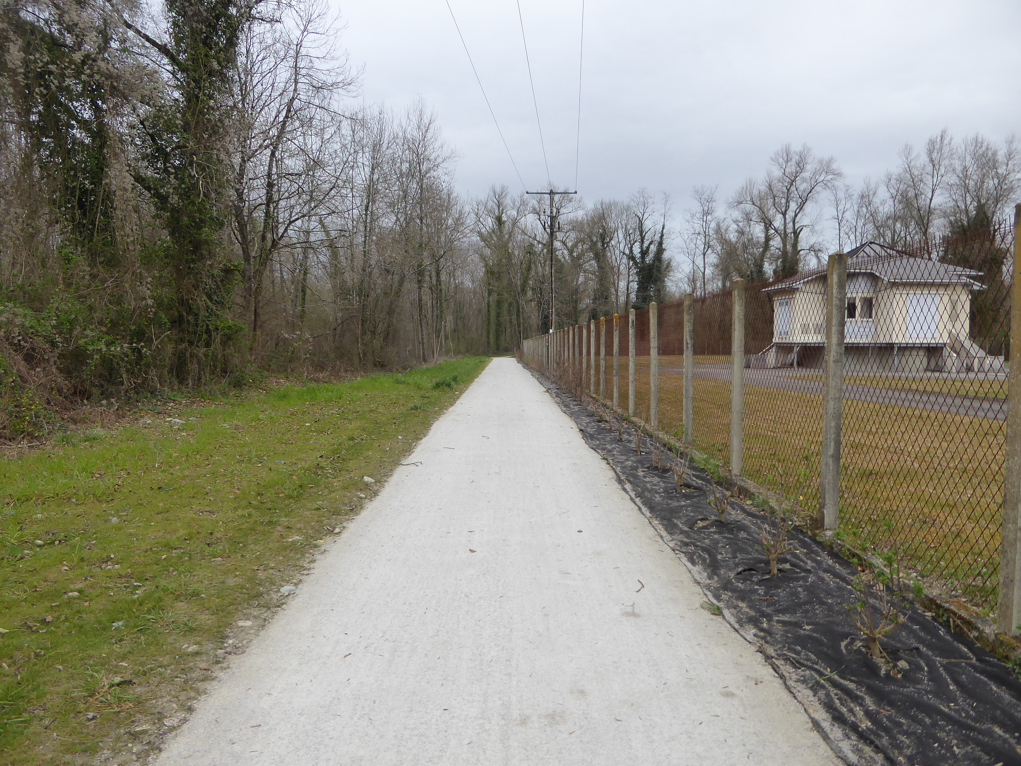 A ce croisement avec la voie verte, suivre cette dernière sur la gauche direction Stade de Mazères-Lezons