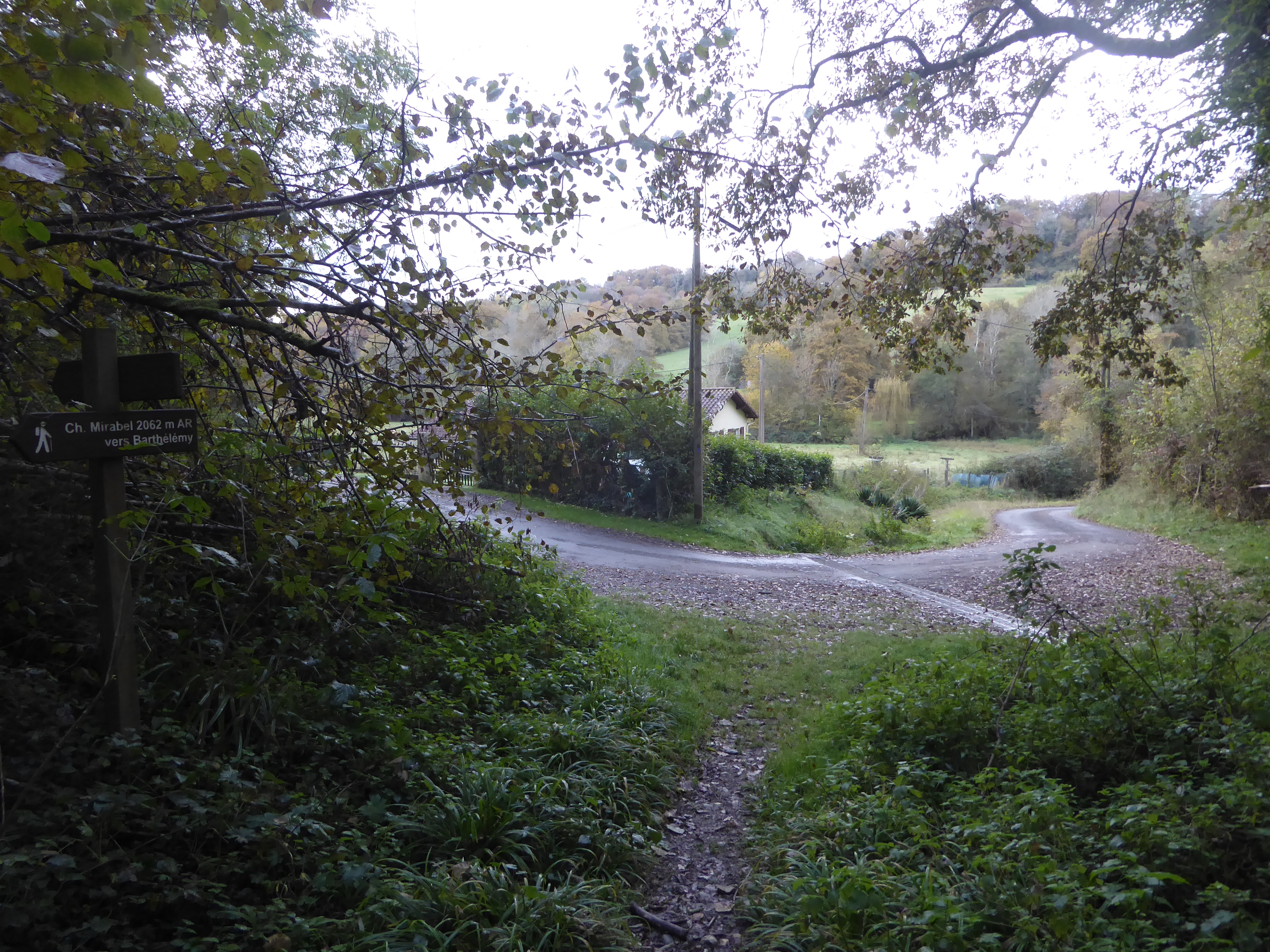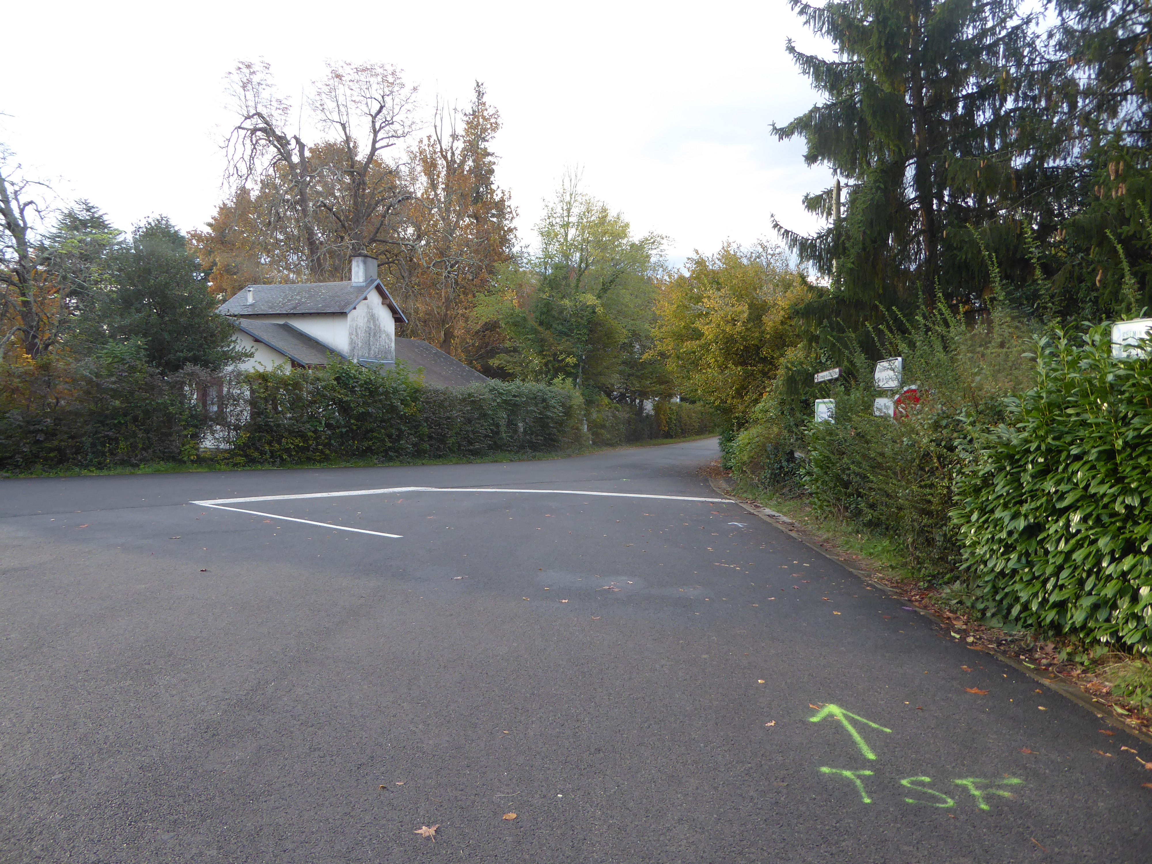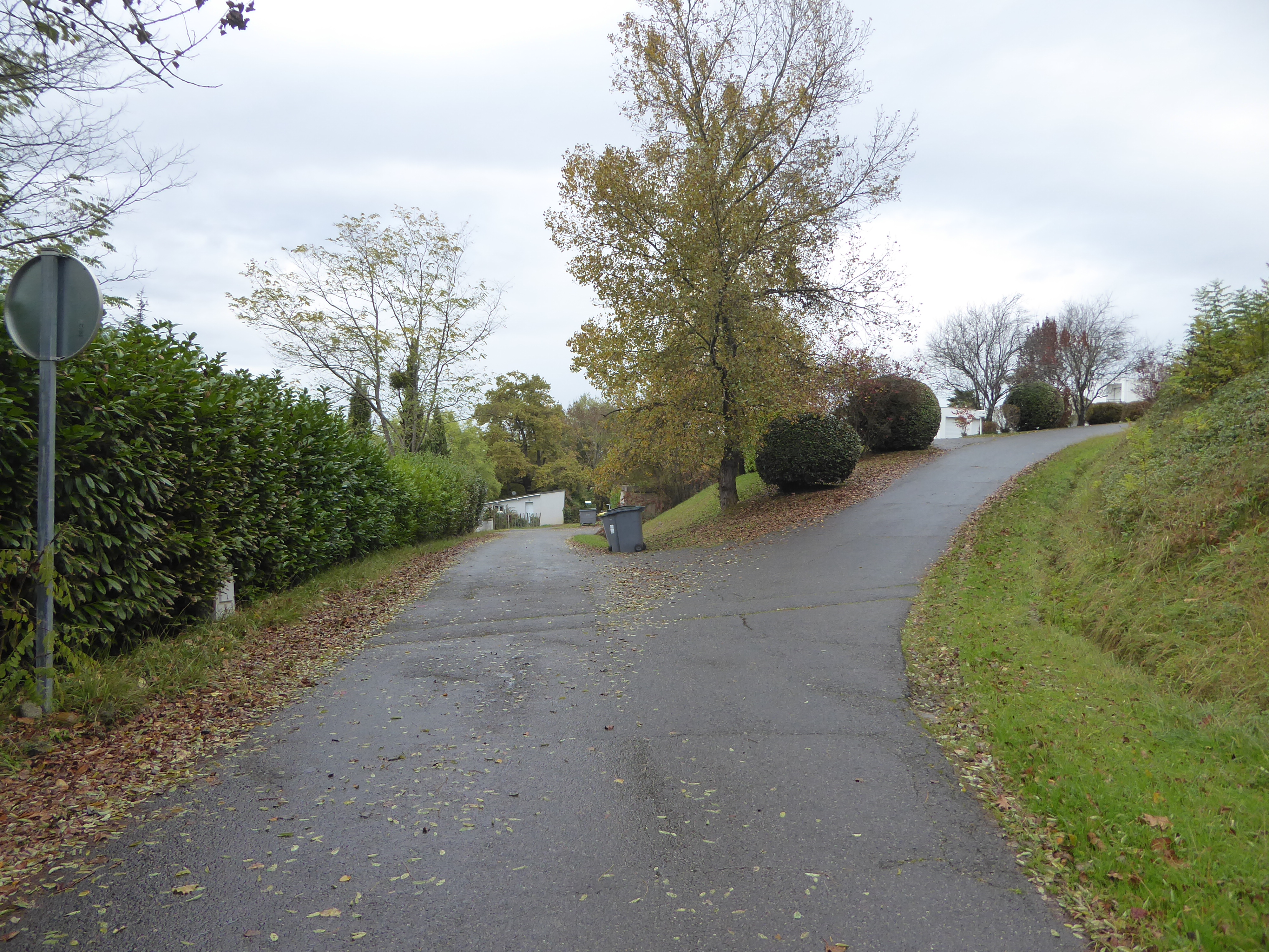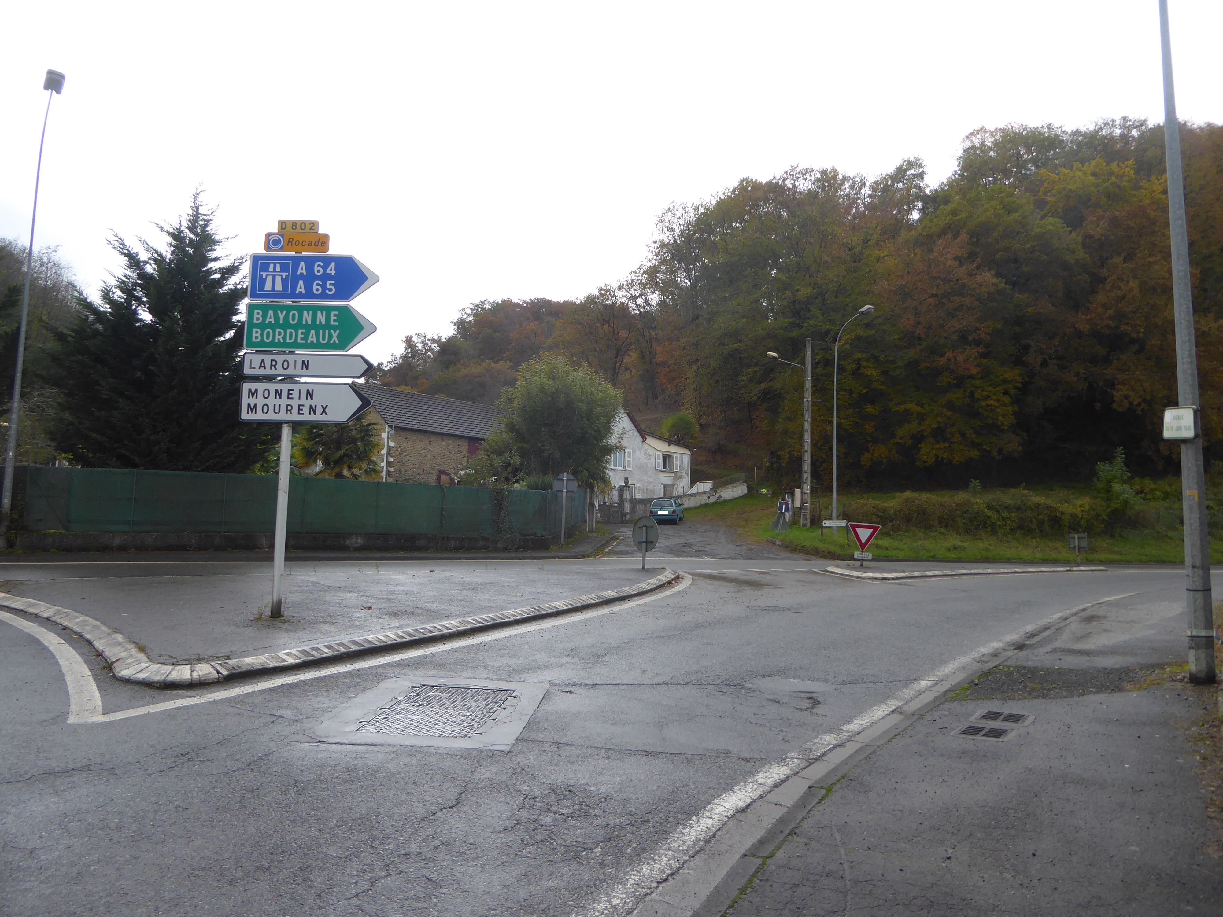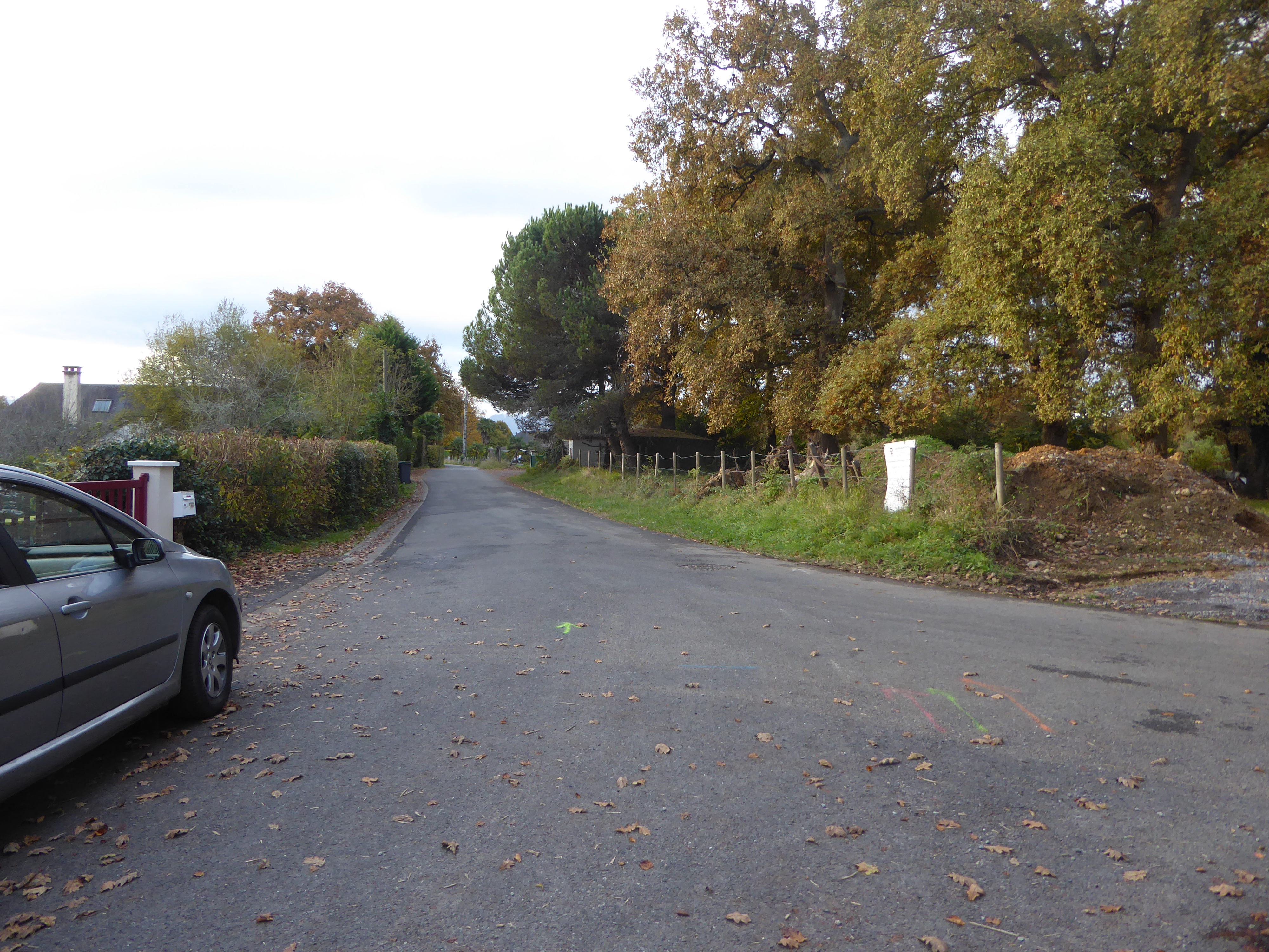 Larredya (324 m) : suivre la route partant sur la droite mettant fin au sentier de la Jurançonada direction Début du Chemin de Monplaisir, aucun balisage dorénavant