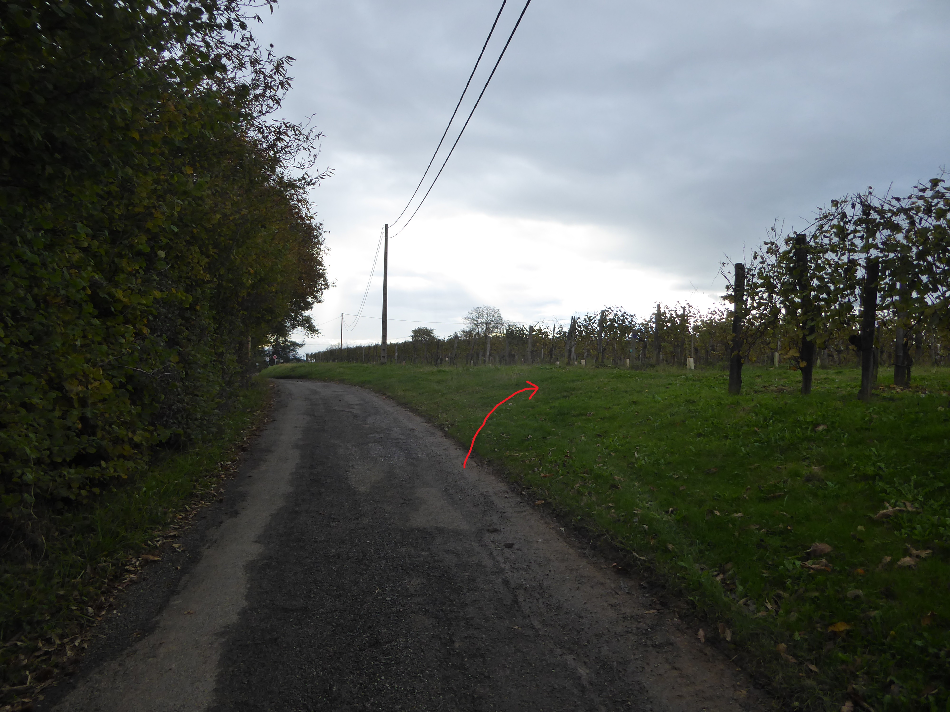 A ce croisement avec le chemin d'accès à la Jurançonada (Clos Lapeyre) (400 mètres après Casenave), suivre le chemin partant sur la droite direction la Jurançonada, balisé en flèches vertes dorénavant