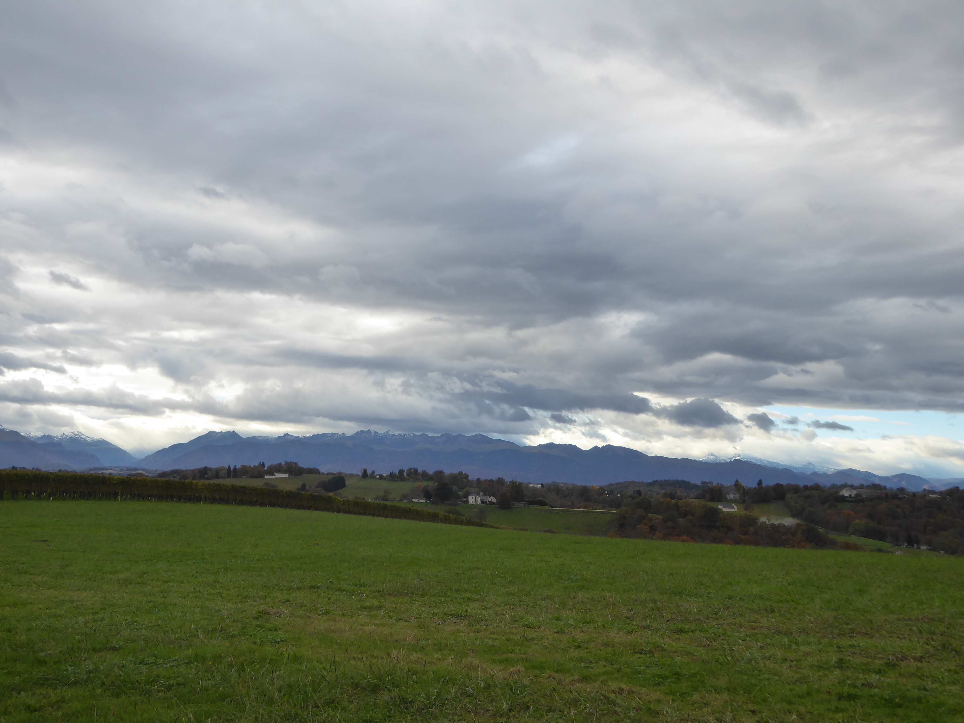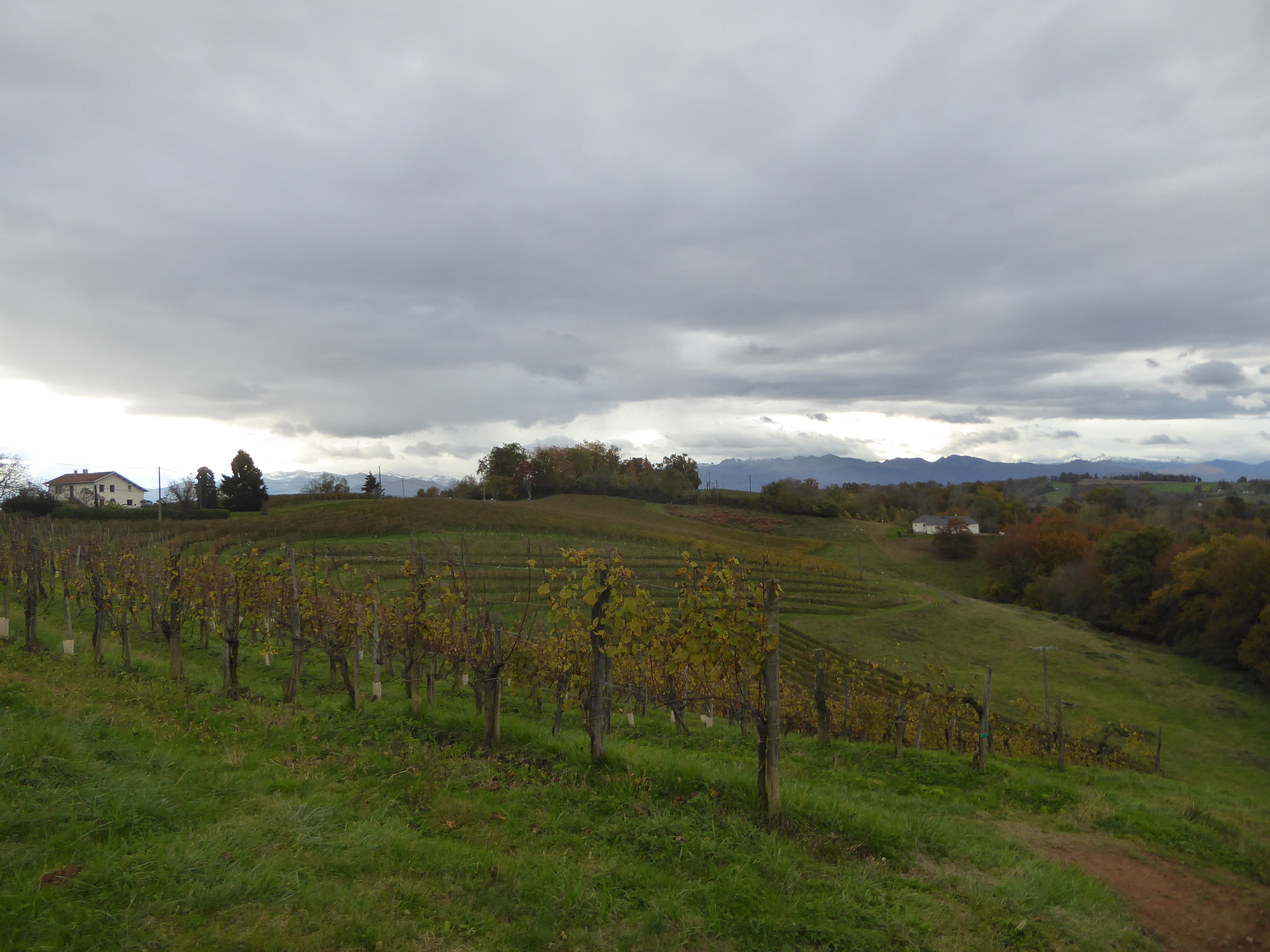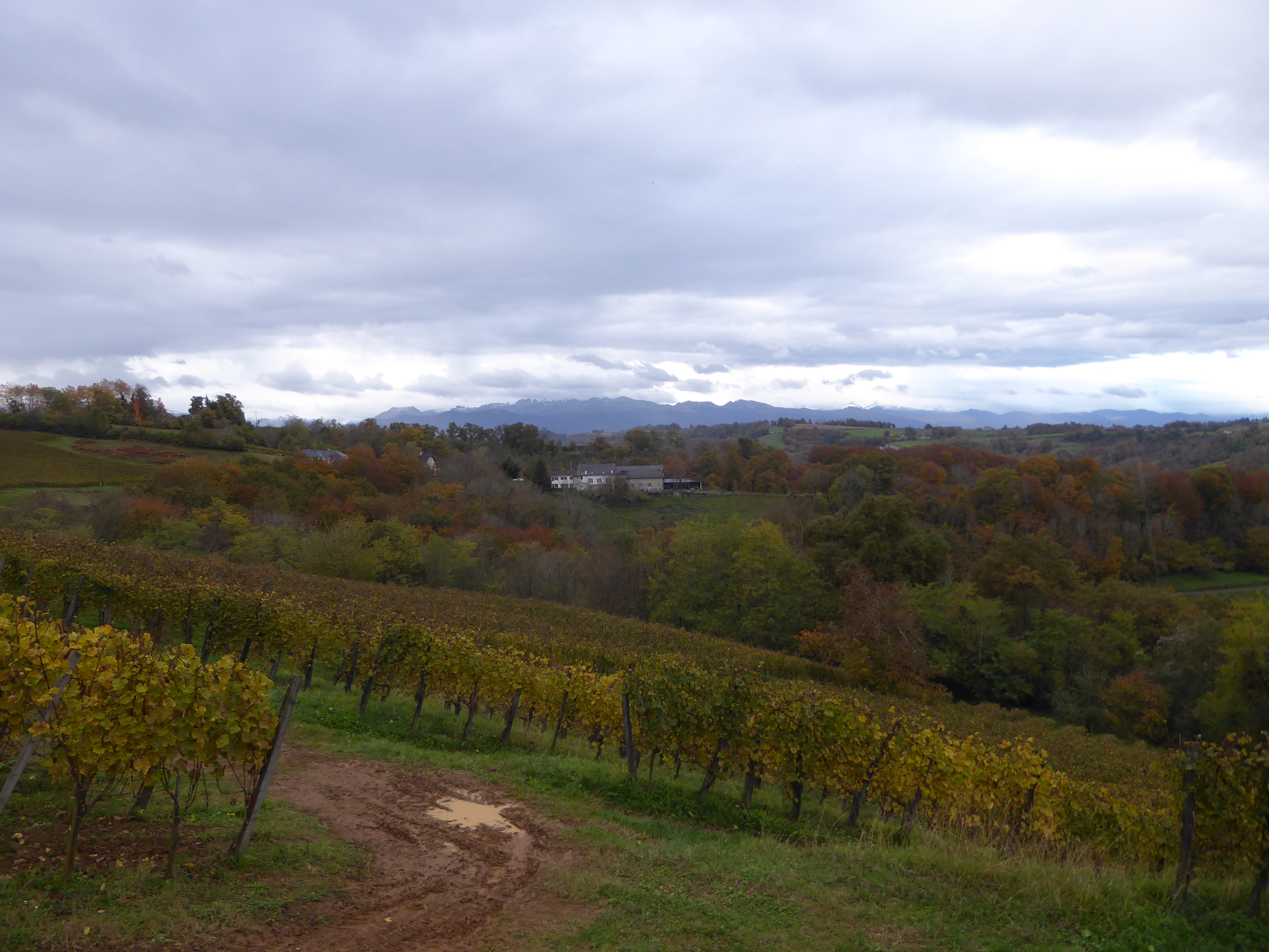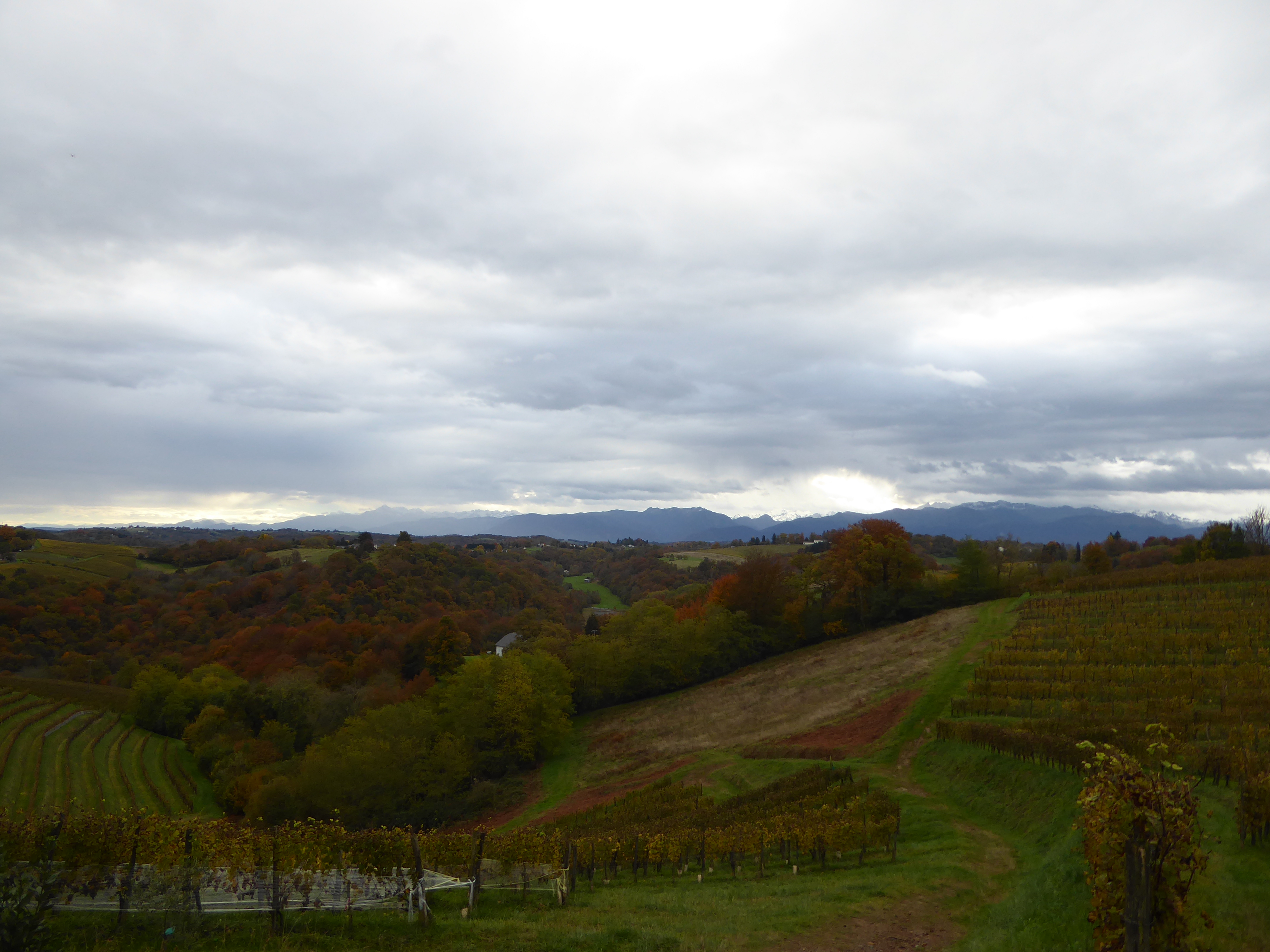 Arrivée au sommet de la Jurançonada (307 m) : belle vue sur les côteaux de Jurançon et ses vignobles ... les Pyrénées en toile de fond malgré la pluie ! (panorama pris au-dessus du vignoble du Camin Larredya)