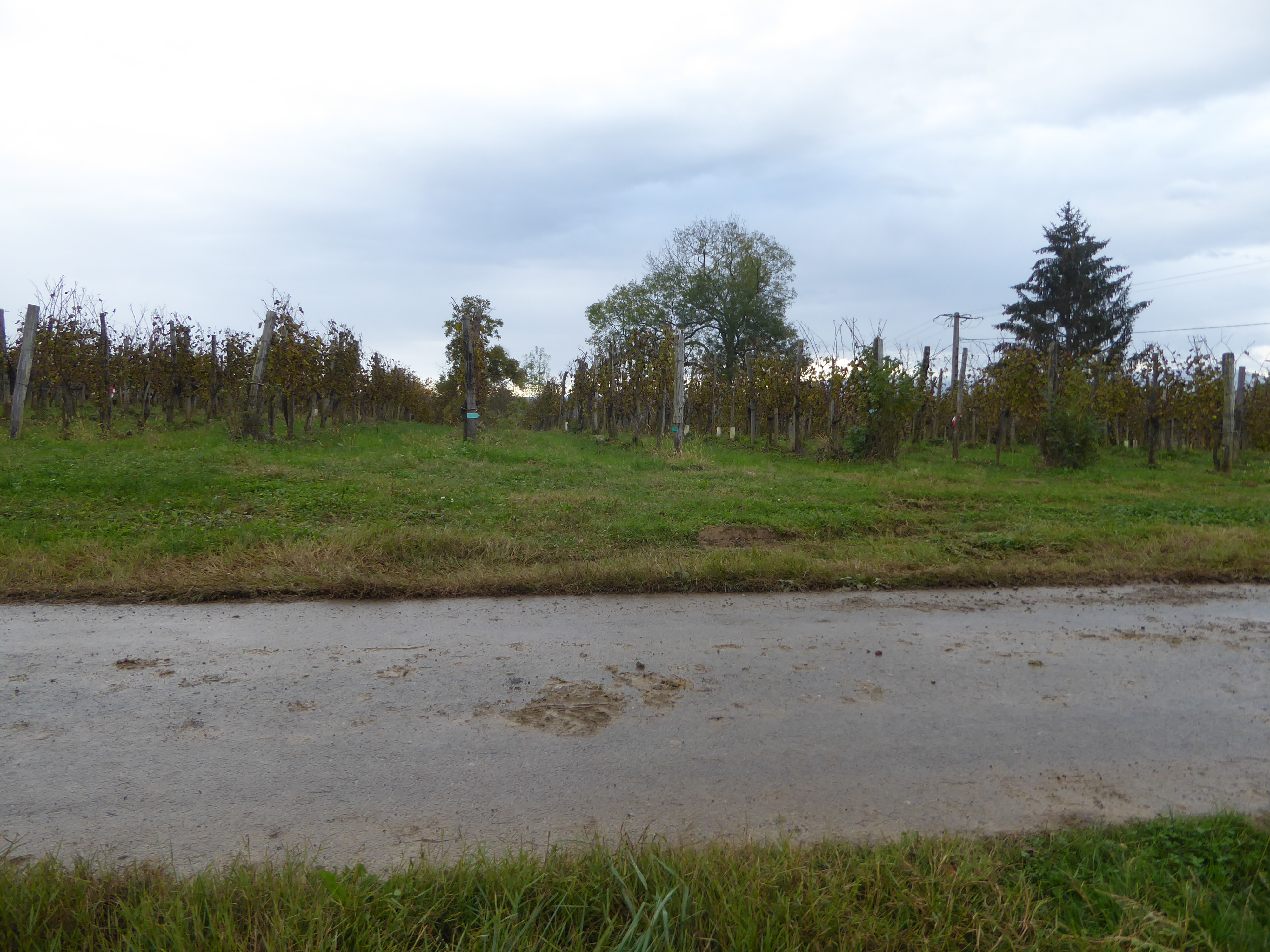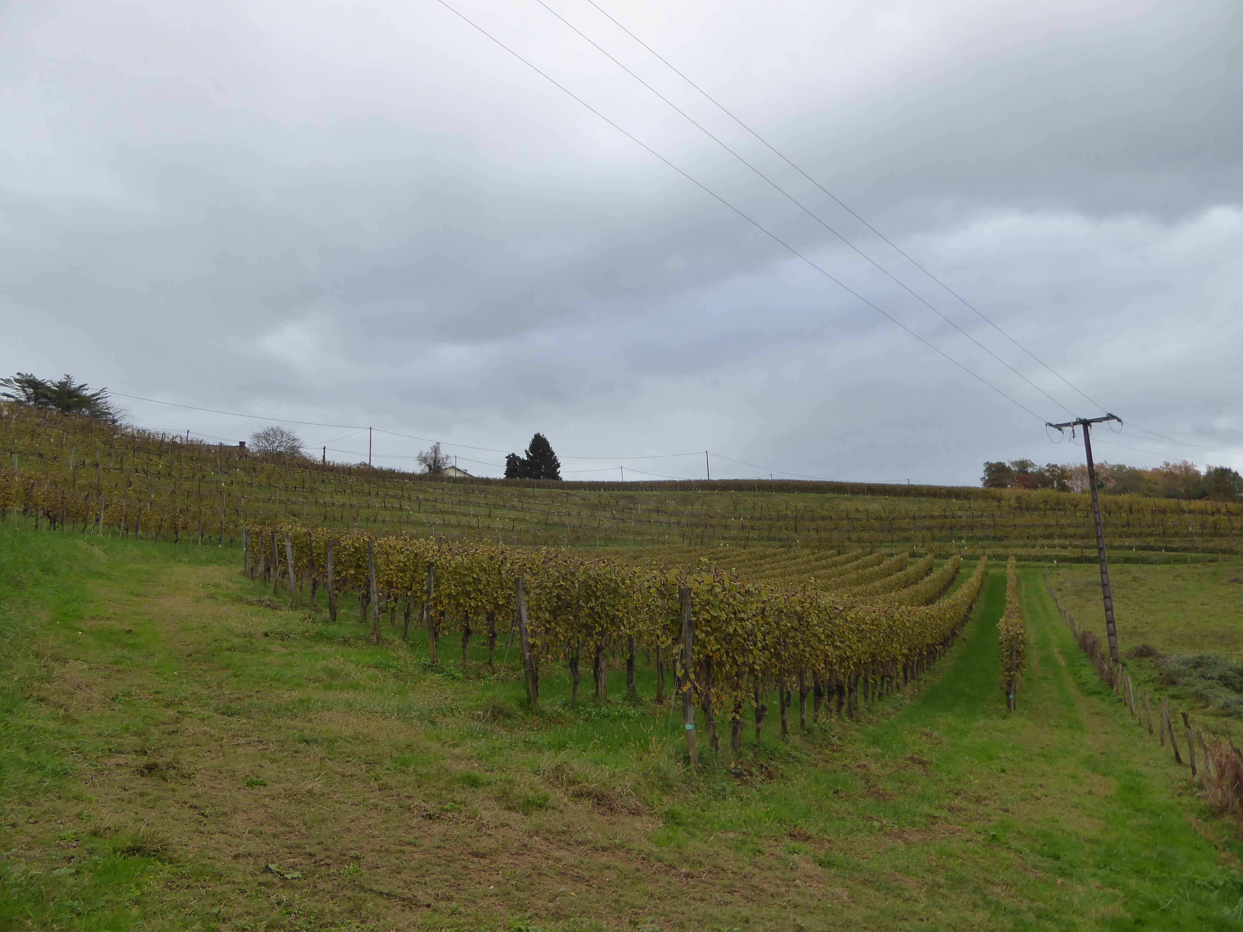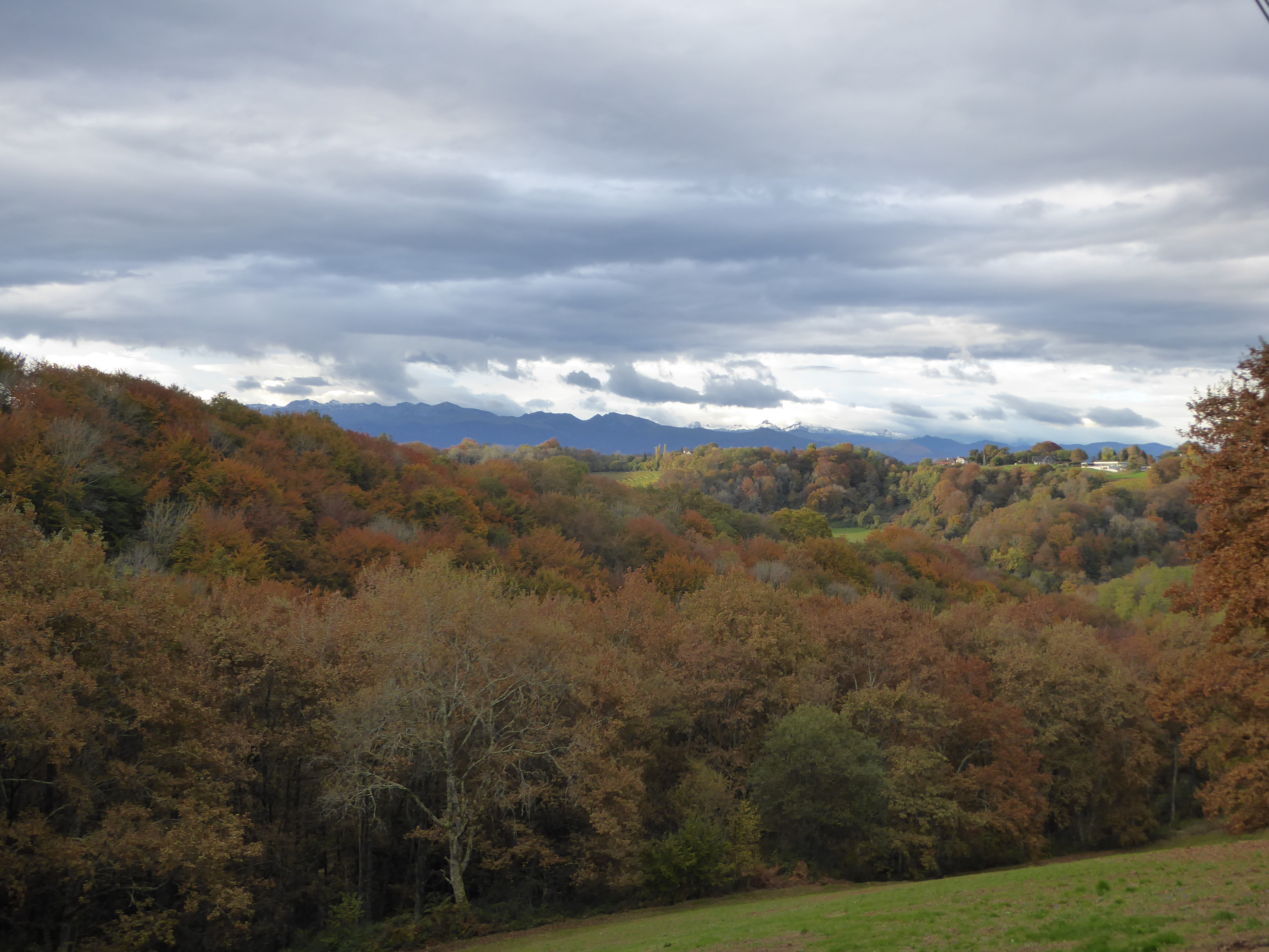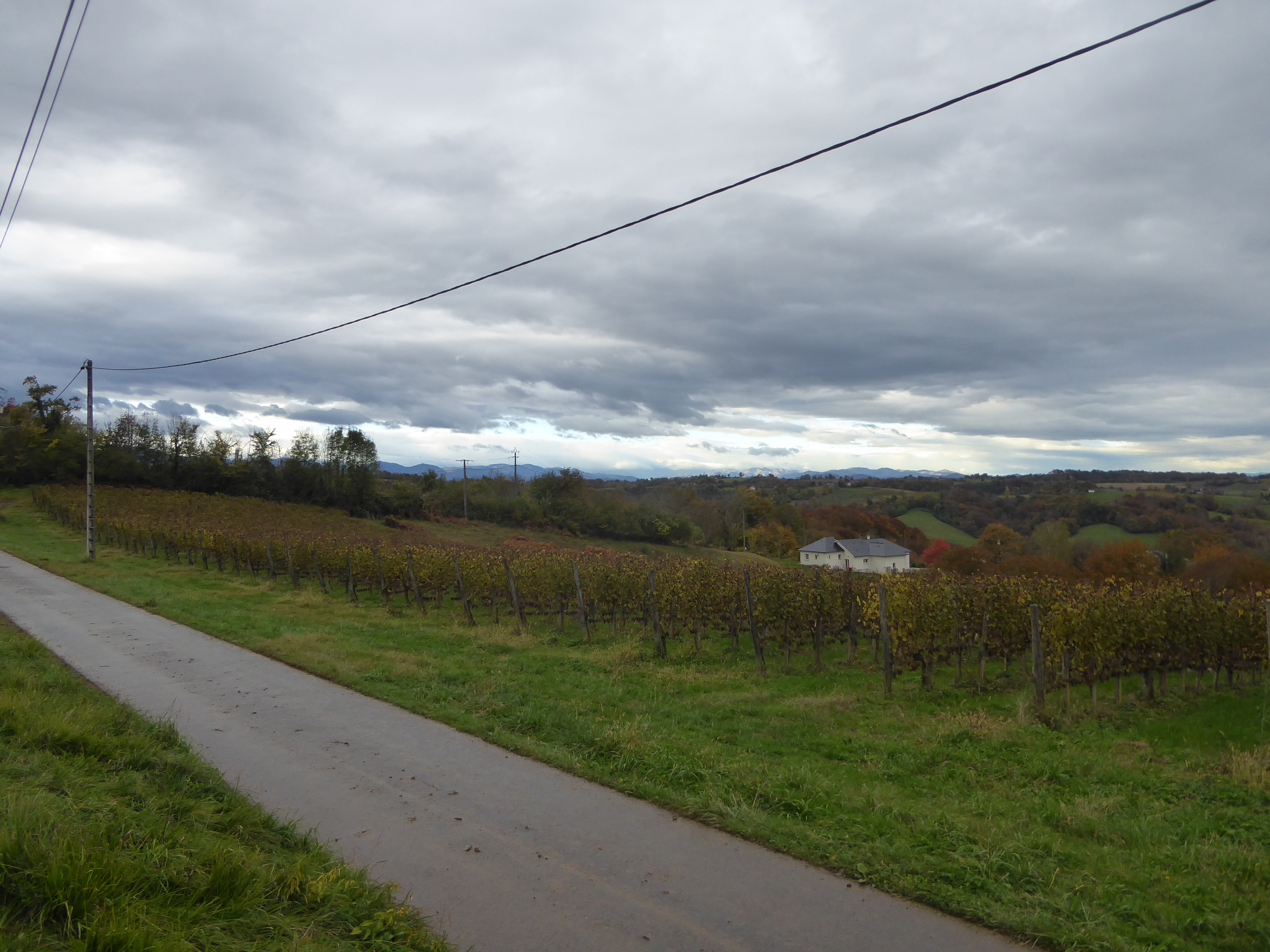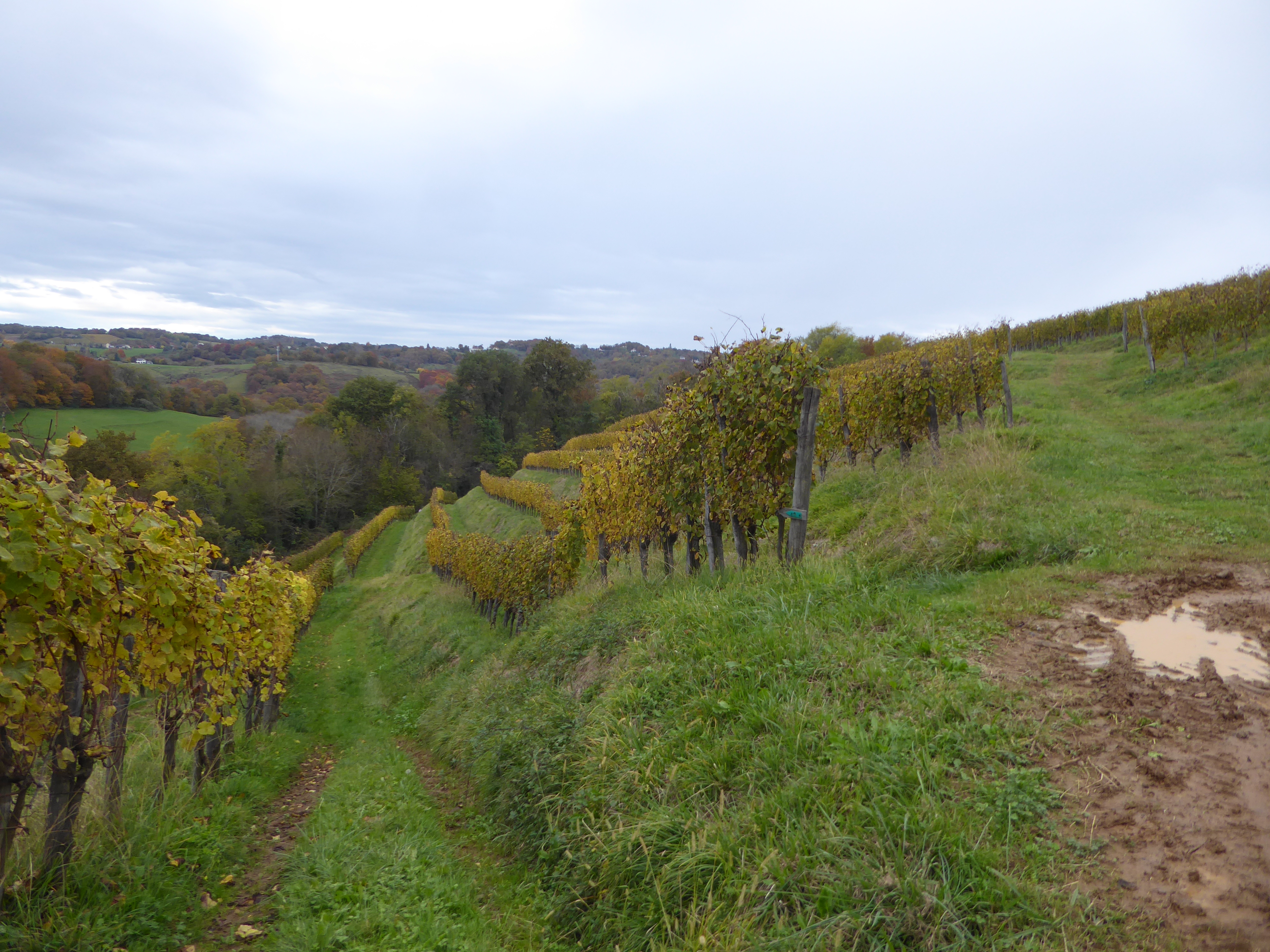 Arrivée au sommet de la Jurançonada (307 m) : belle vue sur les côteaux de Jurançon et ses vignobles ... les Pyrénées en toile de fond malgré la pluie ! (panorama pris au-dessus du vignoble du Camin Larredya)