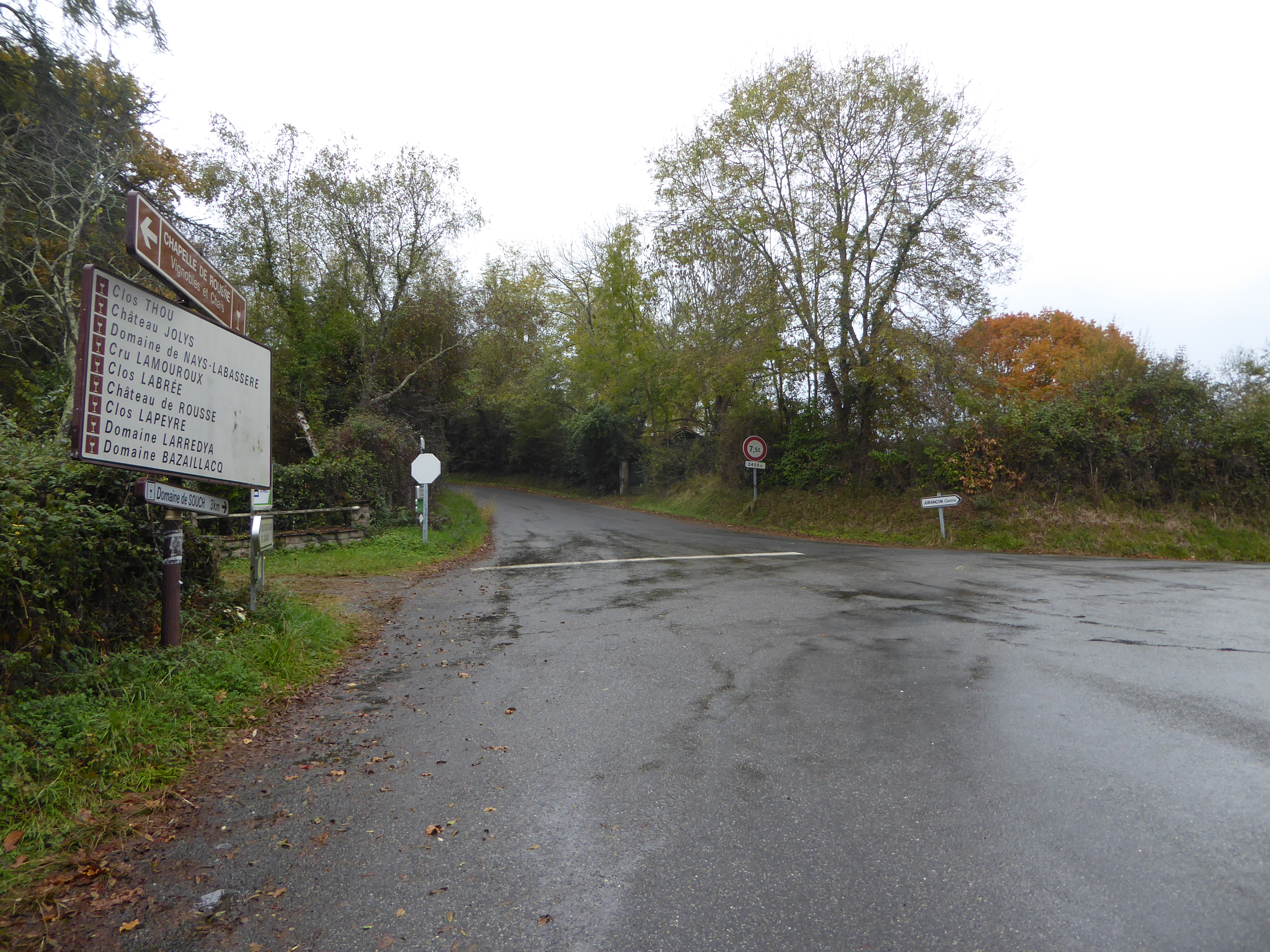 A cette nouvelle intersection rencontrée (150 mètres après avoir pris la route des Vins du Jurançon), continuer à suivre la D268 partant tout droit direction la Jurançonada (la route descendant sur la droite mène au Domaine de Souch)