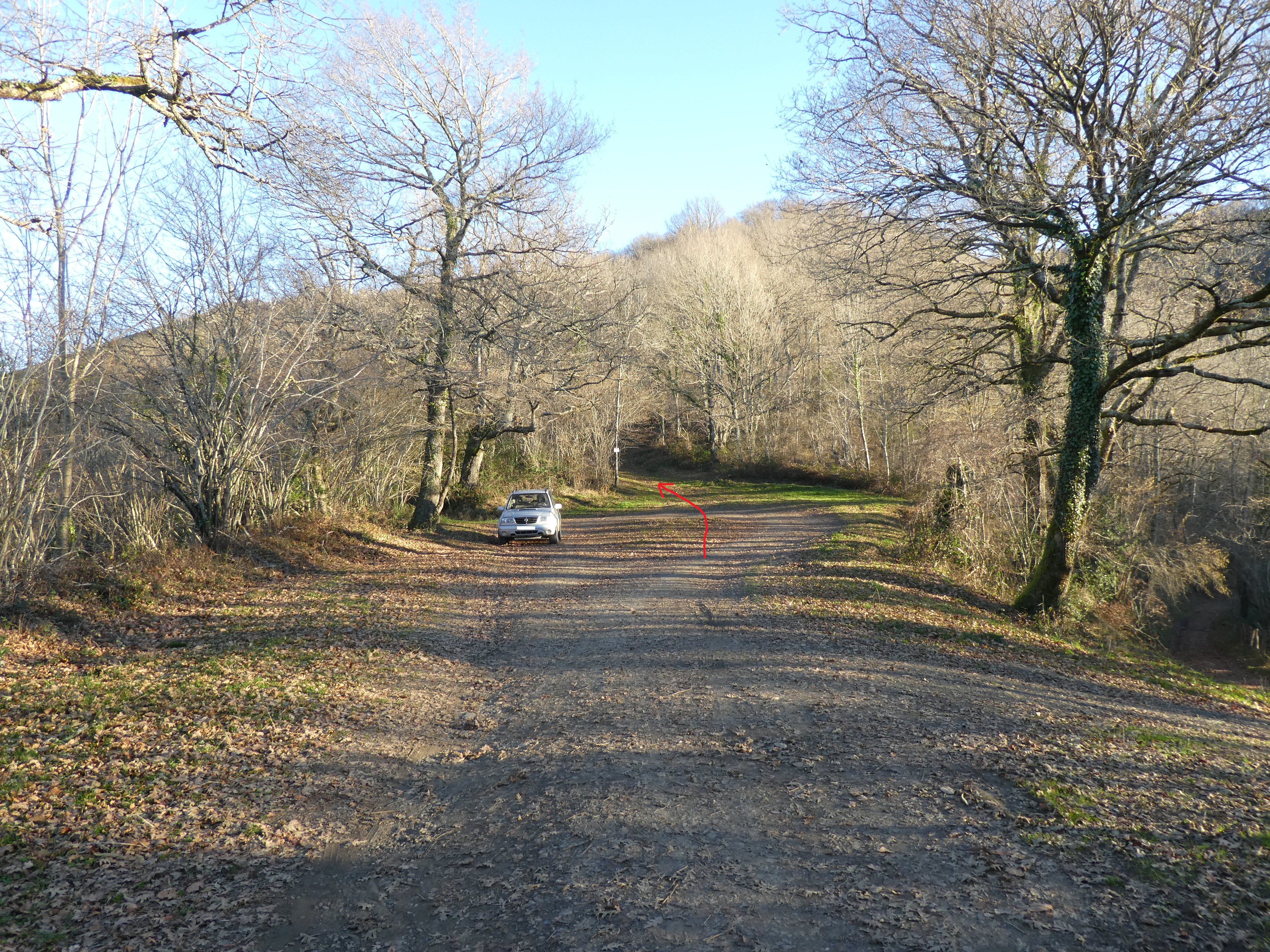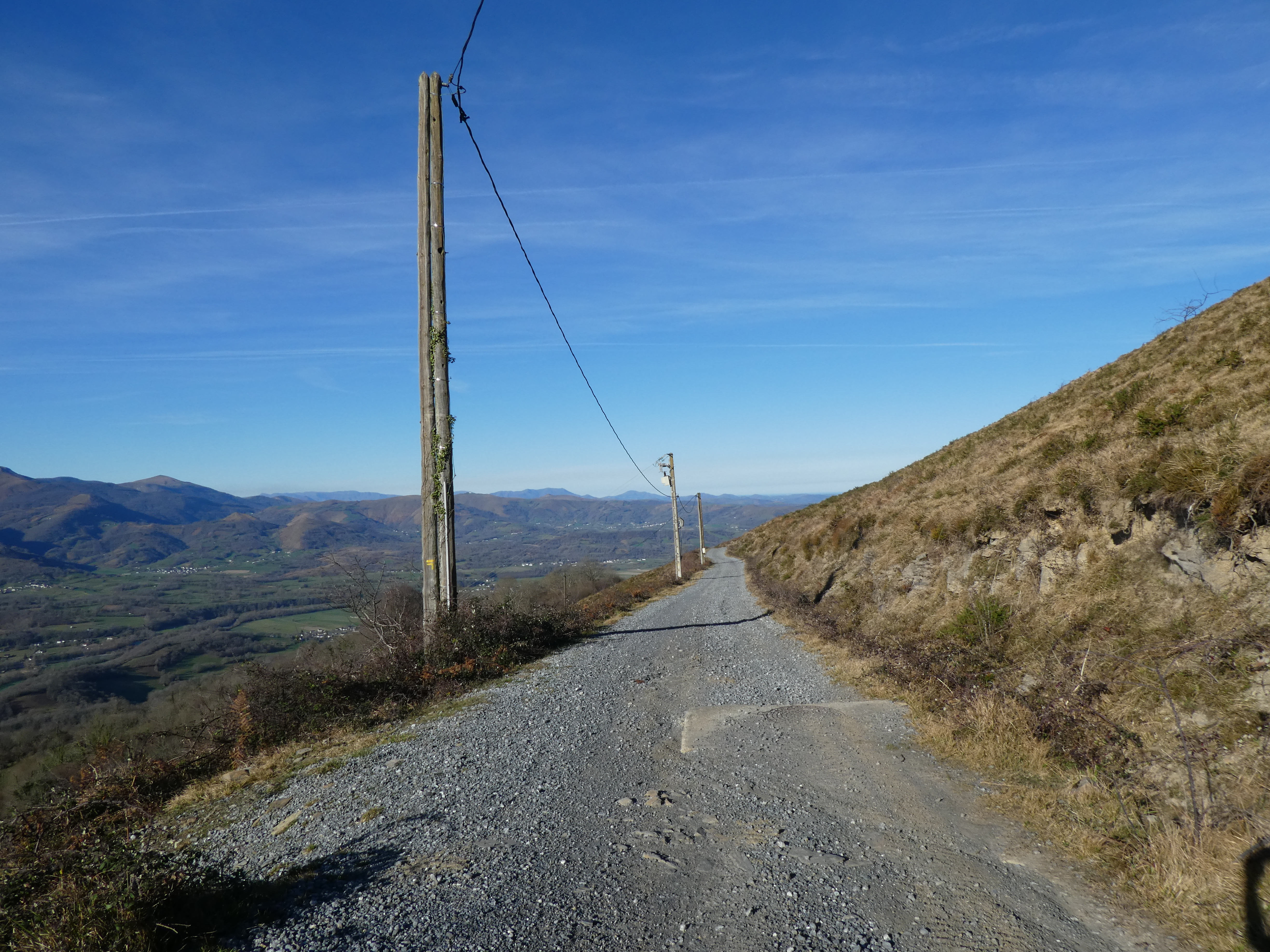 A ce croisement avec la route d'accès au sommet (150 mètres après avoir quitté le sommet), suivre cette dernière sur la droite direction Tardets-Sorholus, balisé sporadiquement en jaune