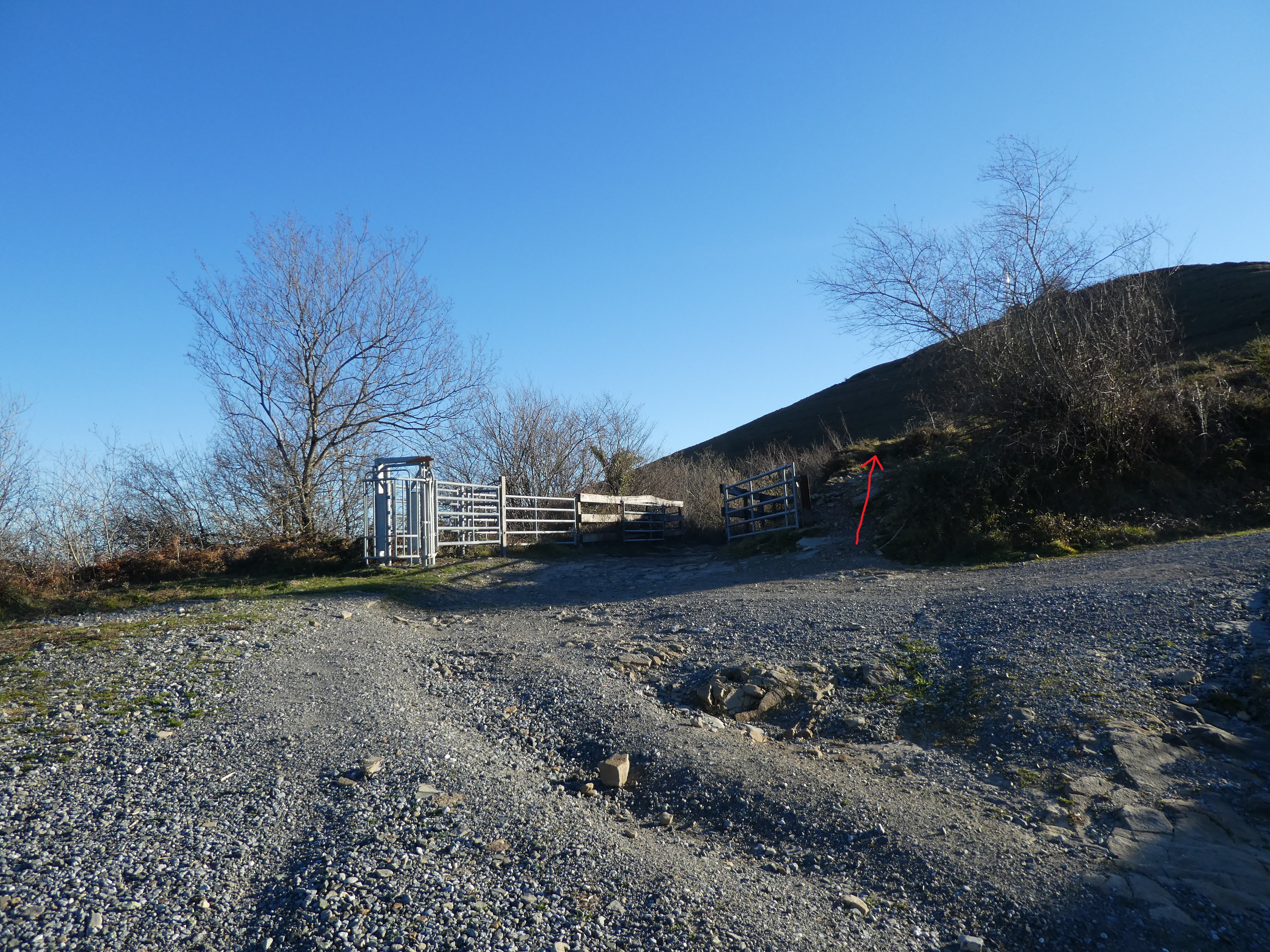 Redescendre du sommet dans le même sens que celui de l'aller en empruntant le chemin partant de biais sur la droite et rejoignant la route d'accès au sommet direction Tardets-Sorholus, balisé sporadiquement en jaune