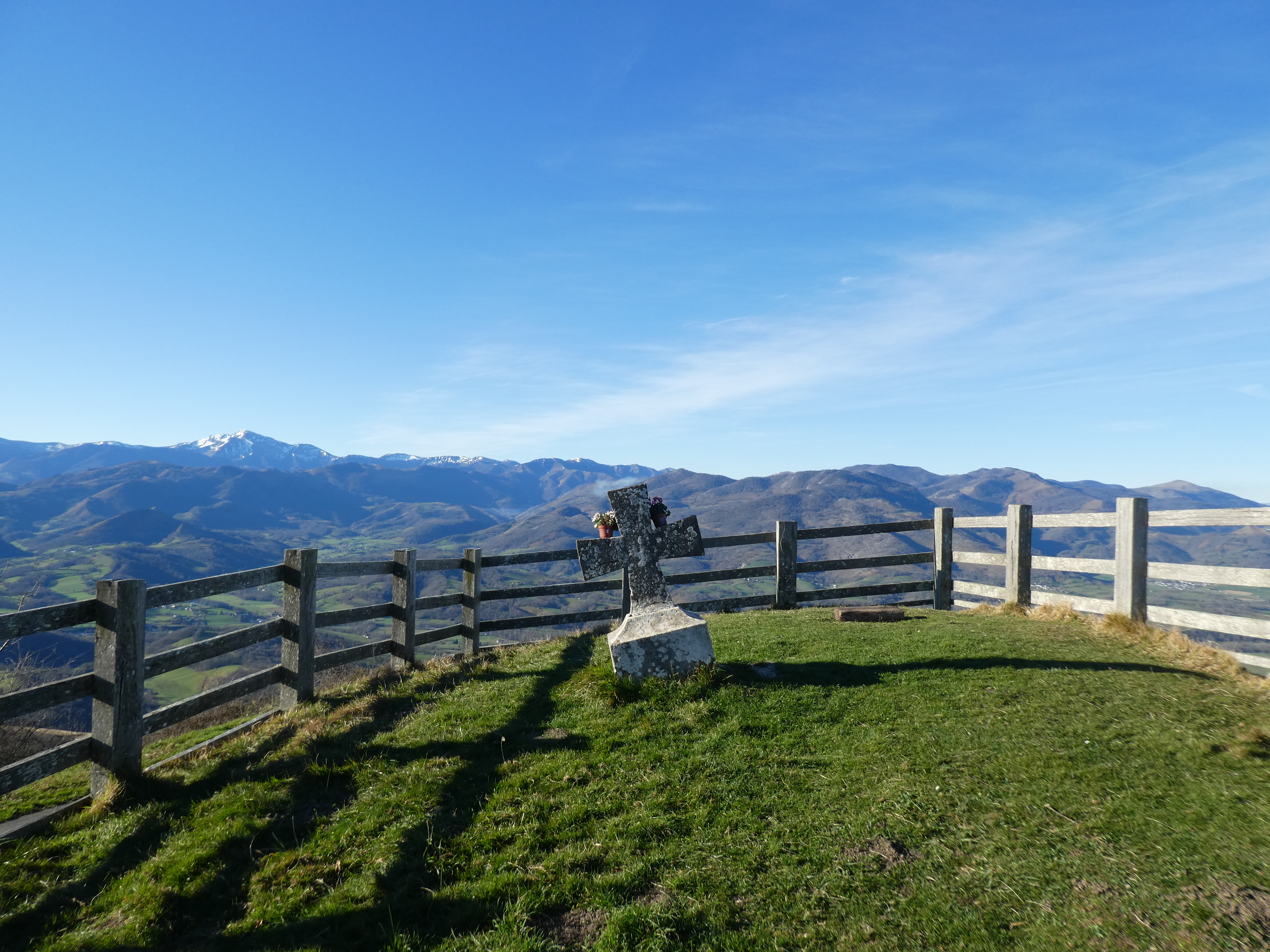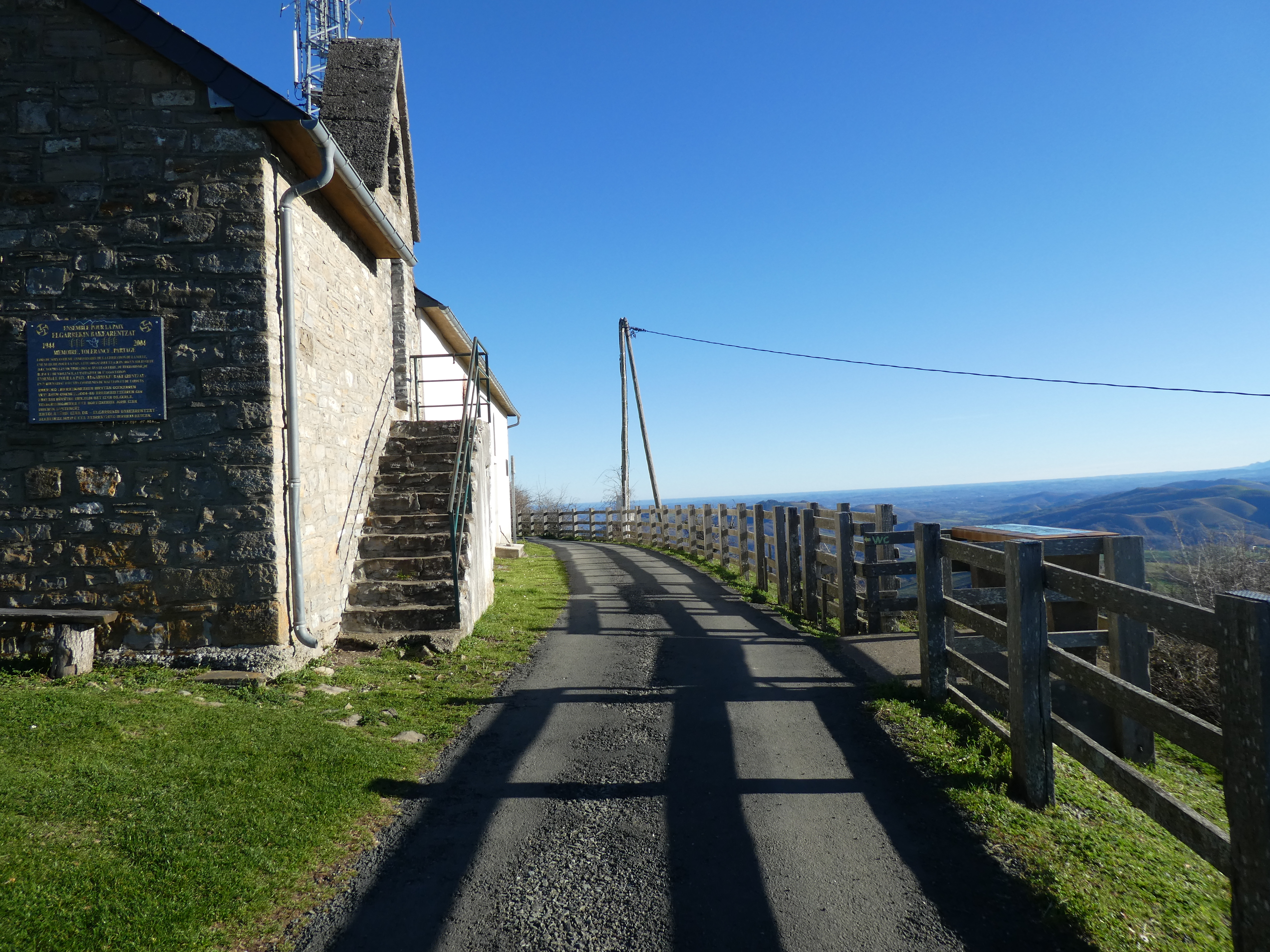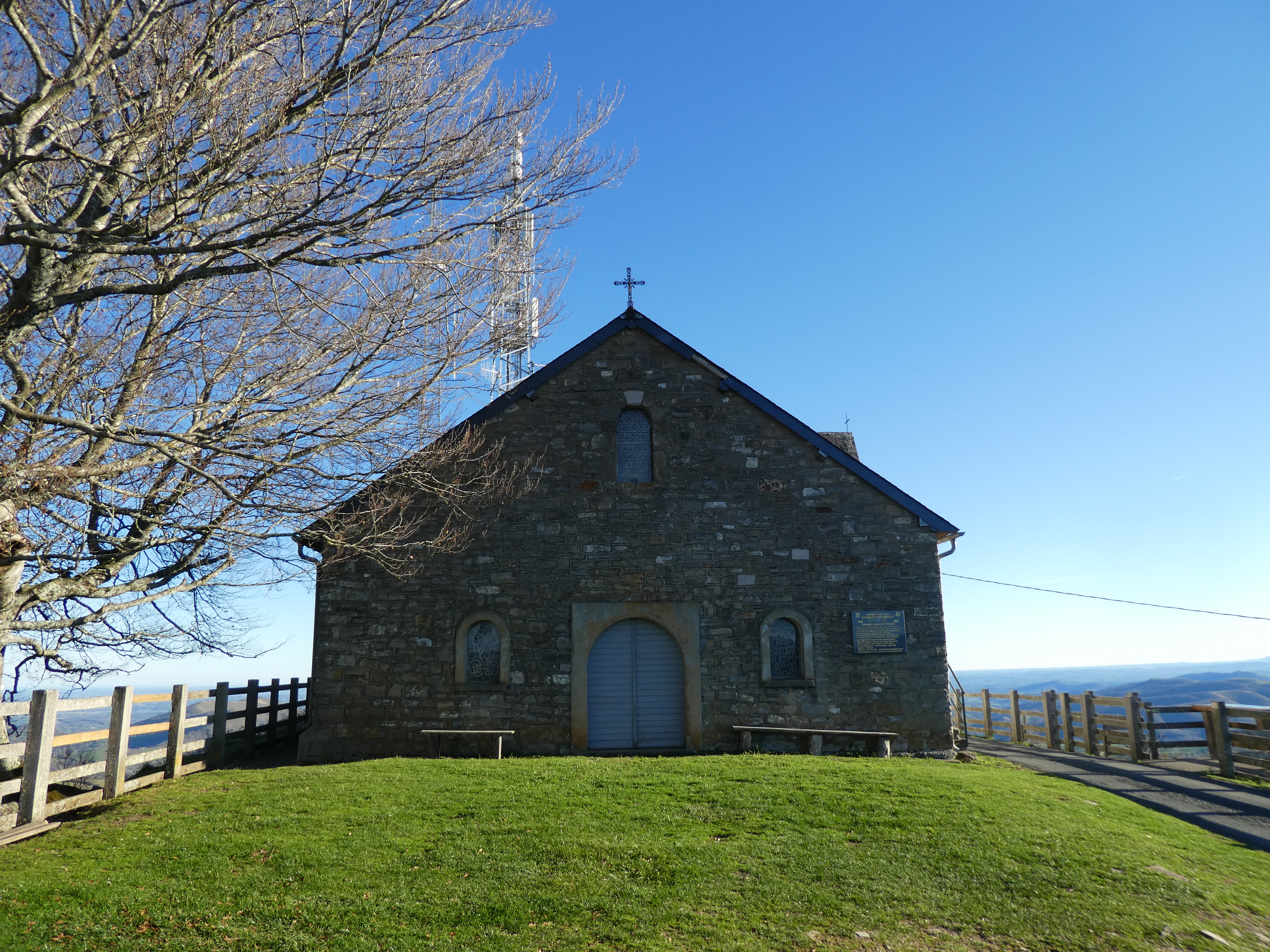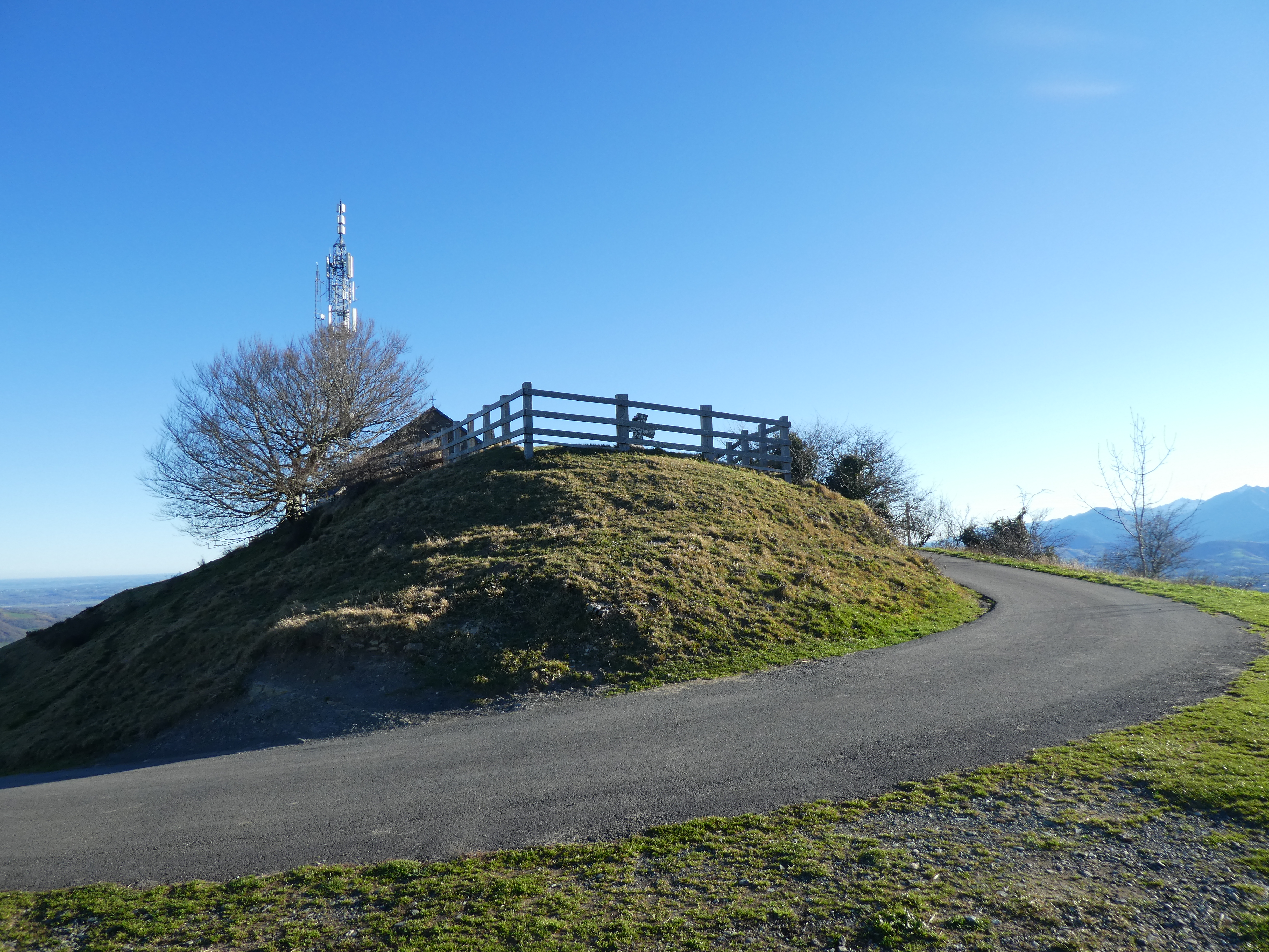 Arrivée au sommet de la Chapelle de la Madeleine (795 m) : beau panorama sur les sommets de la Vallée du Valentin, de la Vallée d'Ossau, de la Vallée d'Aspe, de la Vallée de Barétous, de la Haute Soule, de la Basse Navarre ainsi que sur la plaine bas-pyrénéenne