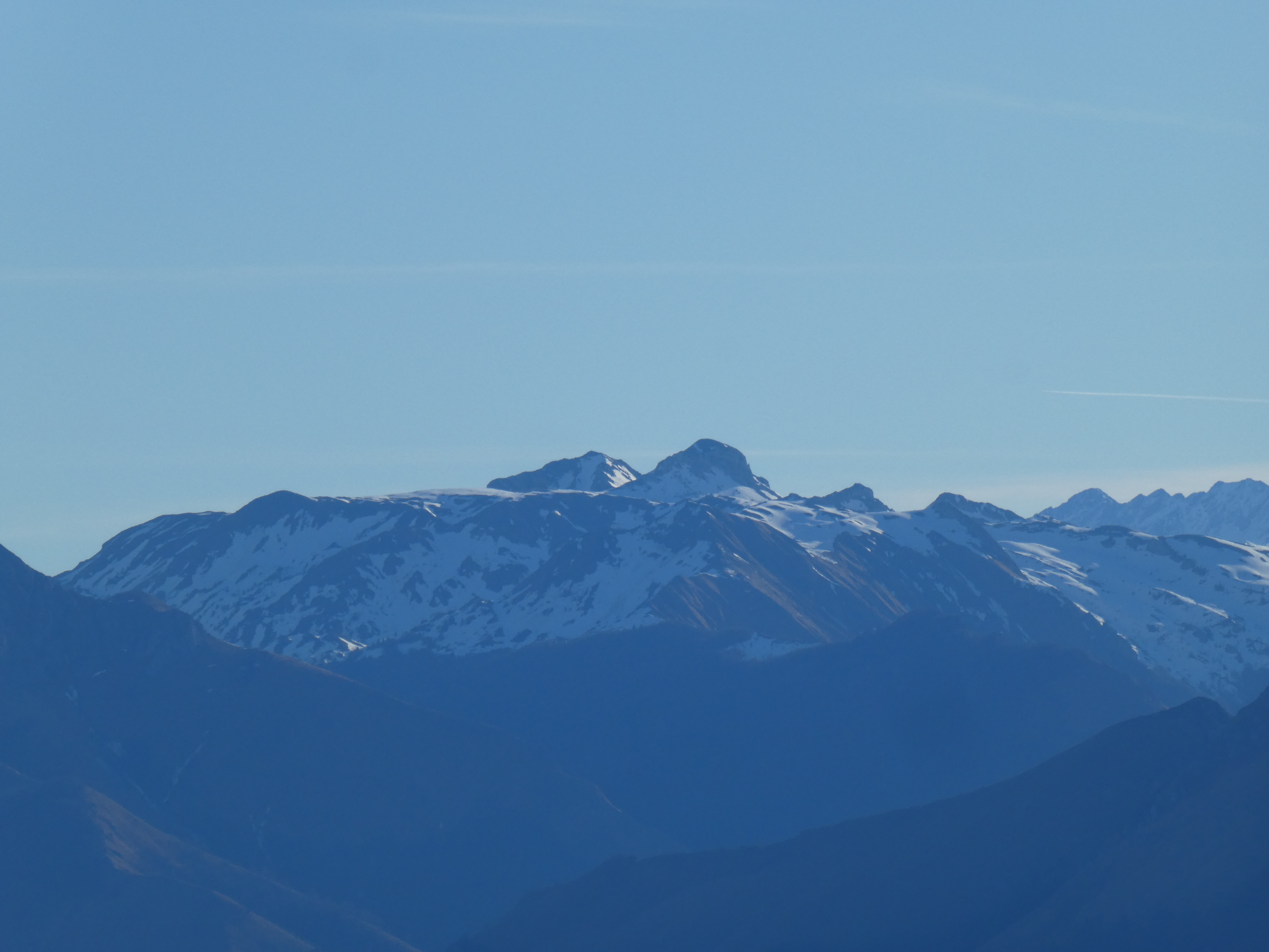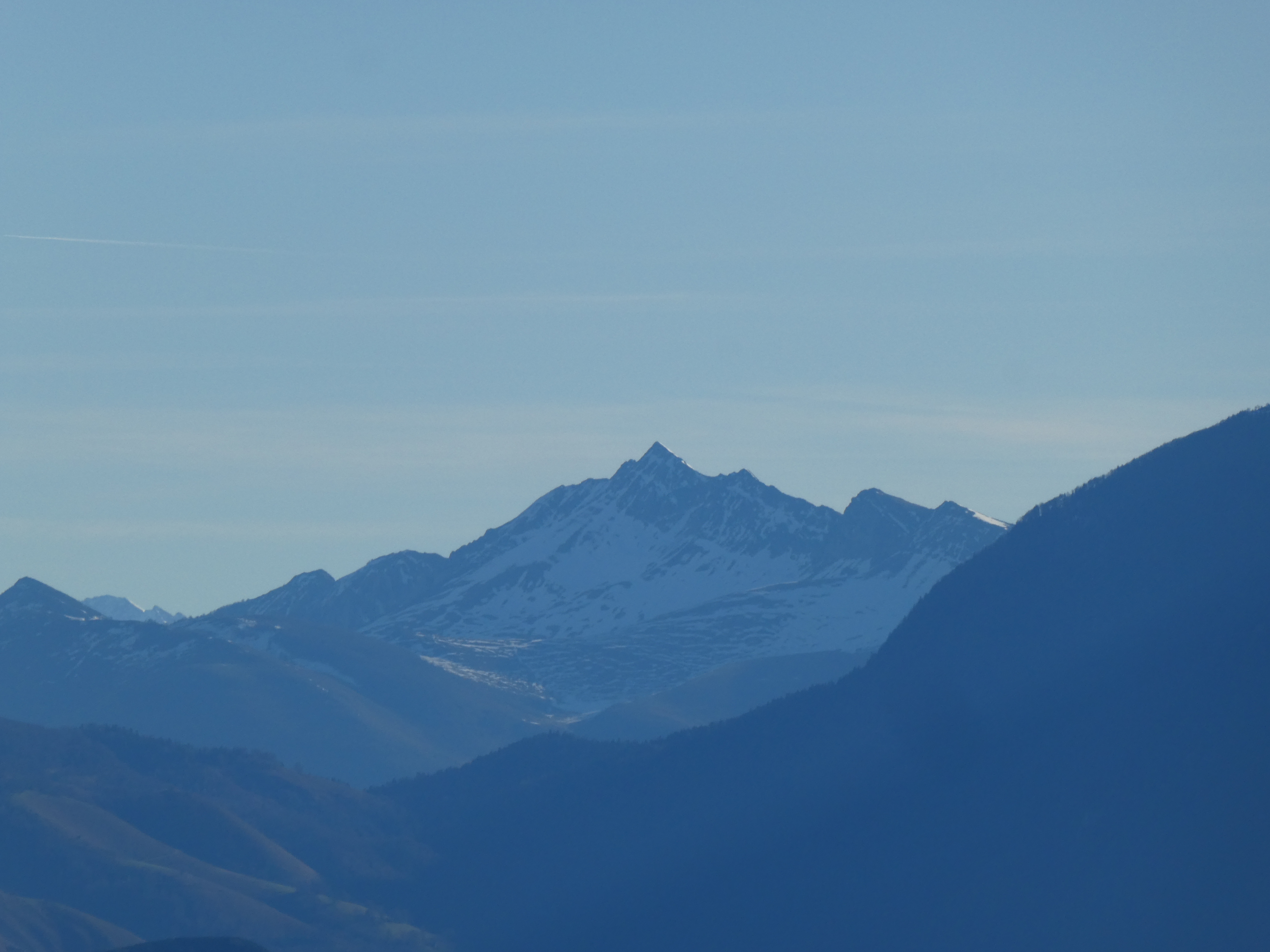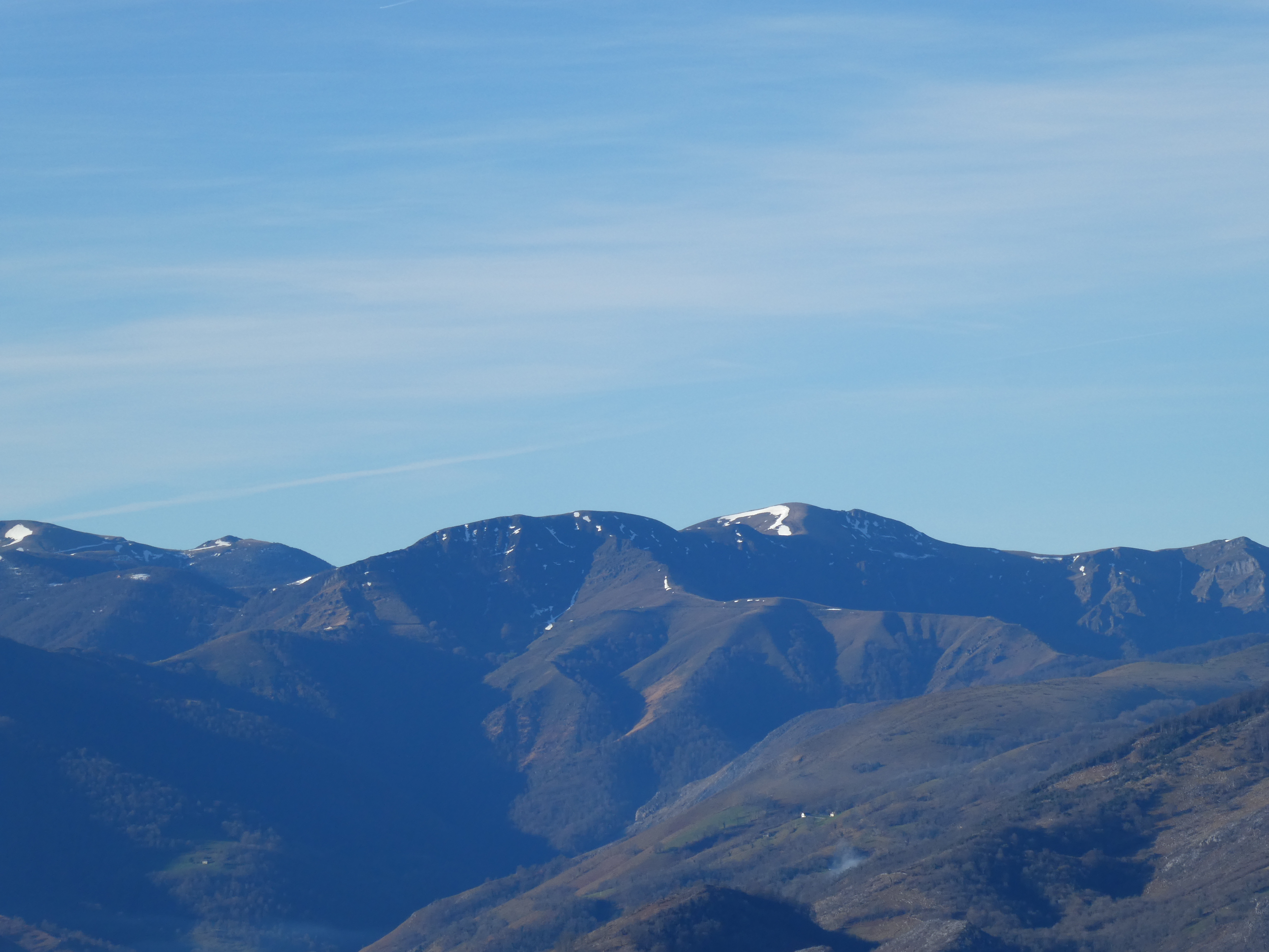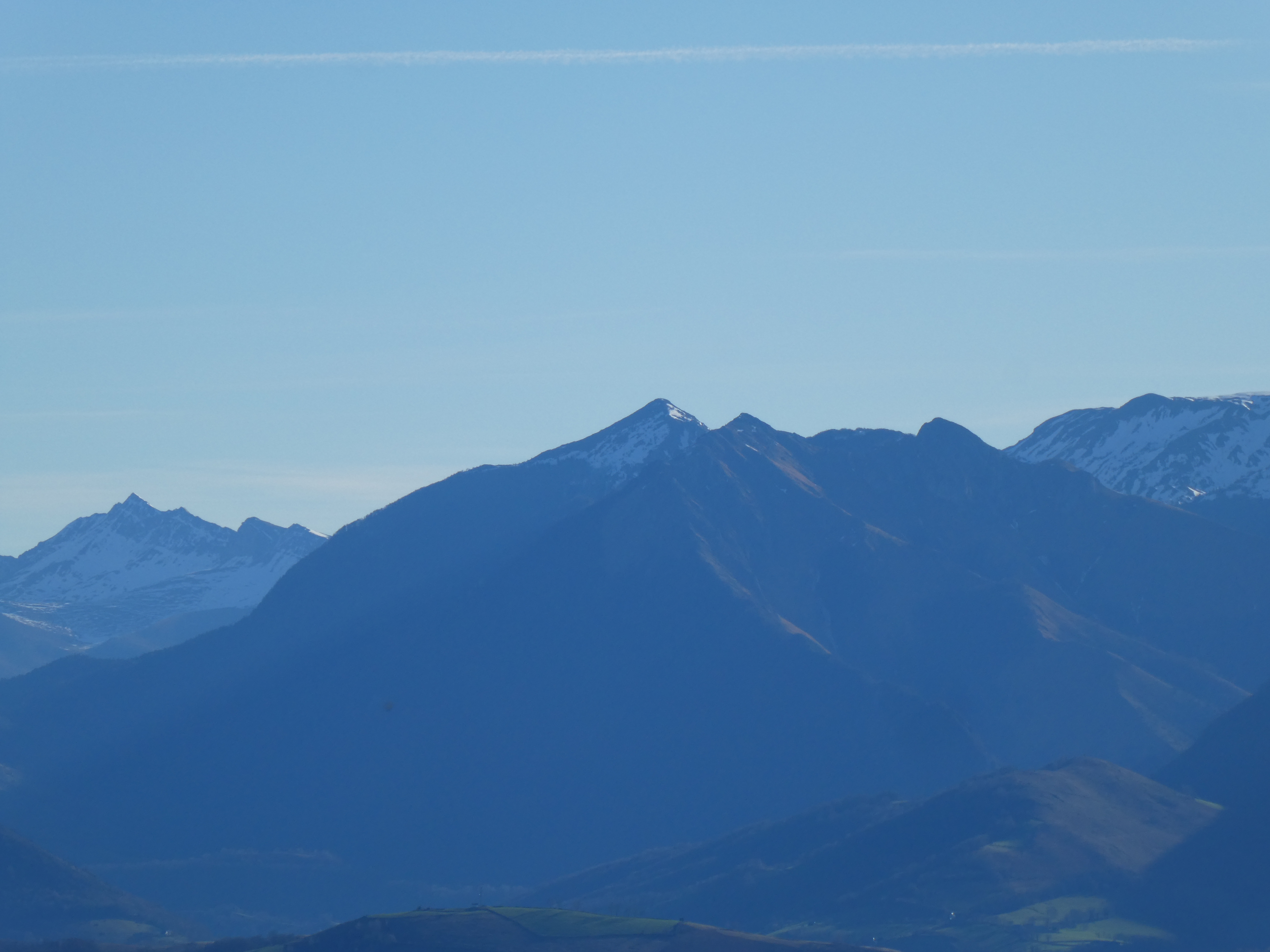 Zoom sur le Pic d'Escurets (1440 m) dominant le Piémont Oloronais ... on aperçoit également le Pic du Midi de Bigorre (2877 m) à droite situé à 83 kilomètres